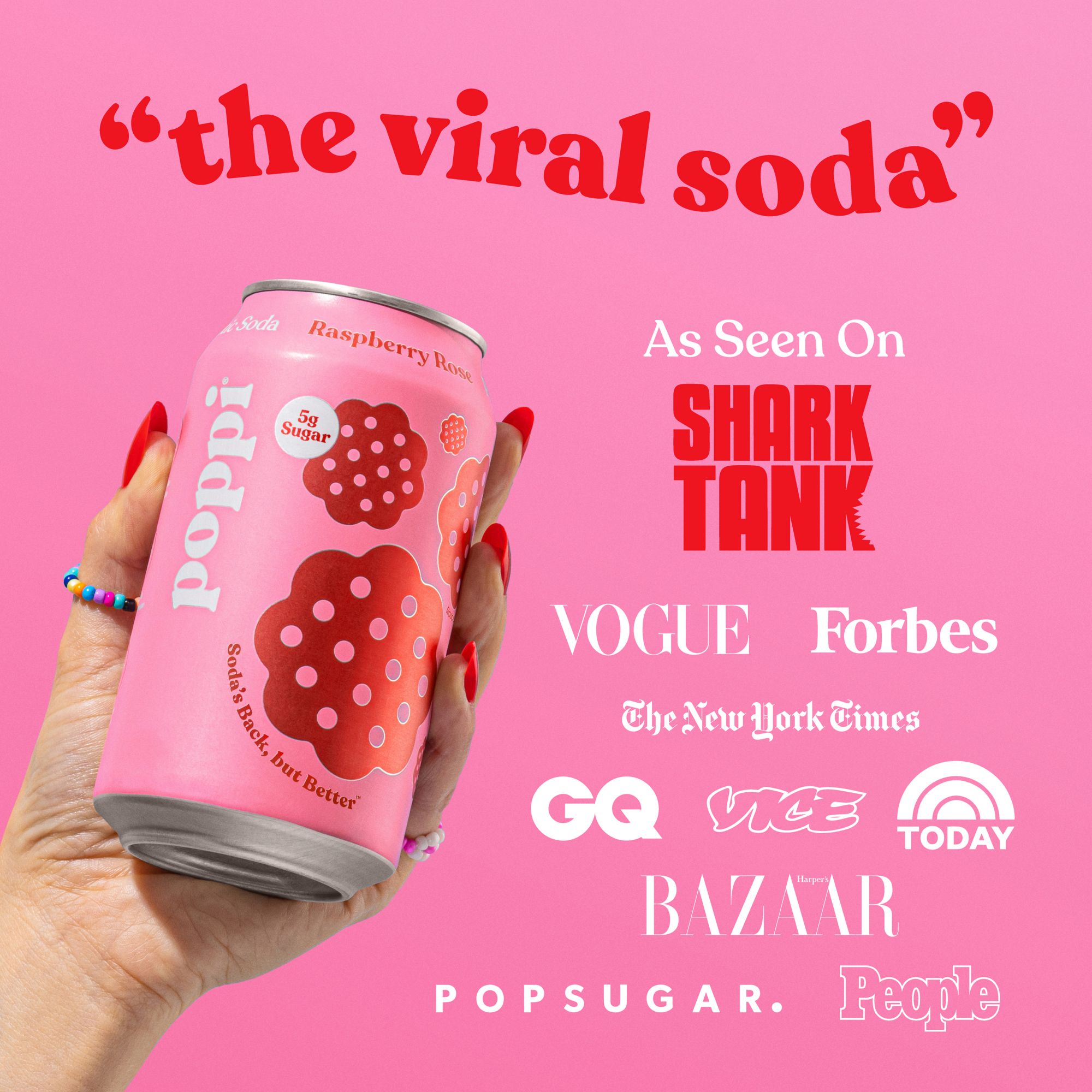 Founded by husband-and-wife duo Allison and Stephen Ellsworth and based in Austin, TX, Poppi combines 5g sugar, ingredients you can love, and prebiotics for a deliciously refreshing, full-of-flavor soda. With the help of an investment on Shark Tank, Poppi has gone from farmers’-market-favorite to shipping directly to your front door. Along the way, it's made new friends like Hailey Bieber, Post Malone, Kylie Jenner, Billie Eilish, Jennifer Lopez, Olivia Munn, and more!