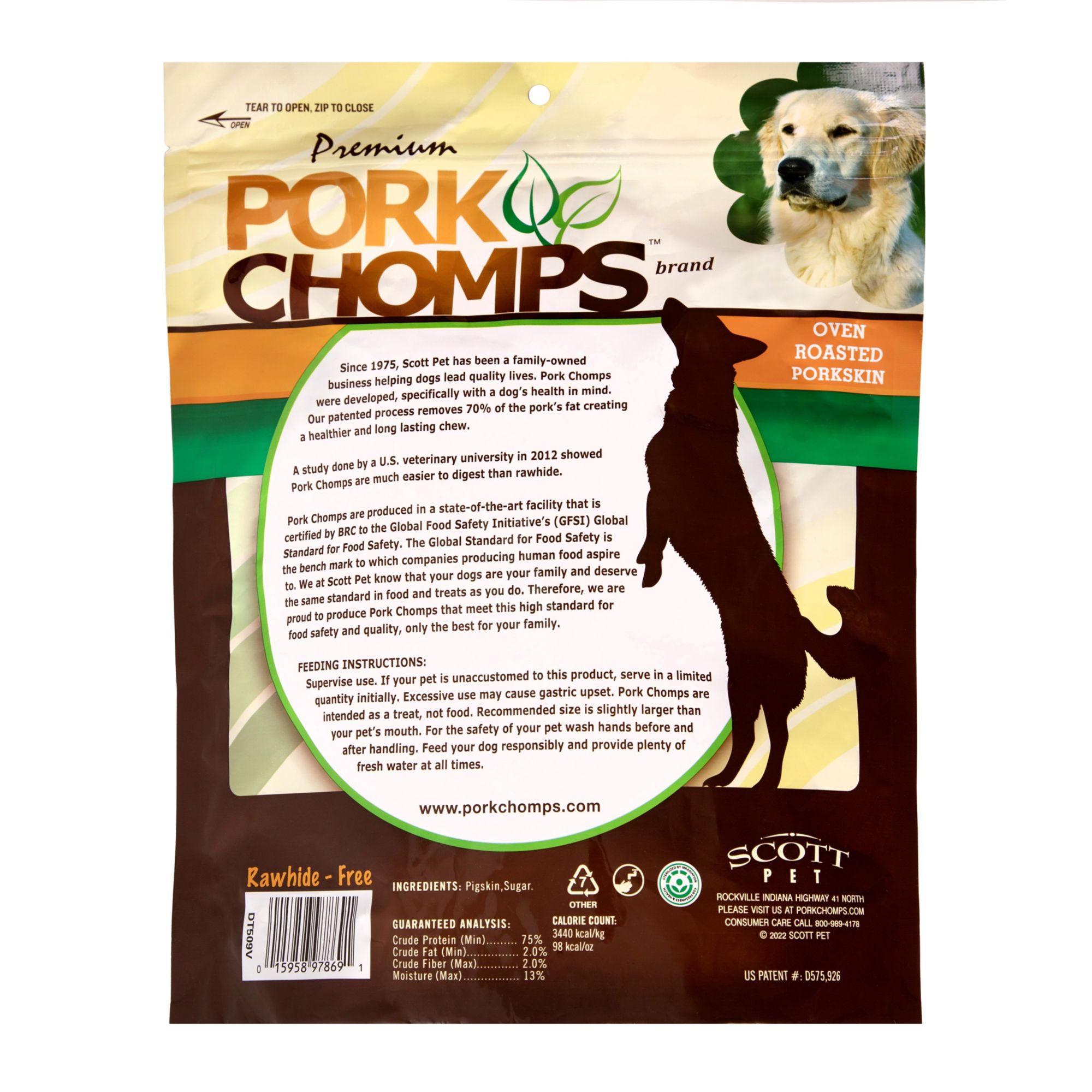 Pork Chomps Roasted Pig Ear-Shaped dog chews are 99.9% digestible and the perfect rawhide alternative for your pup! Pork Chomps are made from baked pork skin, creating a healthy, low-fat, high-protein dog chew. This wholesome chew is made with limited ingredients and no artificial flavors, dyes, or preservatives. Pork Chomps are a long-lasting 100% rawhide-free dog chew that will keep your dog busy and happy. Pork Chomps are the safe and healthy chew that dogs crave, and pet parents can feel good about, too! Resealable 10 ct. package.