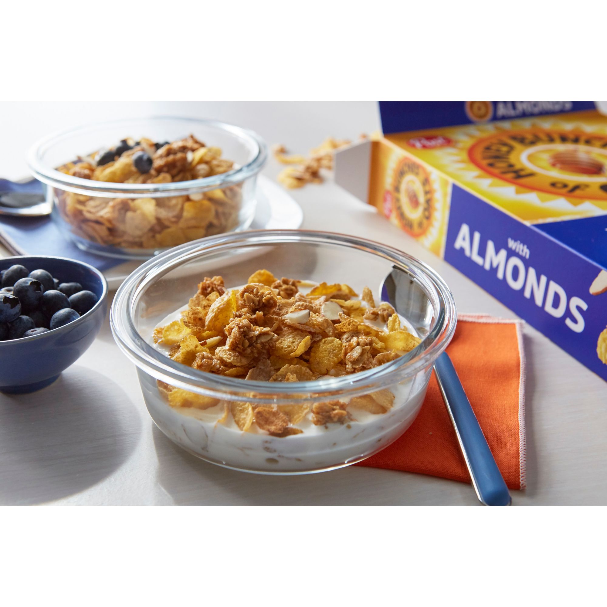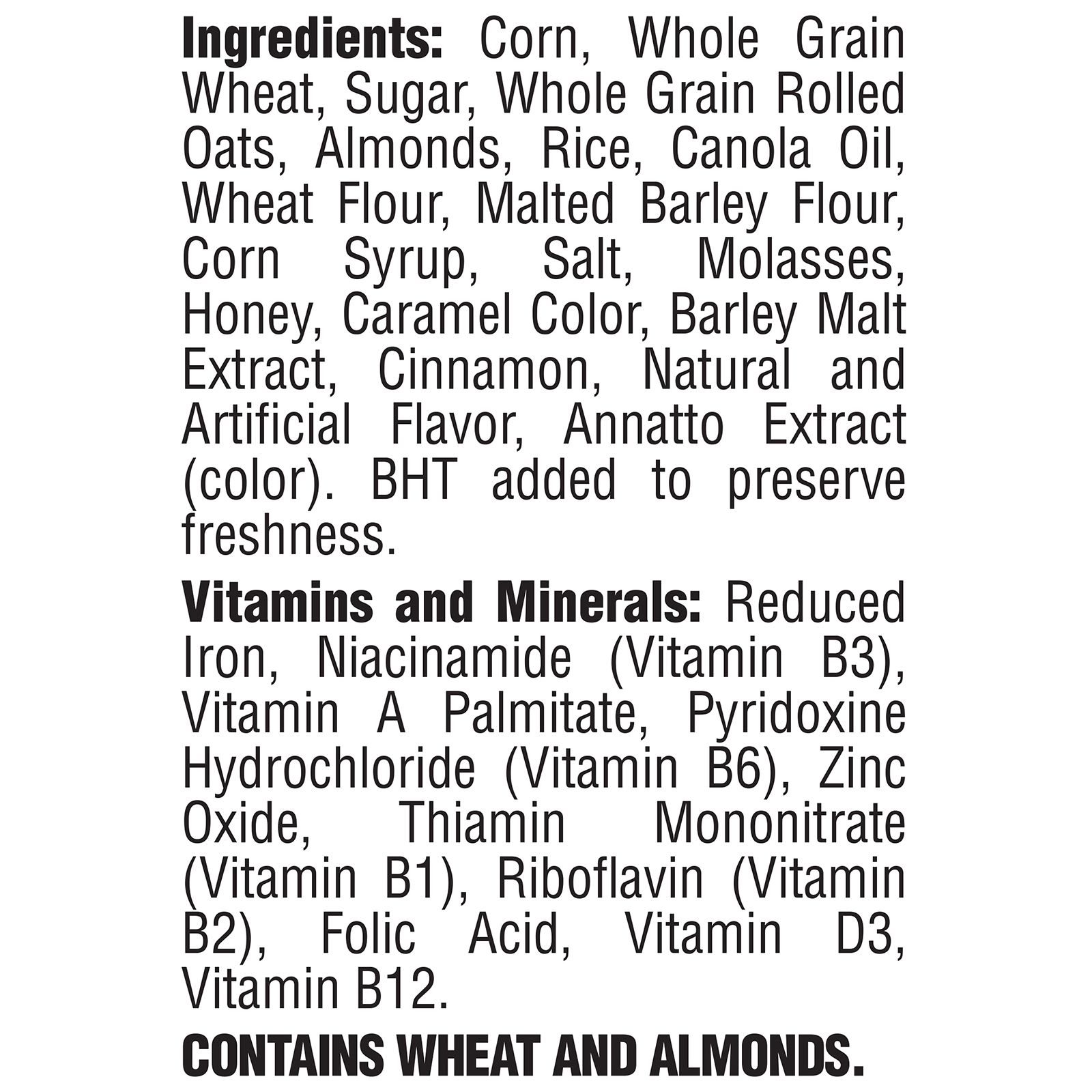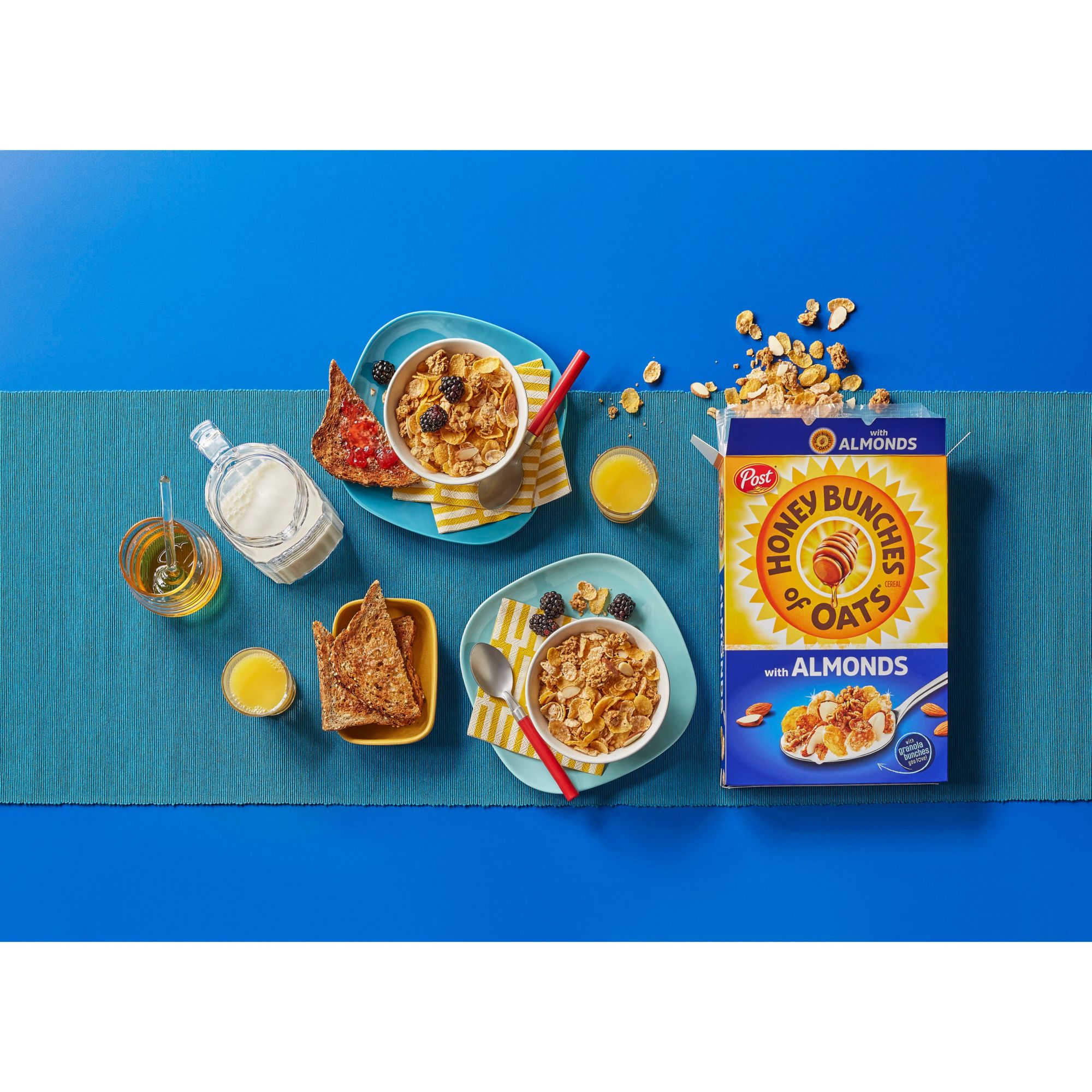 Honey Bunches of Oats is made with natural wildflower honey, real almonds and crunchy clusters of whole grain rolled oats. It contains 130 calories per serving (without milk) and 2g of dietary fiber. It provides nine essential vitamins and minerals, making it a great choice for breakfast. It's also free of trans fat and saturated fat and contains zero cholesterol. Good enough to turn almost anyone into a morning person, Honey Bunches of Oats is suitable for kids and adults. Each pack offers over 40 bowls inside, so there's plenty to share with the family. Savor the feel of sliced almonds and crispy cereal flakes. With its savory nutty twist, it's great as a meal or a snack. Enjoy your cereal plain, with milk, or a favorite almond or soy milk. Add some to a yogurt parfait for an added layer of crunch or use them to create some satisfying no-back cookies. They're also great for marshmallow bars, energy bites or as a topping on your favorite ice cream. It's beyond cereal.