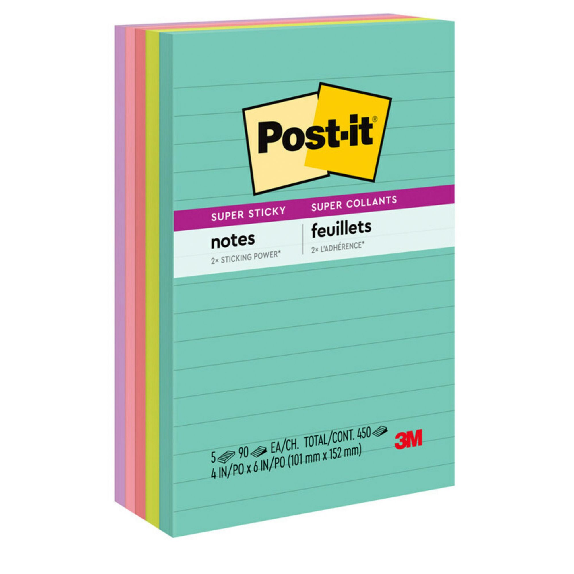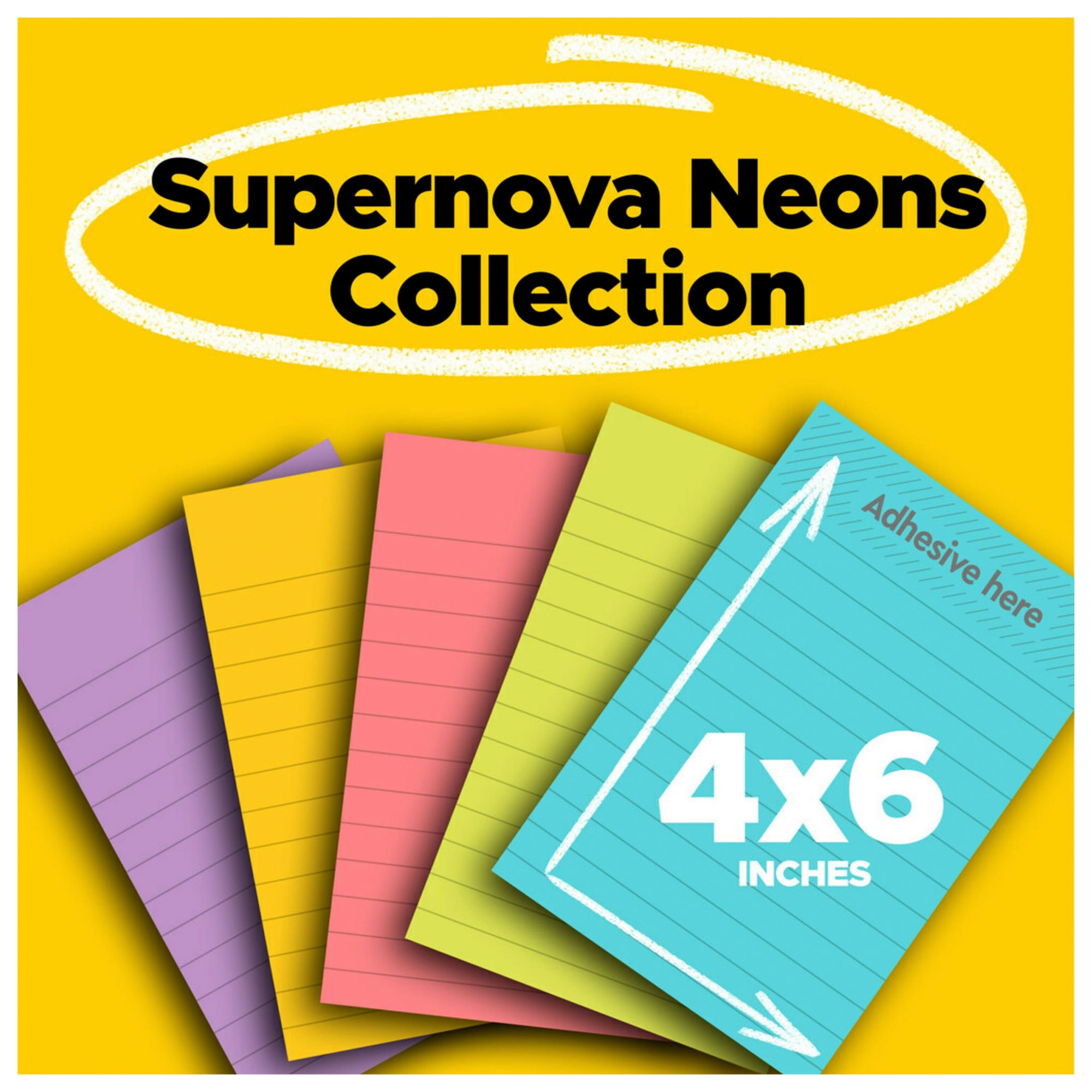 Post-it Super Sticky Notes, 4" x 6", Supernova Neons Collection, Lined