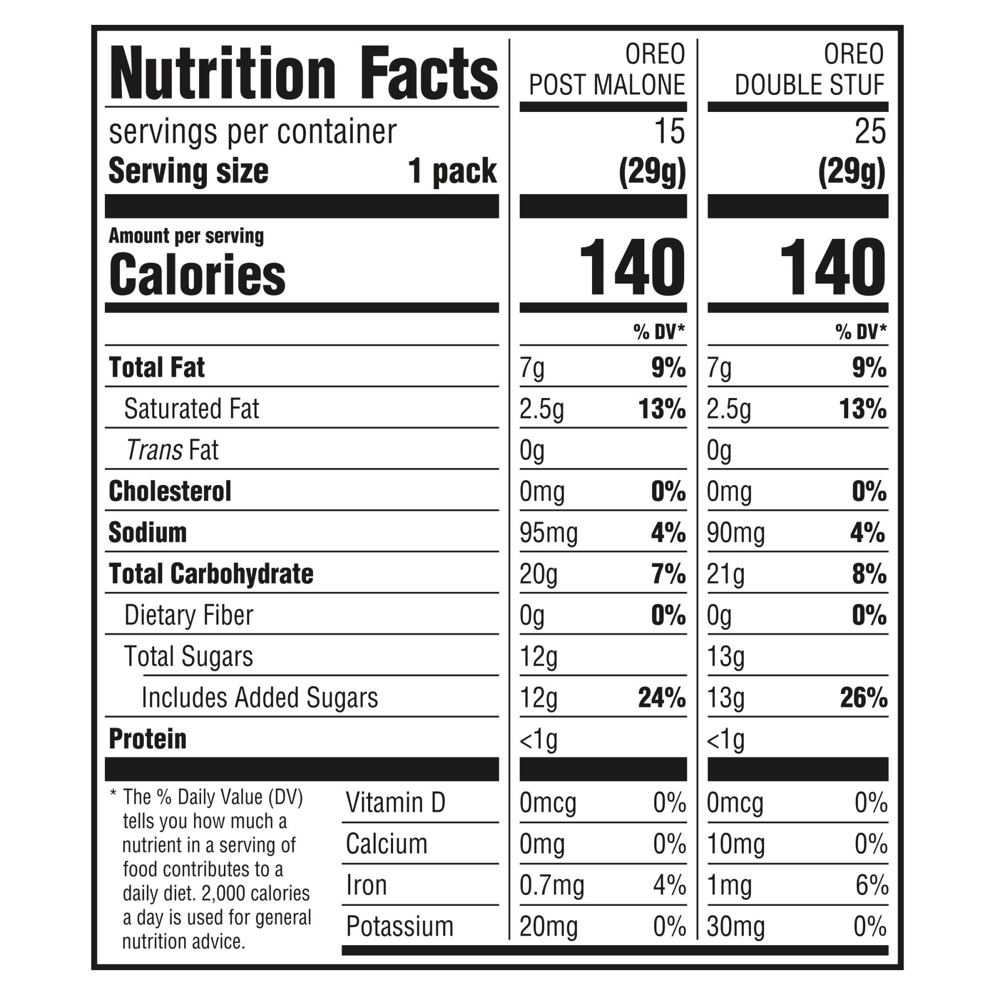 Ingredients: Oreo Post Malone Ingredients: Sugar, Unbleached Enriched Flour (Wheat Flour, Niacin, Reduced Iron, Thiamine Mononitrate [Vitamin B1], Riboflavin [Vitamin B2], Folic Acid), Palm Oil, Soybean And/or Canola Oil, Cornstarch, High Fructose Corn Syrup, Cocoa (Processed With Alkali), Salt, Baking Soda, Soy Lecithin, Natural And Artificial Flavor, Yellow 5 Lake, Red 40 Lake, Blue 1 Lake, Chocolate, Confectioner's Glaze, Caramel Color, Carnauba Wax. Contains: Wheat, Soy. Oreo Double Stuf Ingredients: Sugar, Unbleached Enriched Flour (Wheat Flour, Niacin, Reduced Iron, Thiamine Mononitrate [Vitamin B1], Riboflavin [Vitamin B2], Folic Acid), Palm Oil, Soybean And/or Canola Oil, Cocoa (Processed With Alkali), High Fructose Corn Syrup, Leavening (Baking Soda And/or Calcium Phosphate), Salt, Soy Lecithin, Chocolate, Artificial Flavor. Contains: Wheat, Soy.