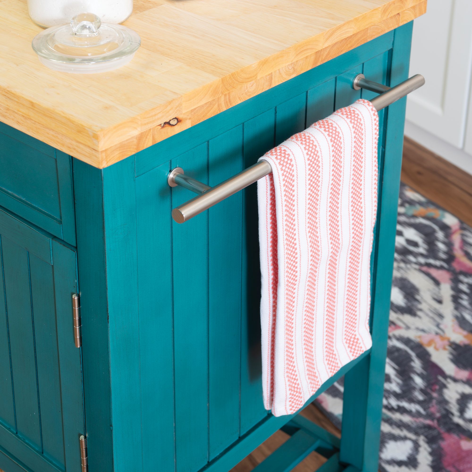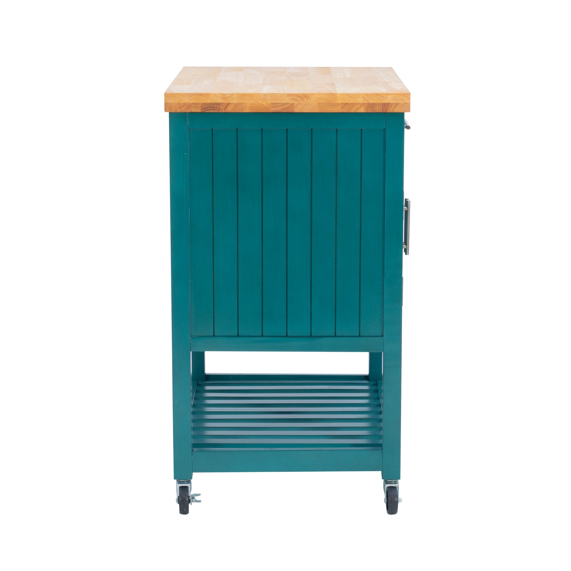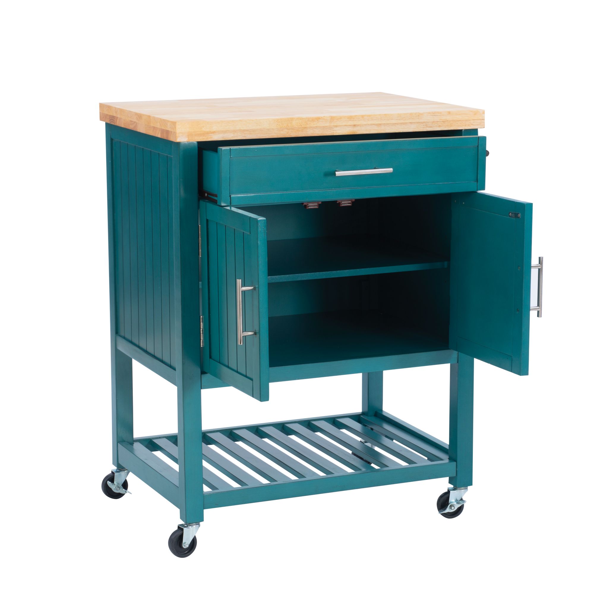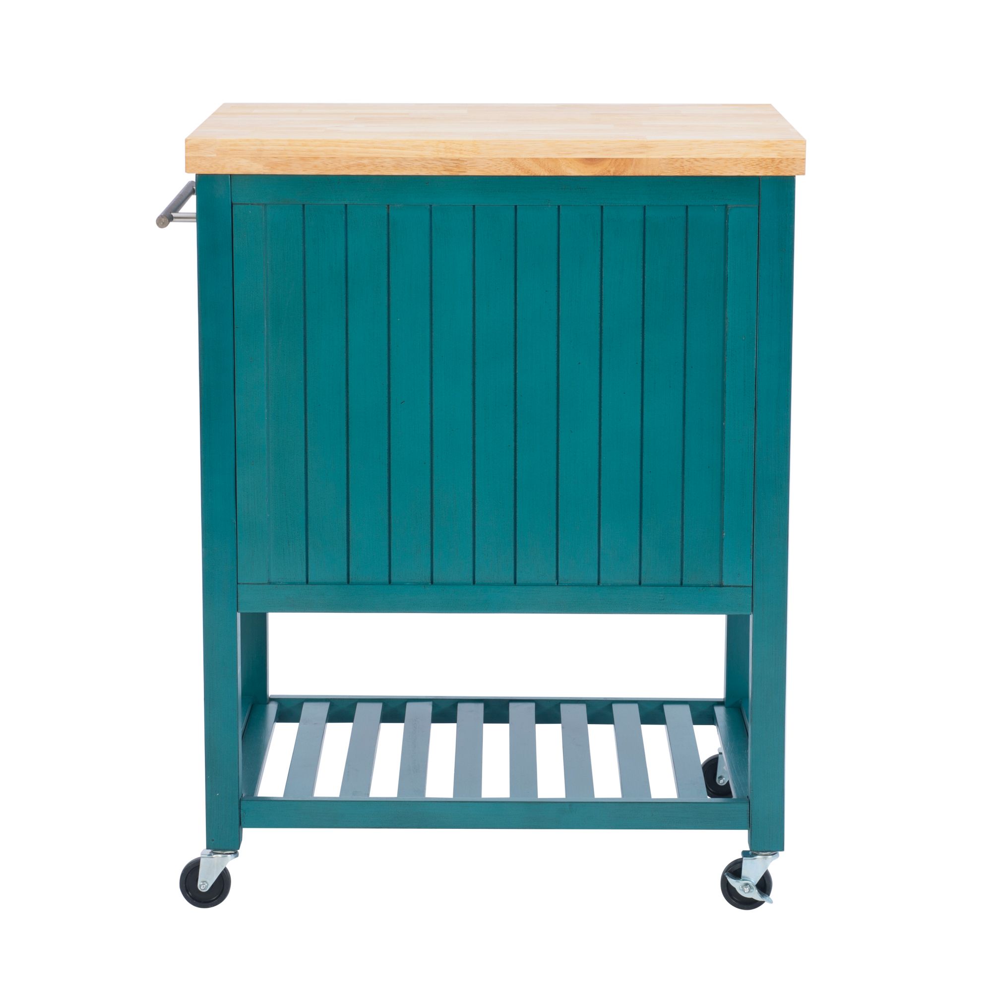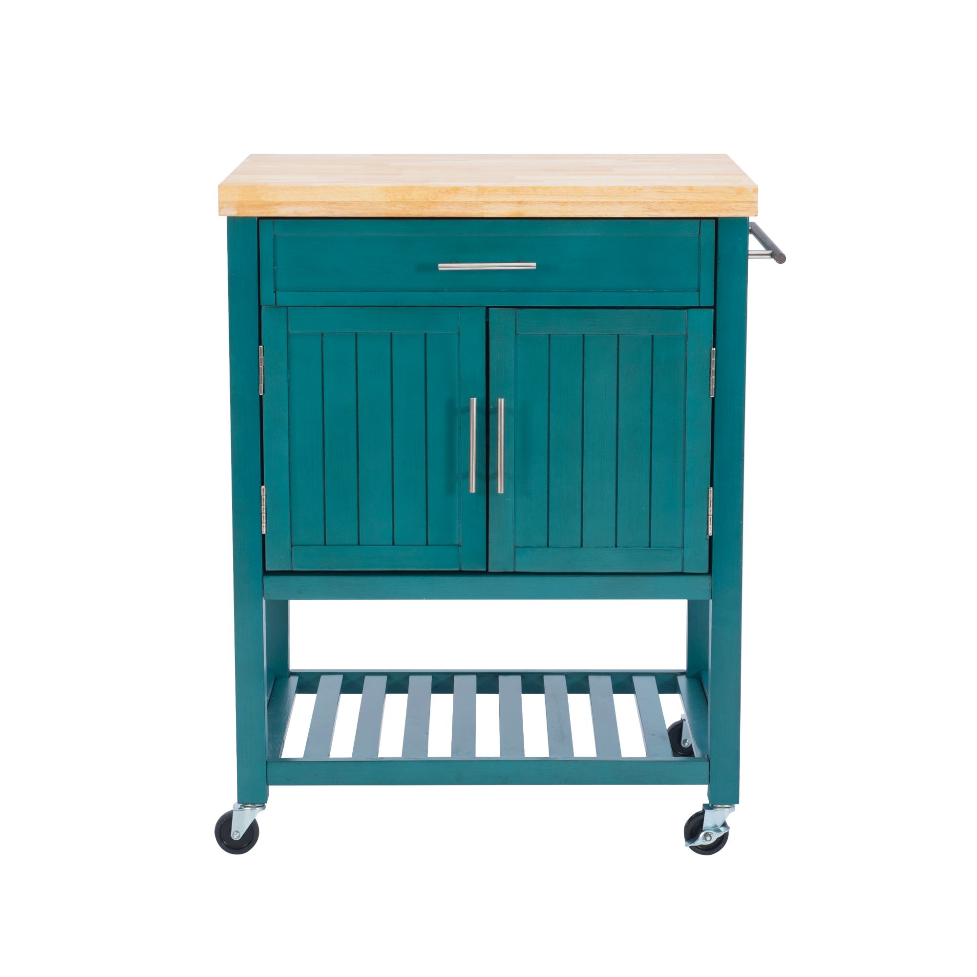 Solid wood construction with a teal finish Wide drawer, cabinet with a fixed shelf and open-plank bottom shelf for storage Thick, butcher-block top allows food prep Spacious towel bar Assembly required Includes kitchen cart, instructions for assembly. Warranty: 6 months