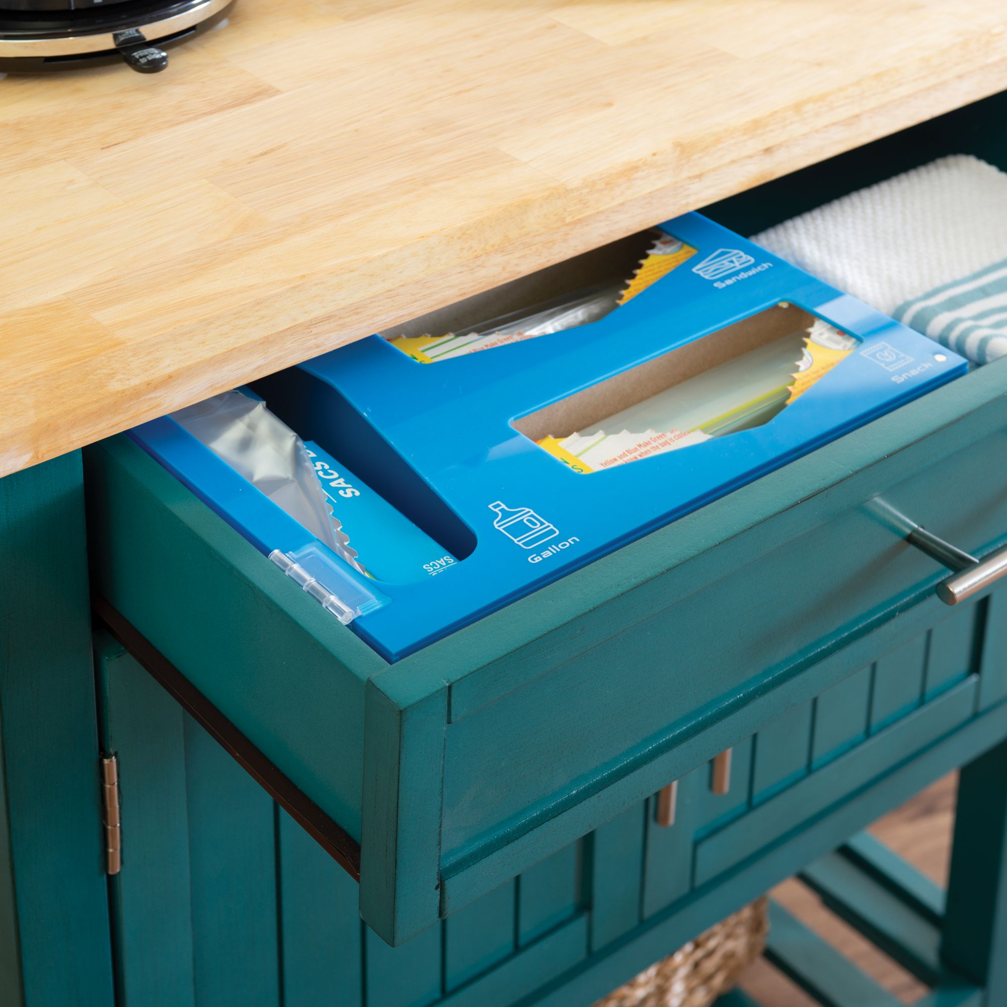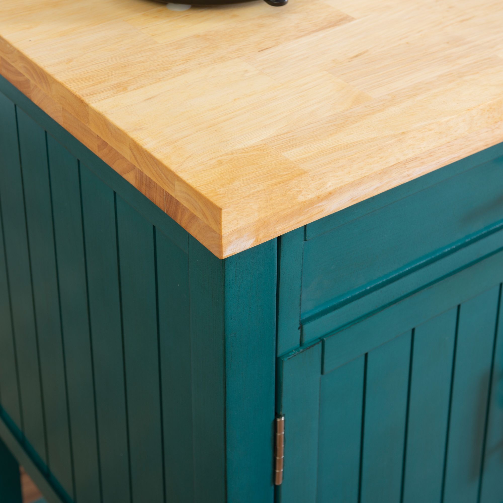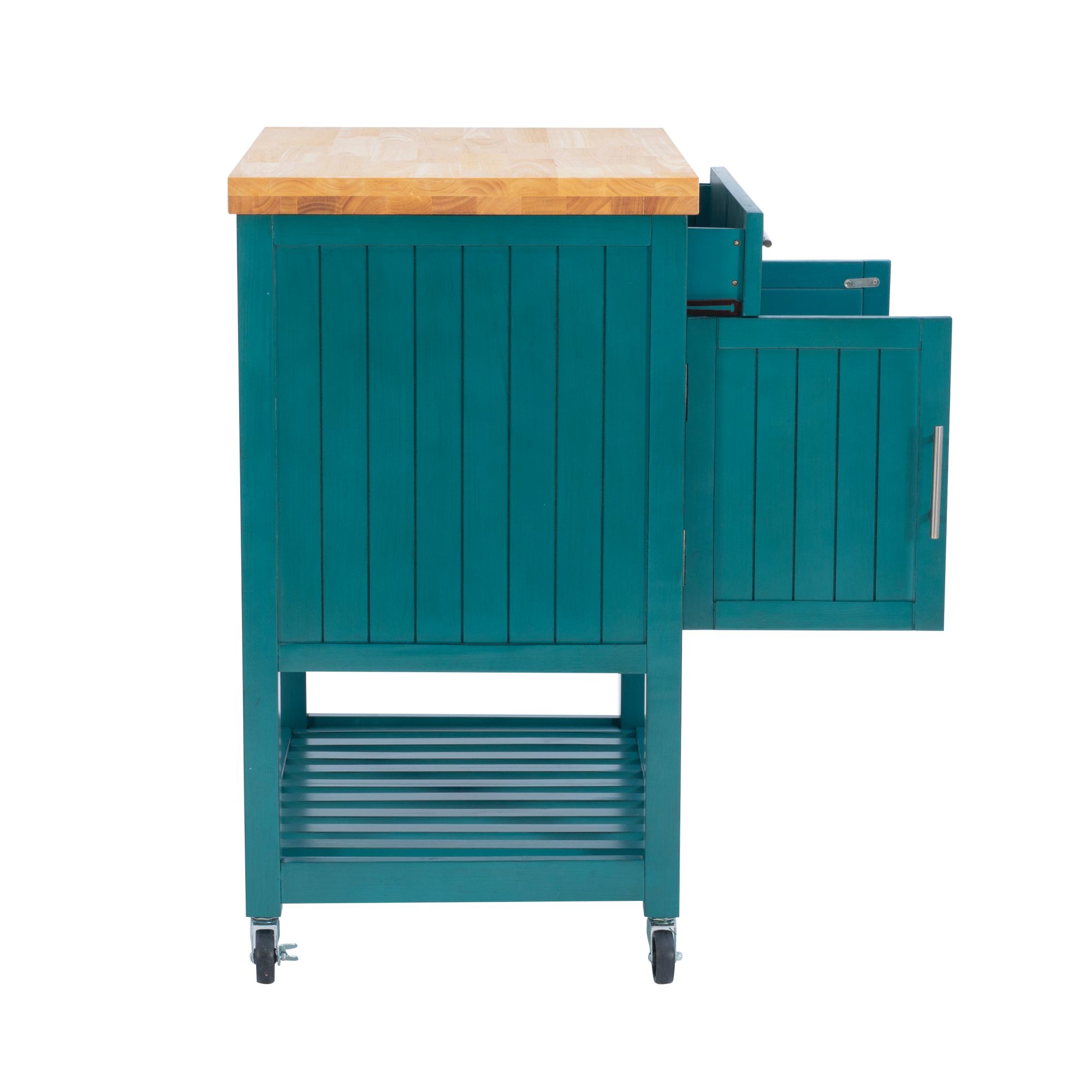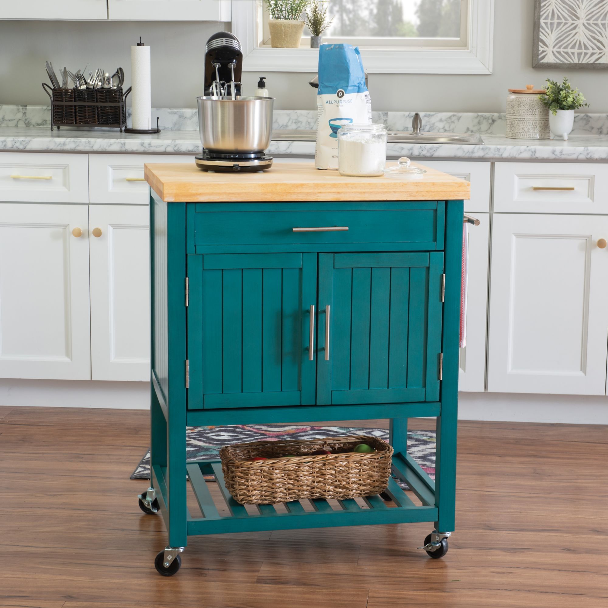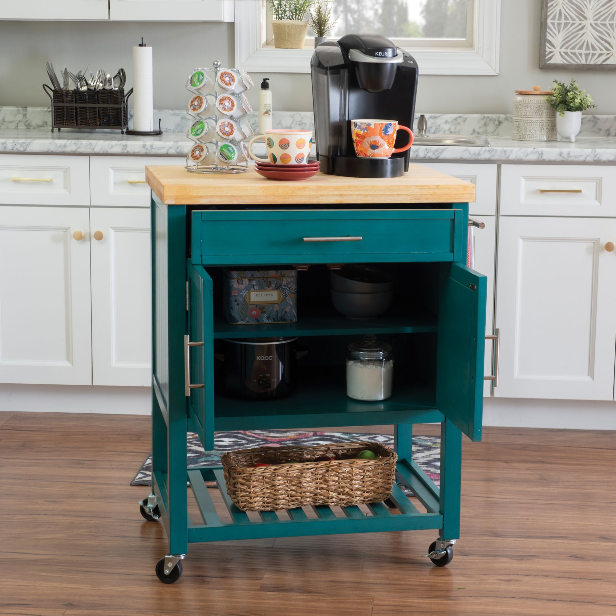 Solid wood construction with a teal finish Wide drawer, cabinet with a fixed shelf and open-plank bottom shelf for storage Thick, butcher-block top allows food prep Spacious towel bar Assembly required Includes kitchen cart, instructions for assembly. Warranty: 6 months