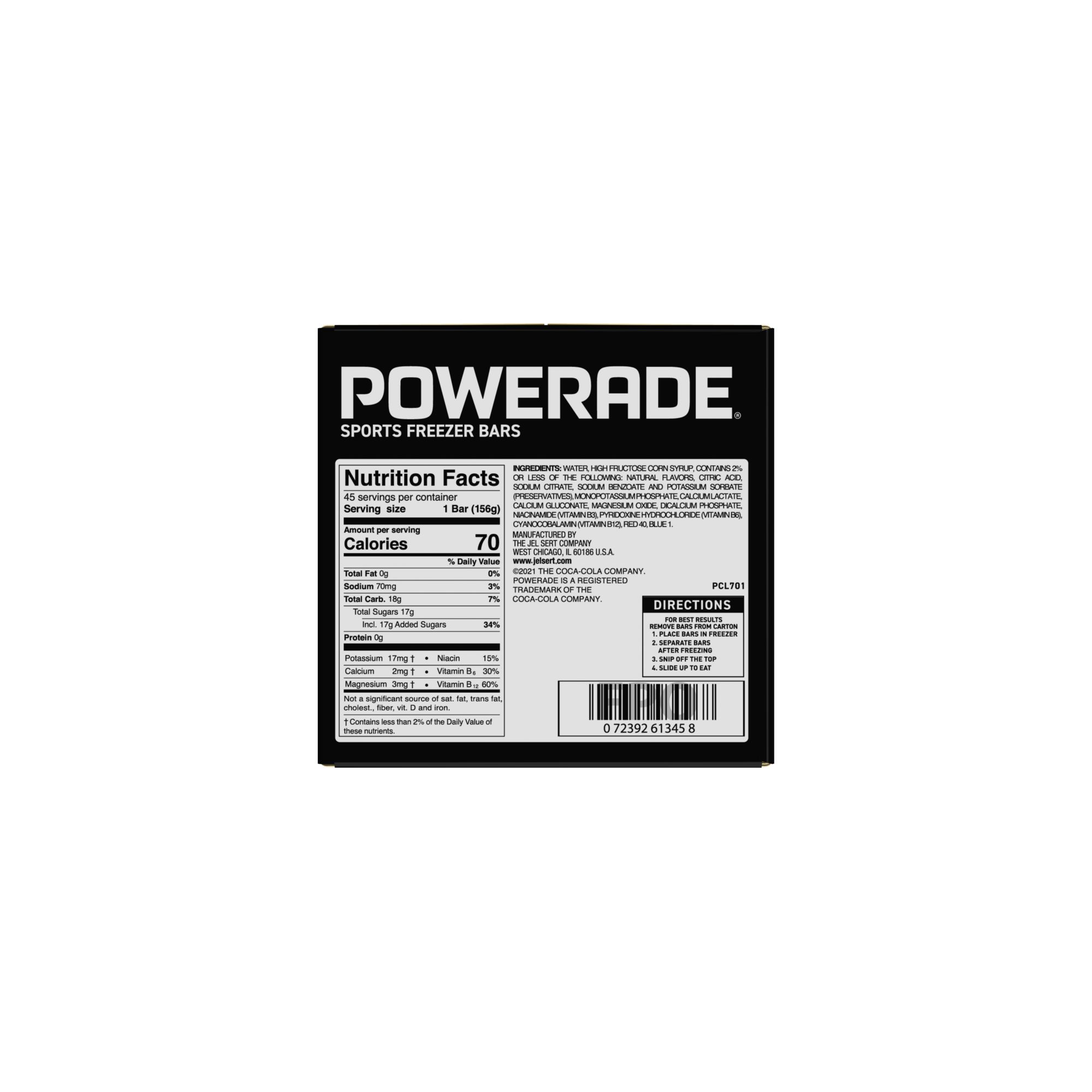 The future of electrolytes is here with the frozen Powerade Sports Freezer Bars. When frozen, these frozen bars match the electrolyte levels of ready-to-drink Powerade on a per ounce basis.Formulated with ION4 Advanced Electrolyte System and B Vitamins, Powerade Sports Freezer Bars help replenish electrolytes that are lost in sweat. The frozen format of Powerade Sports Freezer Bars is the perfect way to refuel after playing sports, exercising or enjoying outdoor activities so you can keep going strong.
