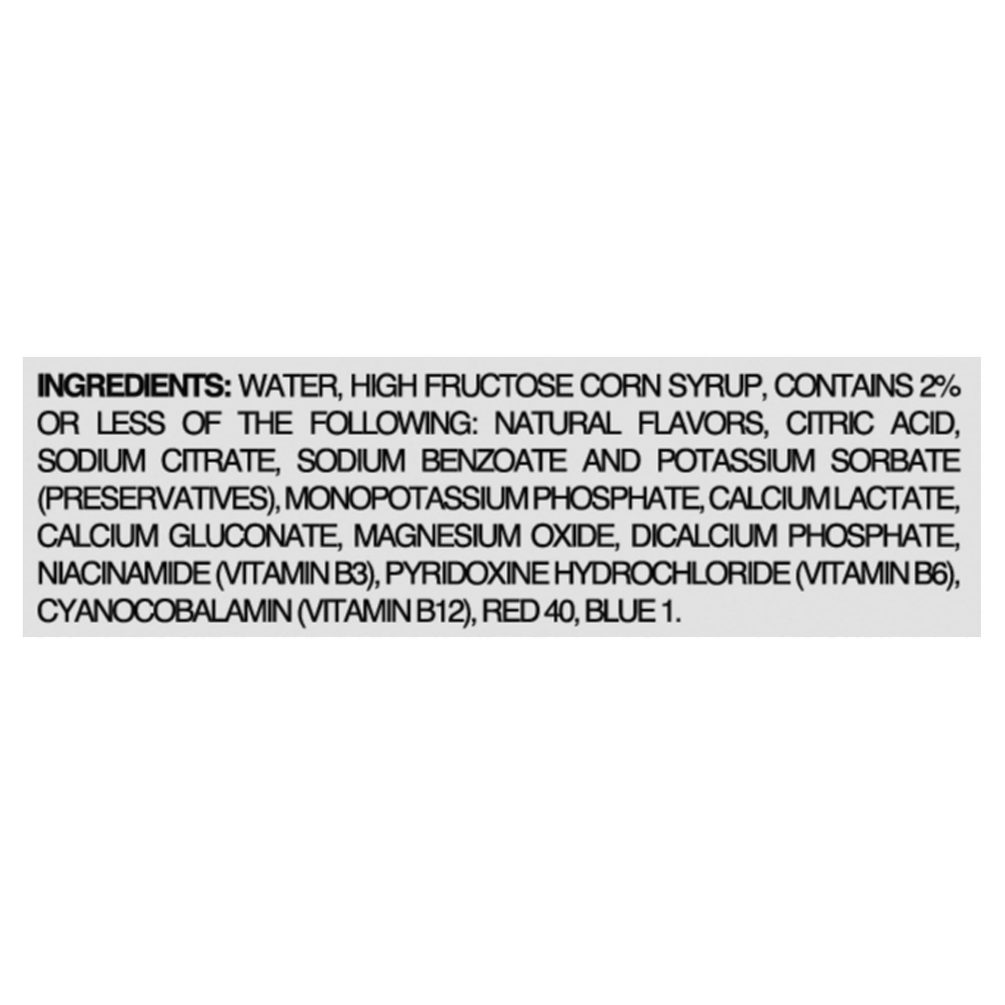 Ingredients: Water, High Fructose Corn Syrup, contains 2% or less of the following: Natural Flavors, Citric Acid, Sodium Citrate, Sodium Benzoate and potassium sorbate (preservatives), Monopotassiumphosphate, Calciumlactate, Calcium Gluconate, Magnesium Oxide, Dicalcium Phosphate, Niacinamide (Vitamin B3), Pyridoxine Hydrochloride (Vitamin B6), Cyanocobalamin (Vitamin B12), Red 40, Blue 1