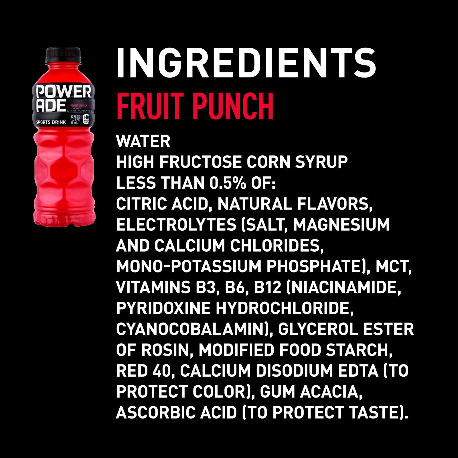Ingredients: Fruit Punch Ingredients: Water, High Fructose Corn Syrup, Less Than 0.5% Of: Citric Acid, Electrolytes (Salt, Sodium Citrate, Magnesium And Calcium Chlorides), Mono-potassium Phosphate, Vitamins B12 And C (Cyanocobalamin And Ascorbic Acid), Natural Flavors, Medium Chain Triglycerides, Modified Food Starch, Glycerol Ester Of Rosin, Calcium Disodium Edta (To Protect Color), Red 40. Mountain Berry Blast Ingredients: Water, High Fructose Corn Syrup, Less Than 0.5% Of: Citric Acid, Electrolytes (Salt, Sodium Citrate, Magnesium And Calcium Chlorides), Mono-potassium Phosphate, Vitamins B12 And C (Cyanocobalamin And Ascorbic Acid), Natural Flavors, Modified Food Starch, Calcium Disodium Edta (To Protect Color), Medium Chain Triglycerides, Sucrose Acetate Isobutyrate, Blue 1. Grape Ingredients: Water, High Fructose Corn Syrup, Less Than 0.5% Of: Citric Acid, Electrolytes (Salt, Sodium Citrate, Magnesium And Calcium Chlorides), Mono-potassium Phosphate, Natural And Artificial Flavors, Vitamins B12 And C (Cyanocobalamin And Ascorbic Acid), Calcium Disodium Edta (To Protect Color), Red 40, Blue 1.