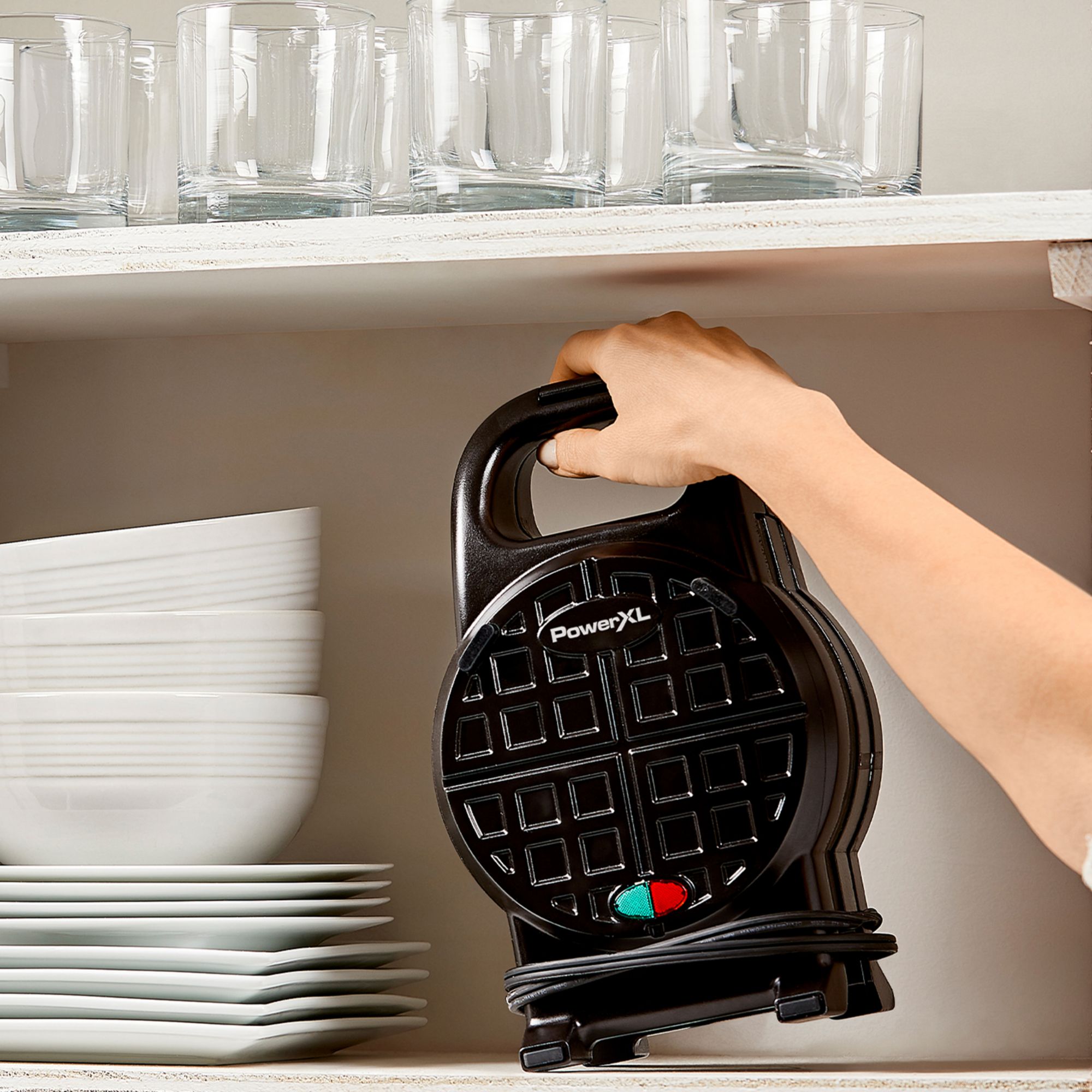 Choose your favorite combinations of sweet or savory batter, fillings, and flavors to make delicious, golden-crispy waffle meals, snacks, treats, and desserts in just a few simple steps on your kitchen countertop. From sweet apple pie waffles made with puff pastry dough to crispy pizza waffles made with your favorite toppings and pizza dough or nutritious breakfast egg waffles made with gluten-free batter, it’s easier than ever to customize your waffle for a variety of tastes and dietary preferences. This compact waffle maker is countertop ready and easy to use: Simply plug it in and wait for the indicator lights to alert you when it’s time to add your ingredients. Your waffles cook evenly with a crisp, golden finish, and release smoothly without sticking. Includes PowerXL test-kitchen recipe book with easy-to-follow instructions for fun and delicious waffles.