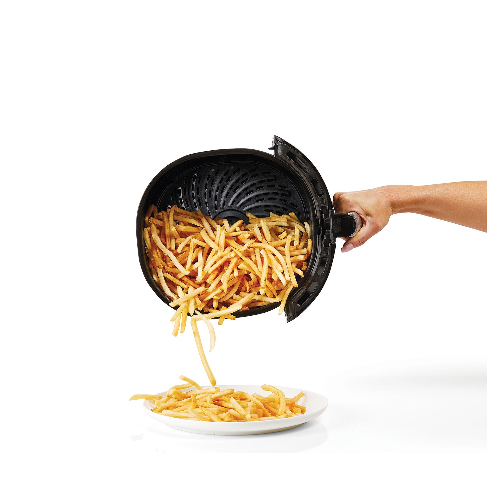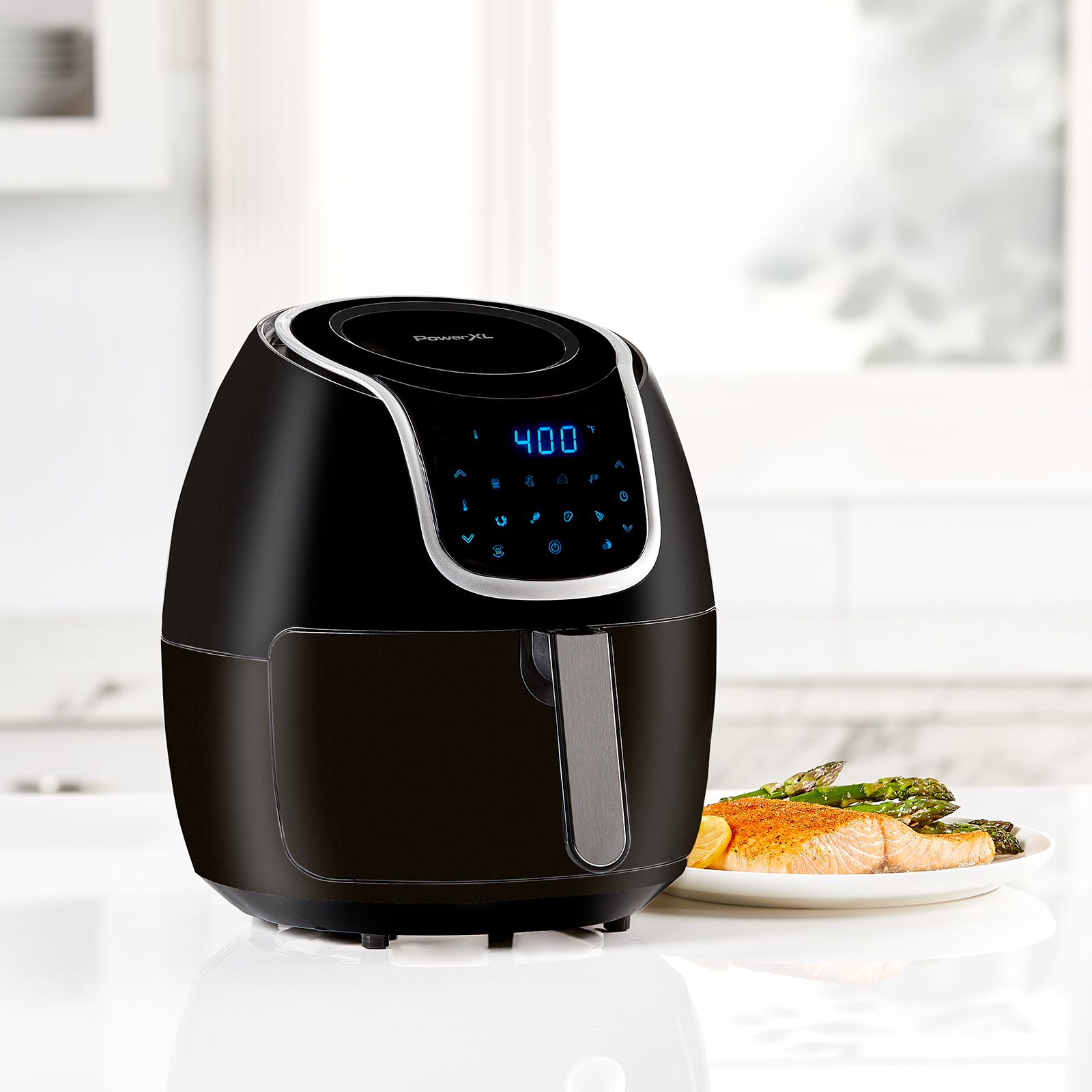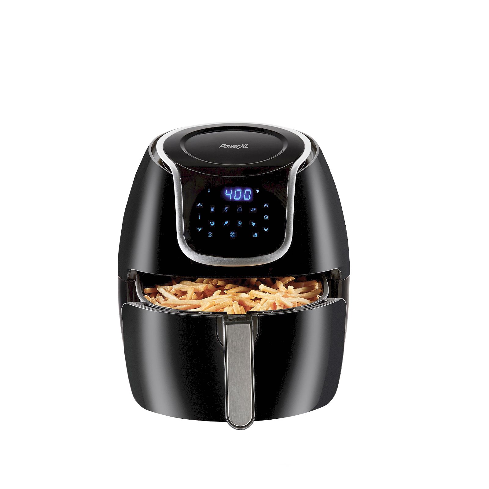 Cooks food in a whirlwind vortex for extra crisp and crunch 6-in-1 multi-use design: Air Fryer, Dehydrator, Pizza Oven, Baking Oven, Roaster, and Reheat Up to 70% fewer calories from fat vs. deep frying Digital easy-to-use panel with 10 one-touch pre-set functions Precise temperature control Even cooking for all-over crisp XL easy-grip handle Dishwasher safe parts Timer with auto shutoff Includes Power AirFryer 7-qt. XL Air Fryer Oven, instruction manual