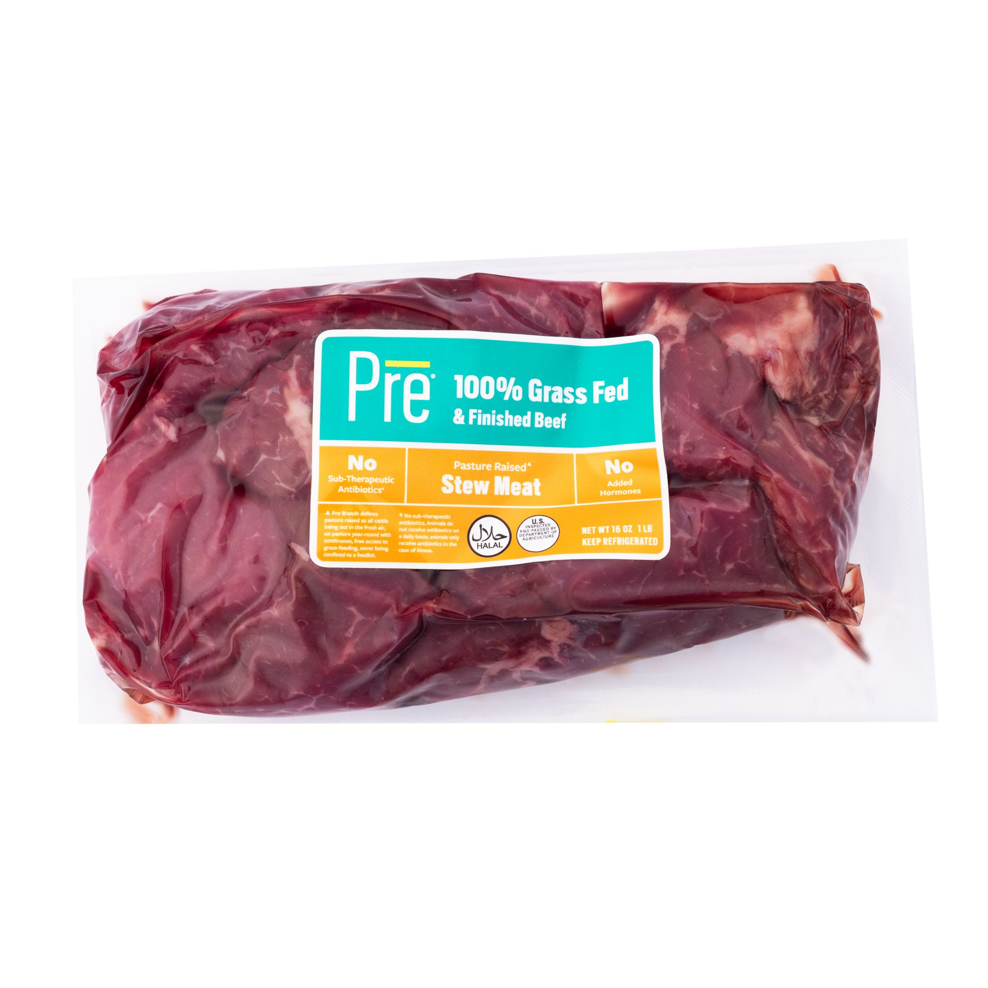 A bold choice and taste to match! Pre Brands Stew Meat is 100% Grass Fed and Finished, Non-GMO Project Verified, Whole30 Approved, Certified Paleo, Keto Certified, and Halal Compliant. All Pre beef is sourced from New Zealand and Australia where cattle are raised outdoors on pasture year-round for their entire lifespan. At Pre, they're deeply in love with the details that go into great tasting food. That's why they have the same high standards as you when choosing the right beef. They curate Pre beef within a strict 15-point system to ensure quality so you can be confident you will love every bite. They are proud to work with farmers who practice 100% grass-feeding and finishing, that never use grains, feedlots, GMO’s, added growth hormones or added antibiotics. This results in high-quality tasty, beef. Pre tastes distinctly different than other grass fed and finished beef brands. This is attributed to the diet and holistic treatment of the animal during its entire lifespan. They curate Pre beef using a 15-point quality check system including source, breed, diet, taste, tenderness, quality, marbling, color, size and weight, ossification score, pH range and more. In transparent, vacuum-sealed packaging, Pre Grass Fed and Finished Stew Meat shows you how flavorful and tender hand-trimmed beef should be. Go ahead: marinate it, rub it with your seasoning blend, smoke it on a smoker, bake it, or even put it in the crock pot. You can't go wrong with Pre.