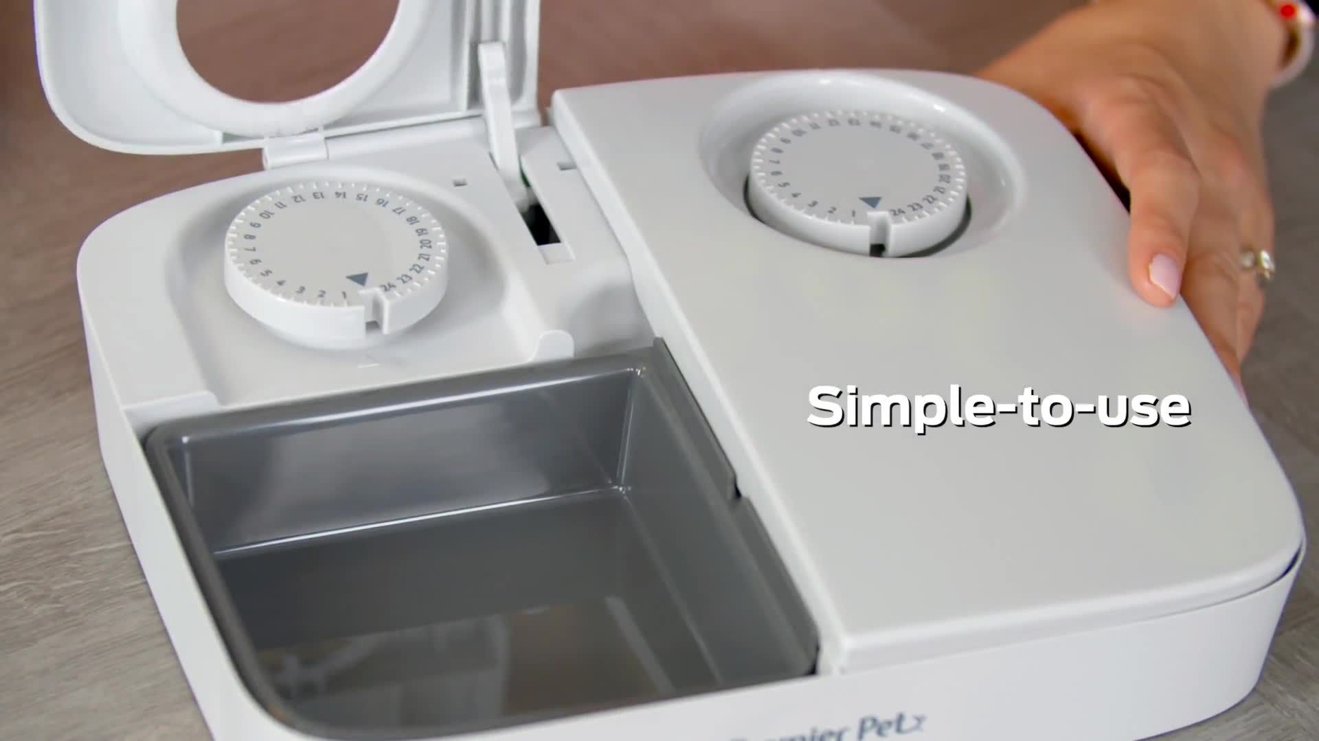 Feeds two meals within a 24-hour period Holds up to one and a half cups of dry food per meal (three cups capacity) Adjustable portion control Simple-to-use timer design with quiet lid function BPA free, dishwasher safe tray Requires 1 AA alkaline battery (not included) For Indoor use only One-year non-transferable limited warranty