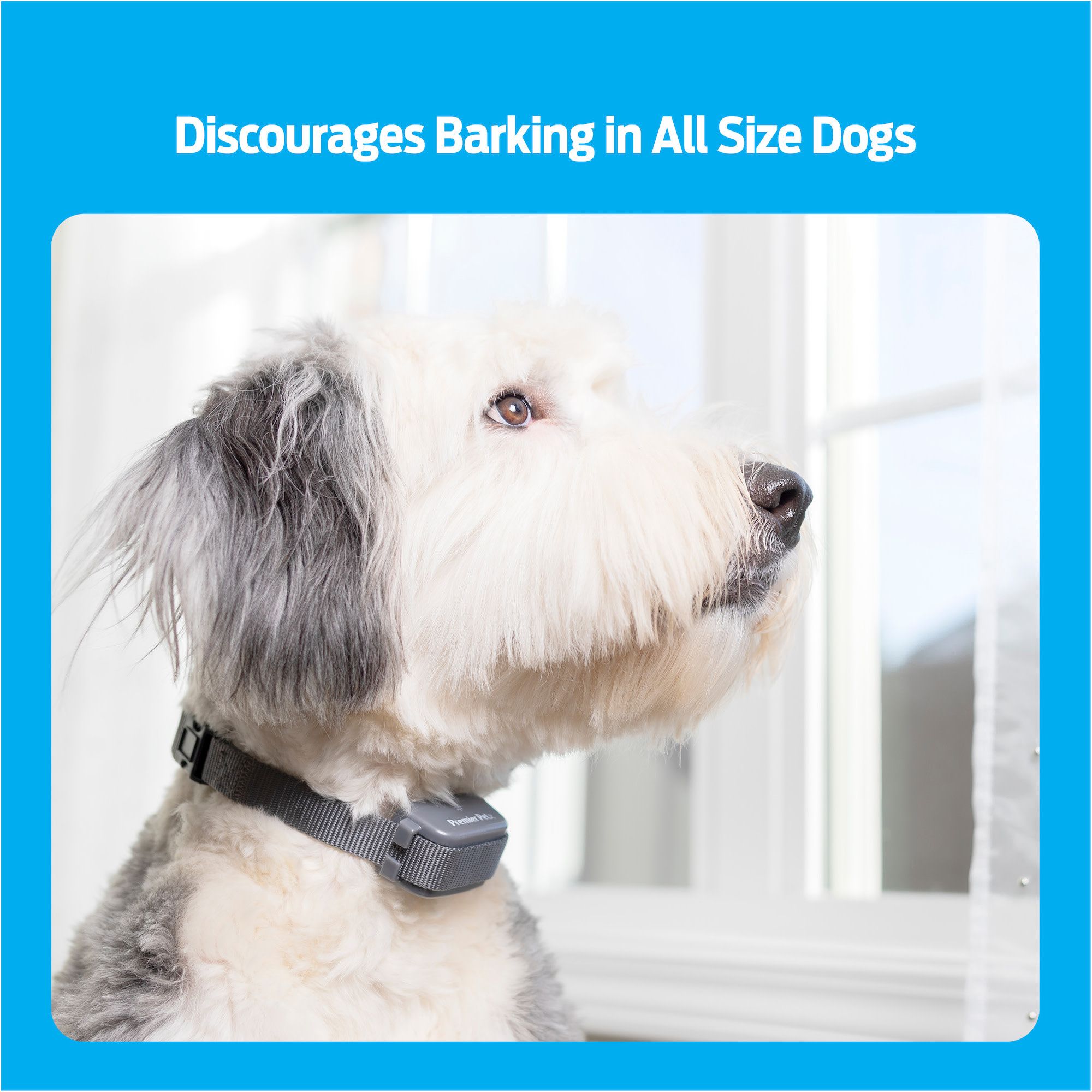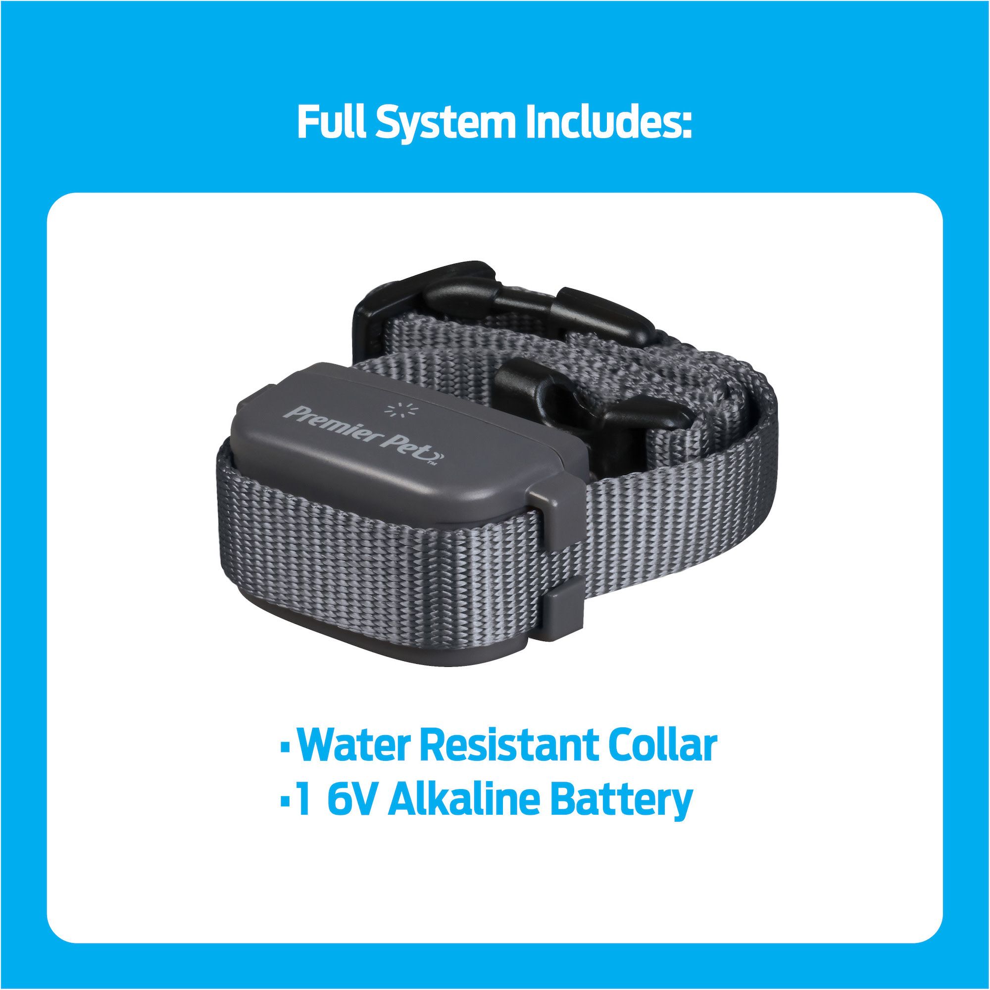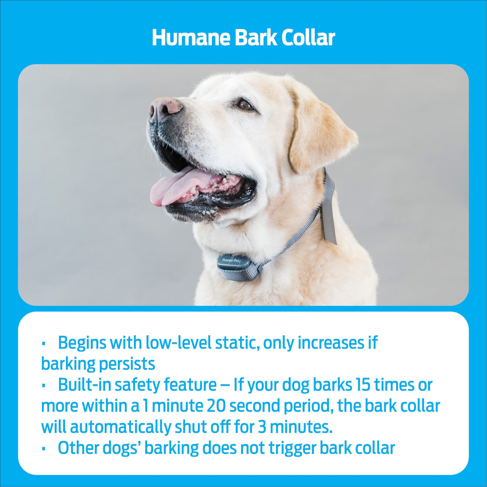 The Premier Pet Bark Collar discourages barking for all-size dogs. If your dog barks, the collar detects the vibration of your dog’s vocal cords and issues a gentle static correction. This correction will not be triggered by the bark of any dog except the one wearing the collar. With 15 levels of automatically adjusting static correction, this anti-bark collar ensures your dog receives the best level for his/her temperament. The correction will start at the lowest level and will only increase if barking persists. No programming is required. This water-resistant collar has a nylon strap that is adjustable up to 28”, making it a great fit for both smaller and larger dogs. A low battery indicator on the collar will alert you when the collar battery should be replaced. A built-in safety feature will automatically shut off the collar for three minutes if your dog barks 15 times or more within a one-minute 20 second period. Live peacefully together with your dog, small or large, by discouraging barking when using the Premier Pet Bark Collar.