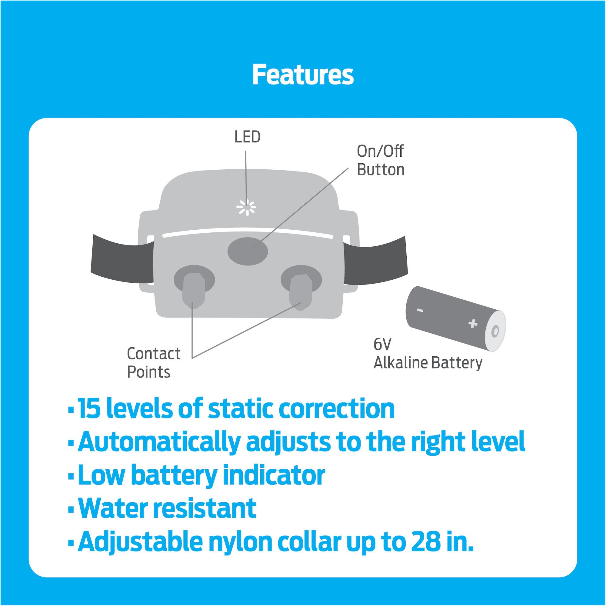 Discourages barking for all size dogs Issues gentle static correction when dog barks. Not triggered by other dogs’ barking 15 levels of static correction that automatically adjust to the best level for your dog, levels increase only if barking persists. No programming required Water resistant bark control collar with a nylon strap that is adjustable up to 28” and a low battery indicator that alerts you when the battery should be changed Built-in safety feature: if your dog barks 15 times or more within a one minute 20-second period, the bark collar will automatically shut off for three minutes For dogs six months and older weighing more than 8 lbs. U.S. customer support available by phone at (888) 640-8840 Includes bark control collar, 6V alkaline battery, product manual 1 Year Warranty