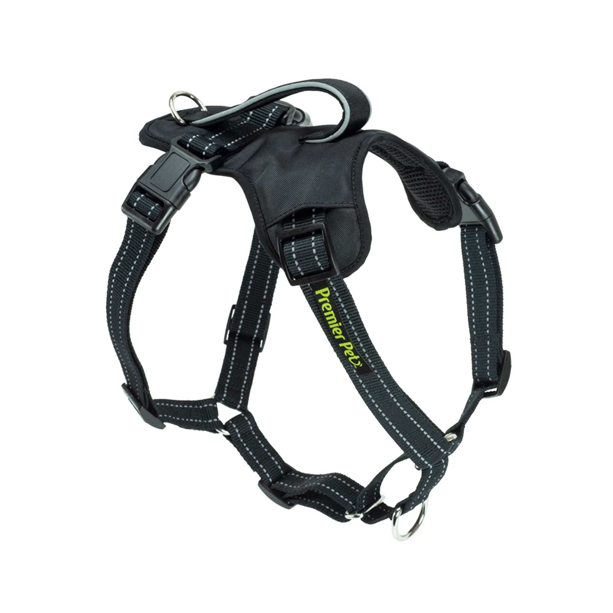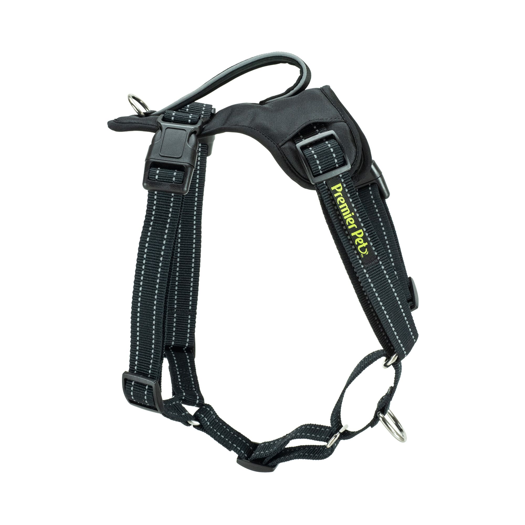 The Premier Pet No Pull Comfort Harness keeps your dog safe and comfortable during all your walking adventures. Choose the best size for your dog by measuring the widest part of his/her rib cage and easily create a custom fit with the four adjustment points. With two leash attachment points, you have a variety of walking options including a standard harness (clip in the back), a no-pull harness (clip in the front), and a control harness (both clips) when used with the Premier Pet Multi-Functional Leash. Built with reflective stitching, this harness provides safety, comfort, and control during any outing with your dog.