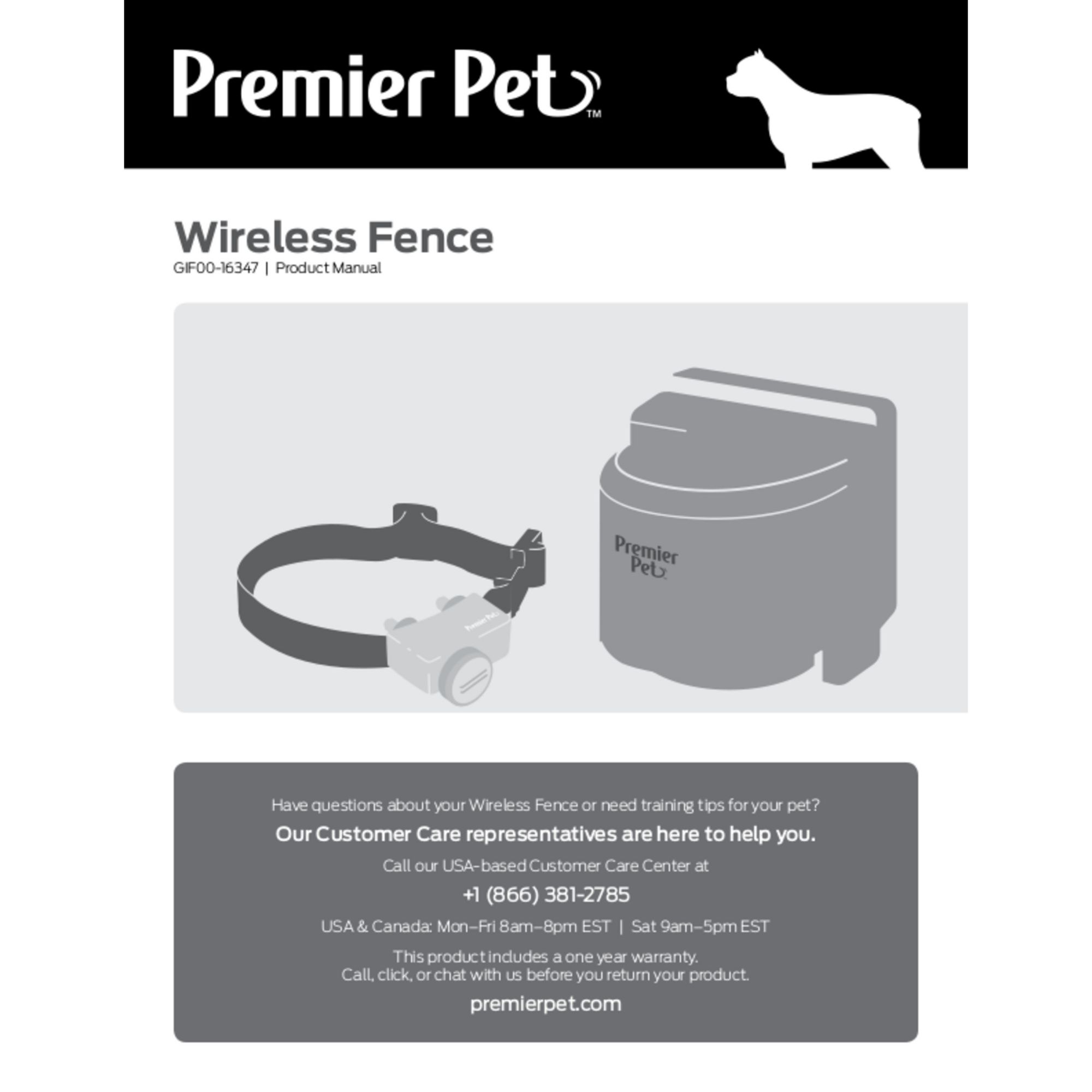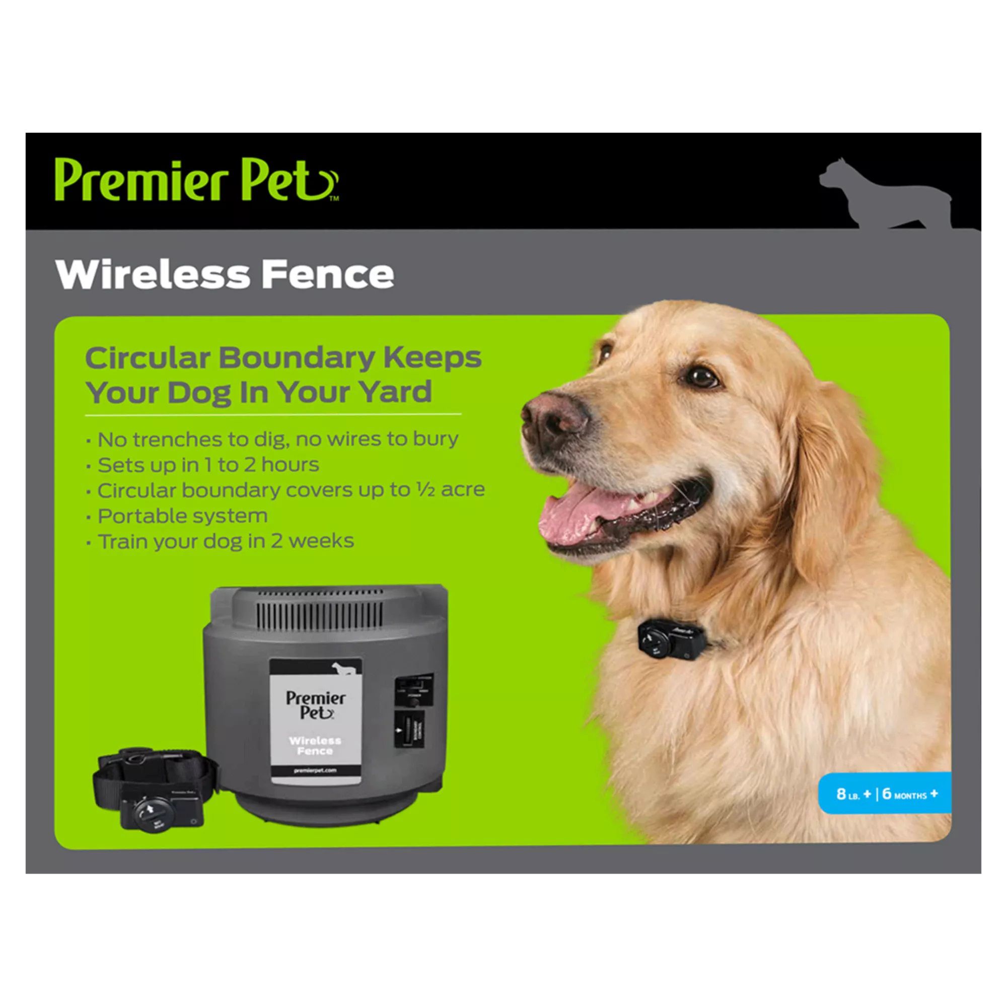 Portable, wireless fence system contains up to 1/2 acre with a circular boundary Waterproof receiver collar with an adjustable nylon strap up to 27 inches Expandable to contain an unlimited number of dogs with the Premier Pet Wireless Add-A-Dog collar (GIF00-16348) - extra collars sold separately Low battery indicator lets you know when to change the replaceable collar battery (GAC11-16351) One tone only mode for training and five adjustable levels of static correction Features a safety time-out to stop correcting and toning after 30 seconds should your pet run out of boundary zone Pet should be six months and older weighing more than eight pounds U.S. Customer Support available by phone at (888) 640-8840