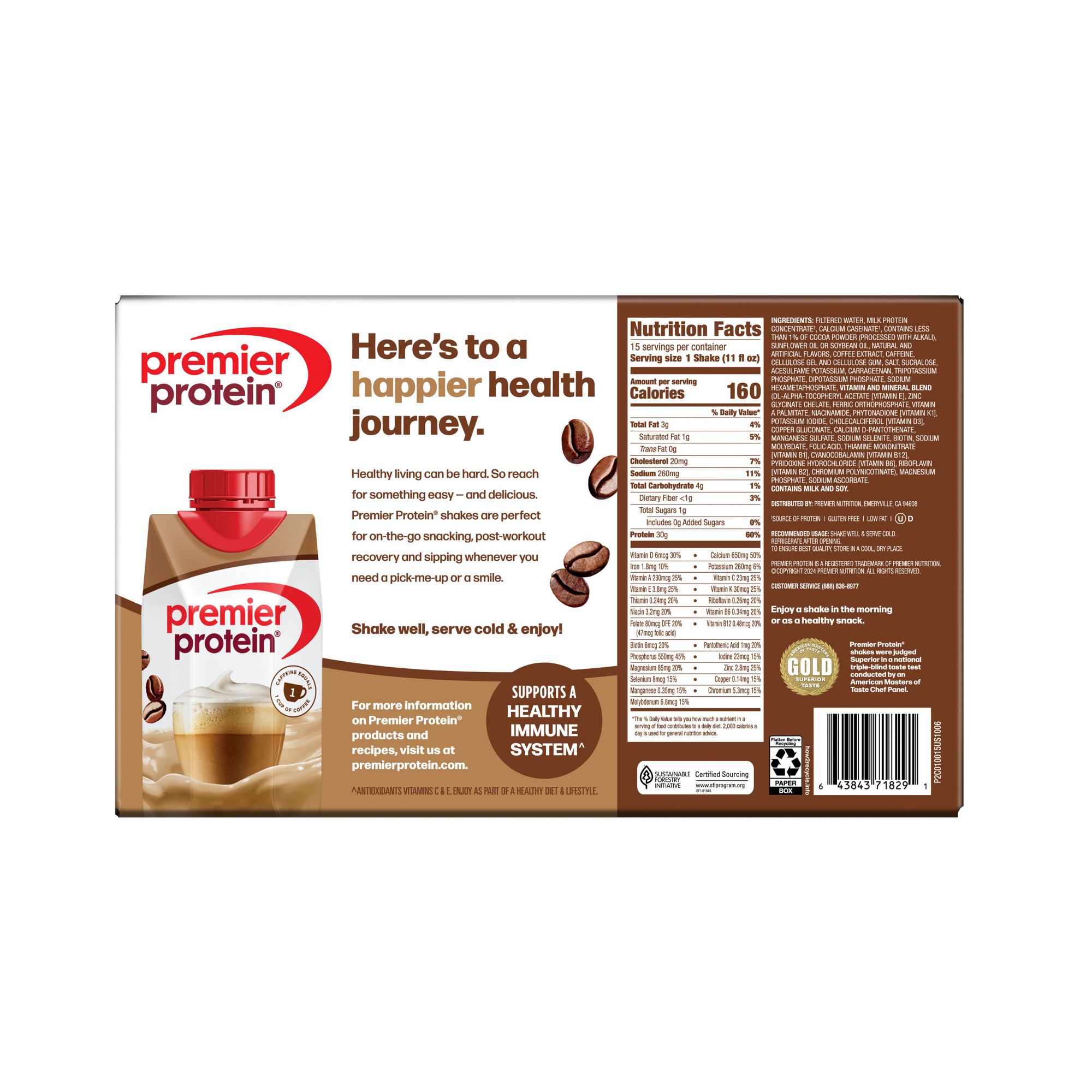 Protein isn’t just good for nourishment. It’s an essential nutrient that helps your body build and maintain muscle. In fact, studies suggest it may be beneficial to eat 25–30g of protein at each meal. With so many indulgent flavors and that smooth, creamy texture, it’s no wonder Premier Protein shakes have won The American Masters of Taste Gold Medal for Superior tasting ready-to-drink protein beverages every year since 2015. The award-winning taste comes without all the sugar, helping to take on cravings. The shakes contain Vitamins C and E, important antioxidants your body needs to help support a healthy immune system. Think of a shake as part of your daily hookup of important nutrients that help support your immune system and help give your body the nourishment it needs.