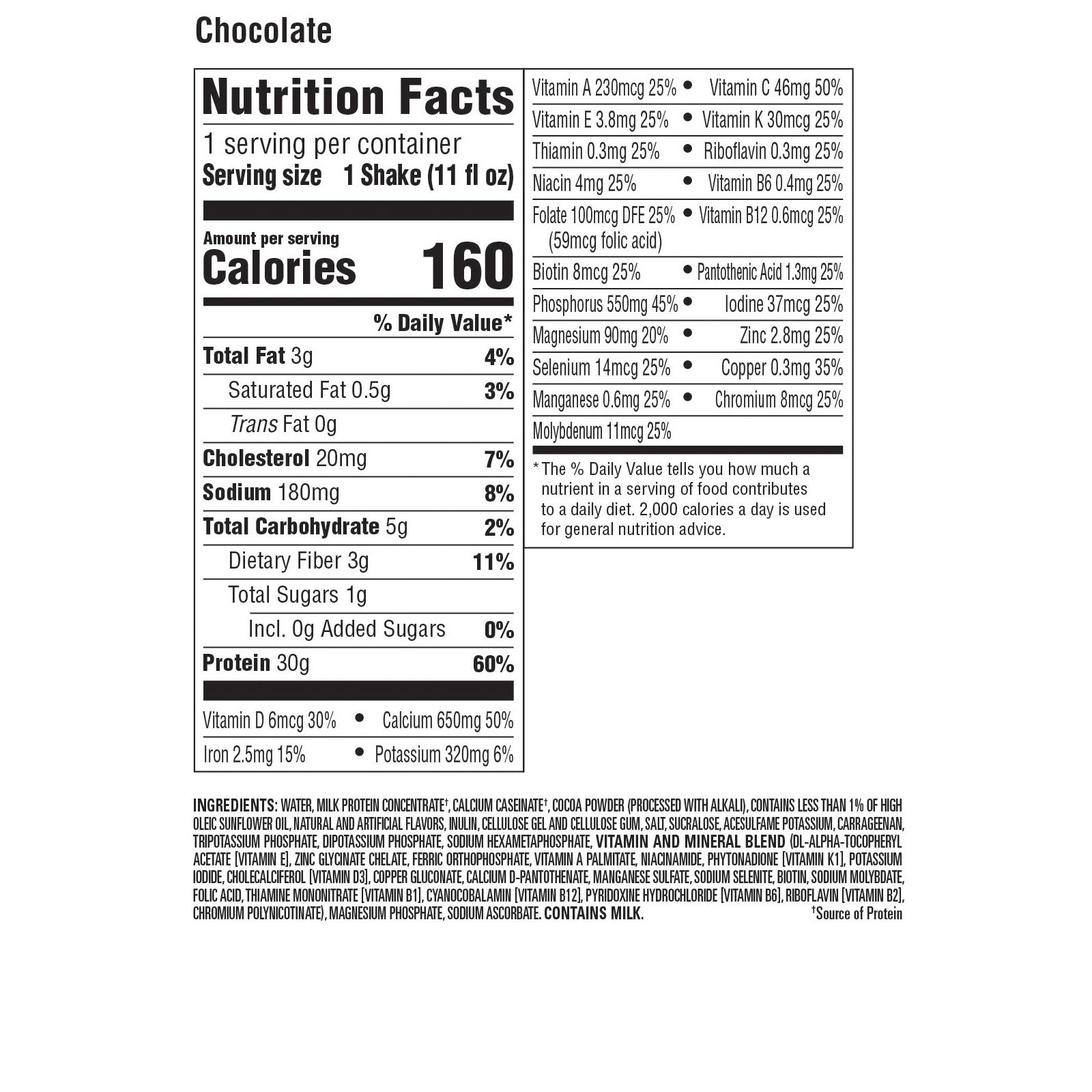 Ingredients:Water, Milk Protein Concentrate, Calcium Caseinate, Cocoa Powder (processed with alkali), Contains less than 1% of High Oleic Sunflower Oil, Natural and Artificial flavors, Inulin, Cellulose Gel and Cellulose Gum, Salt, Sucralose, Acesulfame Potassium, Carrageenan, Tripotassium Phosphate, Dipotassium Phosphate, Sodium Hexametaphosphate, Vitamin and Mineral Blend (Dl-alpha-tocopheryl Acetate [Vitamin E], Zinc Glycinate Chelate, Ferric Orthophosphate, Vitamin A Palmitate, Niacinamide, Phytonadione [Vitamin K1], Potassium Iodide, Cholecalciferol [Vitamin D3], Copper Gluconate, Calcium D-Pantothenate, Manganese Sulfate, Sodium Selenite, Biotin, Sodium Molybdate, Folic Acid, Thiamine Mononitrate [Vitamin B1], Cyanocobalamin [Vitamin B12], Pyridoxine Hydrochloride [Vitamin B6], Riboflavin [Vitamin B2], Chromium Polynicotinate), Magnesium Phosphate, Sodium Ascorbate.