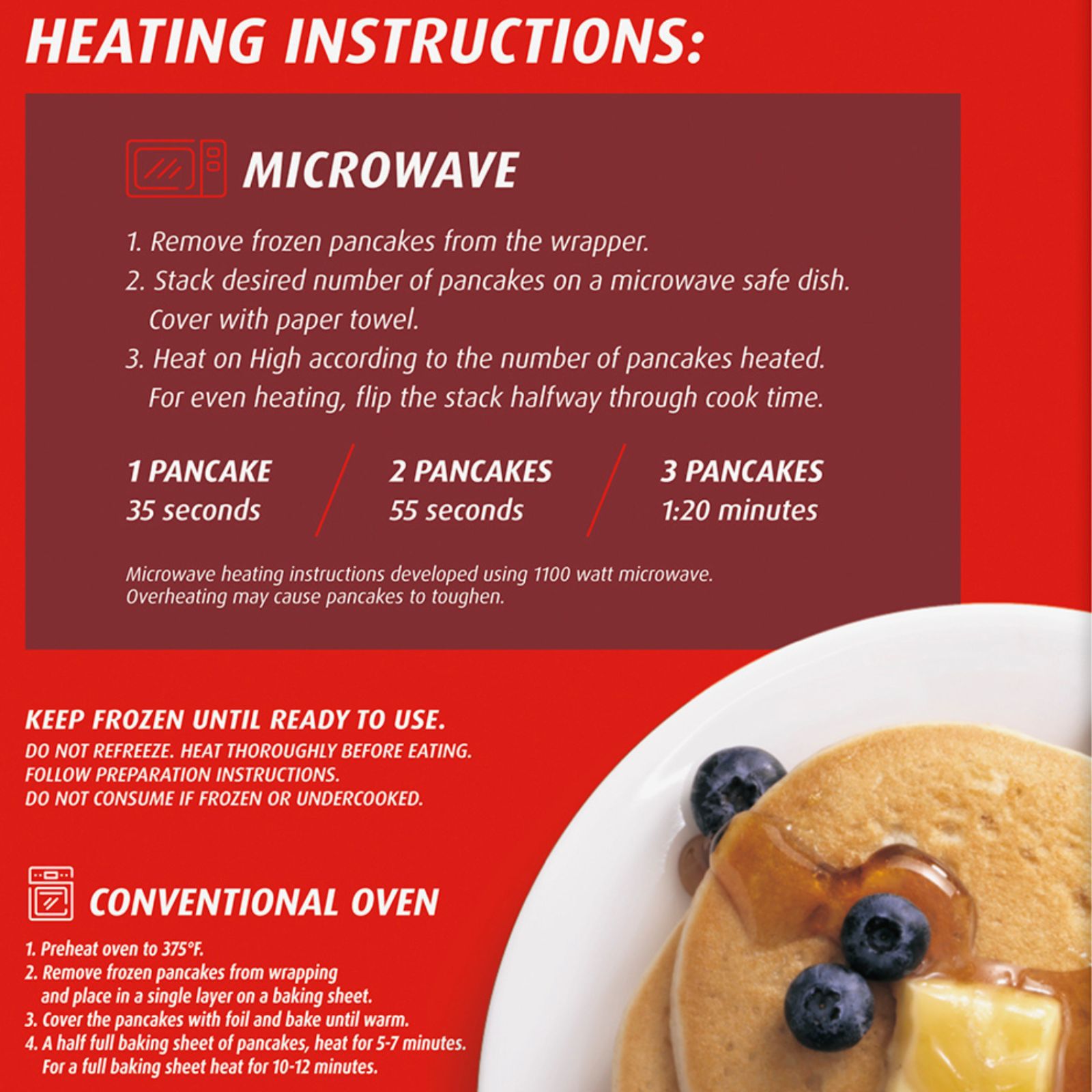 Product Warnings and Restrictions: Keep Frozen Until Ready To Use. Do Not Refreeze. Heat Thoroughly Before Eating. Follow Preparation Instructions. Do Not Consume If Frozen Or Undercooked.