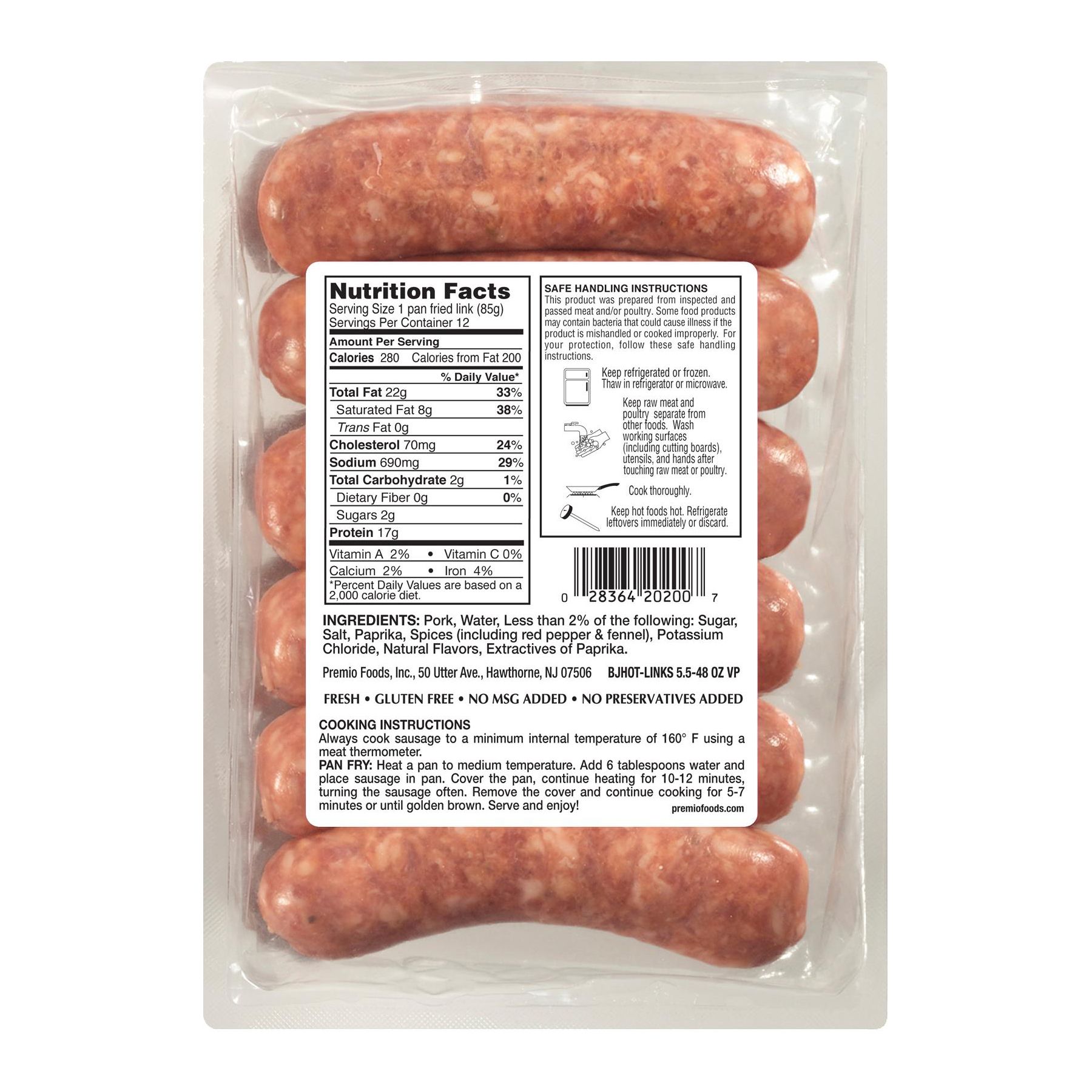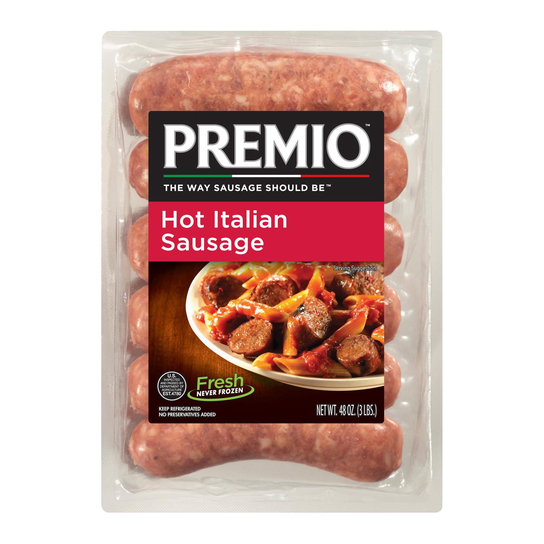 Made fresh with no filler preservatives, MSG or gluten, Premio Hot Italian Sausage is a crowd favorite for any occasion. Serve it in a sandwich, sliced up with peppers or alone and it will be sure to satisfy everyone's sweet sausage needs every time. Get yours today to taste the way sausage should be.
