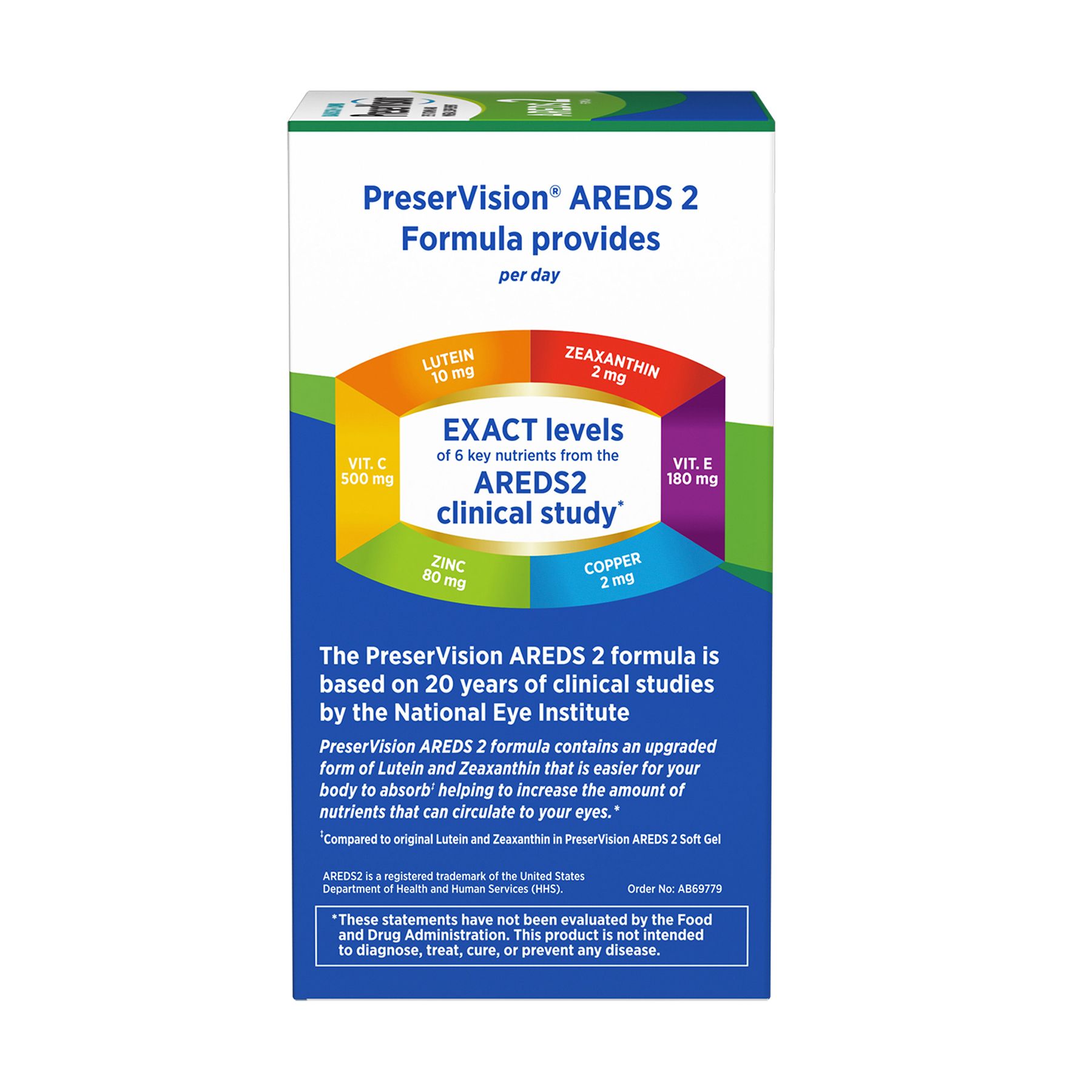 PreserVision Eye Vitamin and Mineral Supplement AREDS 2 Formula contains the exact levels of nutrients recommended by the National Eye Institute to help reduce the risk of progression in people with moderate to advanced Age-related Macular Degeneration (AMD). PreserVision AREDS2 Formula builds on the original, clinically-proven PreserVision AREDS formula, with lutein and zeaxanthin replacing beta-carotene based on the AREDS2 study.