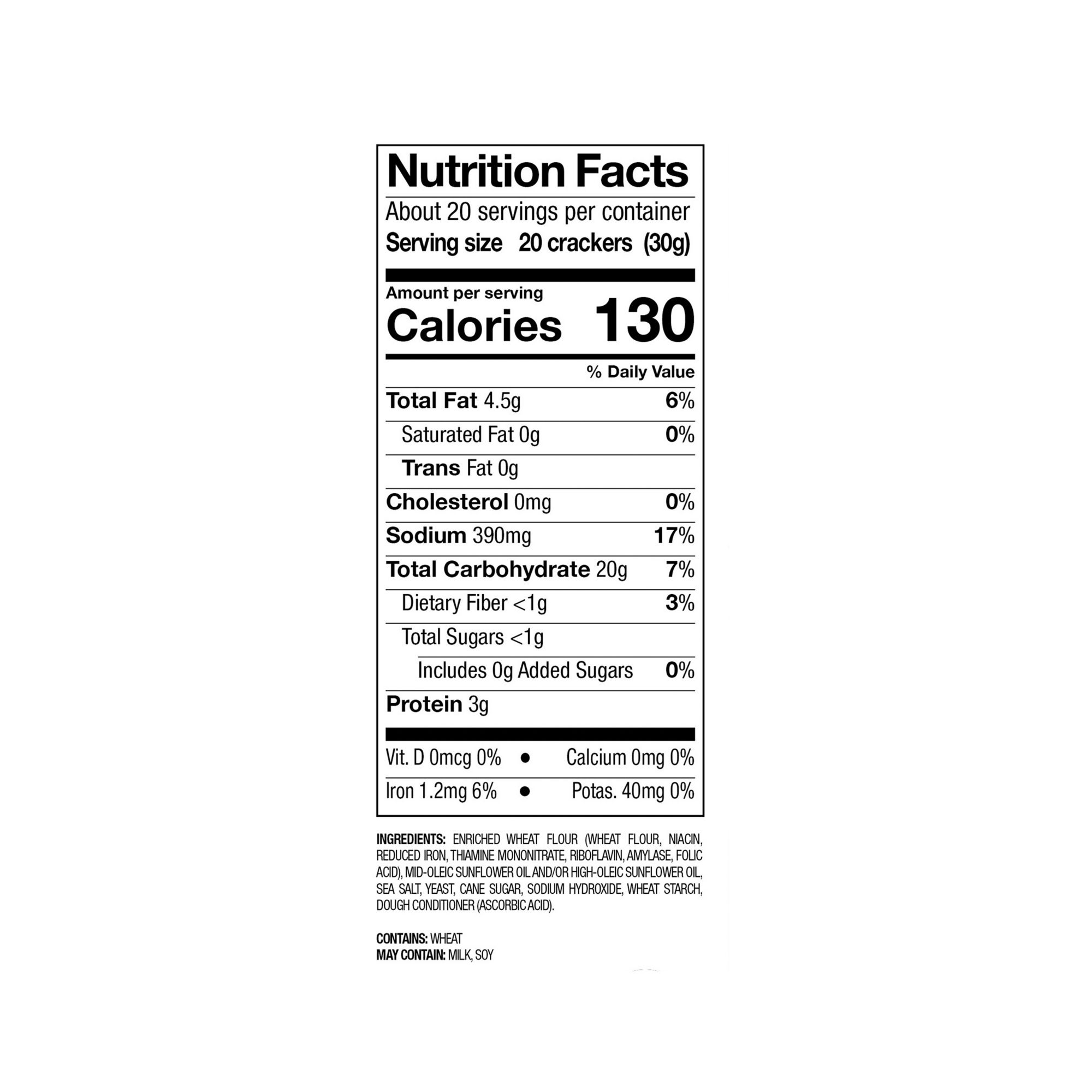 Ingredients: Enriched Wheat Flour (Wheat Flour, Niacin, Reduced Iron, Thiamine Mononitrate, Riboflavin, Amylase, Folic Acid), Mid-oleic Sunflower Oil And/or High-oleic Sunflower Oil, Sea Salt, Yeast, Cane Sugar, Wheat Starch, Dough Conditioner (Ascorbic Acid).