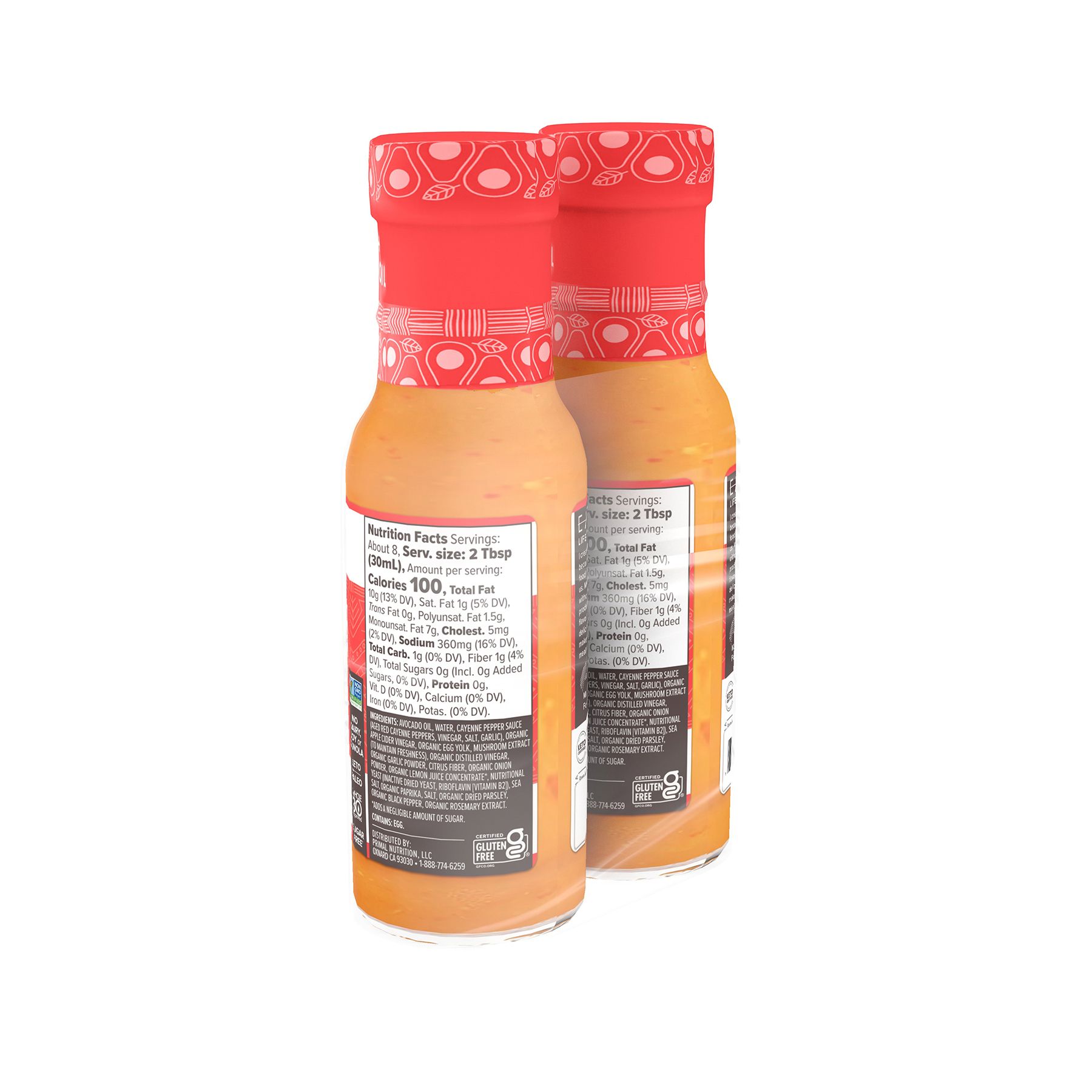Ingredients: Avocado Oil, Water, Cayenne Pepper Sauce (Aged Red Cayenne Peppers, Vinegar, Salt, Garlic), Organic Apple Cider Vinegar, Organic Egg Yolk, Mushroom Extract (To Maintain Freshness), Organic Distilled Vinegar, Organic Garlic Powder, Citrus Fiber, Organic Onion Powder, Organic Lemon Juice Concentrate*, Nutritional Yeast (Inactive Dried Yeast, Riboflavin [Vitamin B2]), Sea Salt, Organic Paprika, Salt, Organic Dried Parsley, Organic Black Pepper, Organic Rosemary Extract. *Adds A Negligible Amount Of Sugar. Contains: Egg.