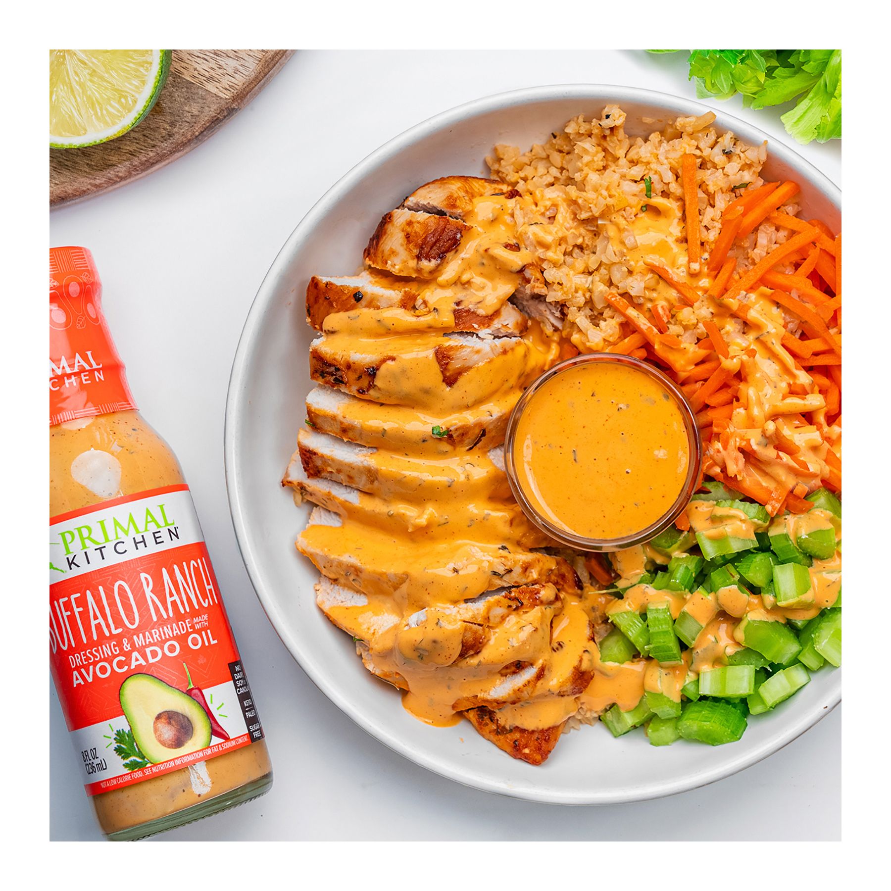 Ranch and buffalo lovers will rejoice with Primal Kitchen's latest dressing drop. Primal Kitchen Buffalo Ranch Dressing is made with avocado oil and high-quality ingredients with no dairy, sugar, gluten, soy or canola in sight. Dunk homemade sweet potato fries, dip chicken tenders or drizzle on your favorite salad for a zesty, no dairy dressing delight.