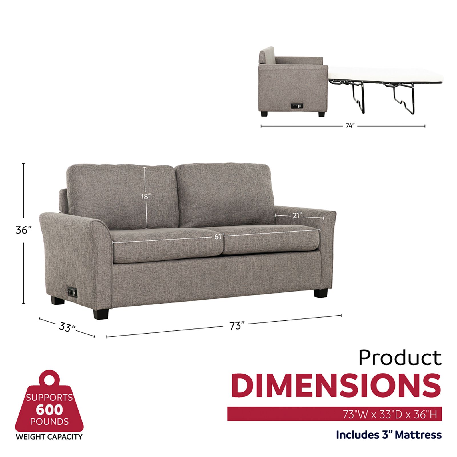 Conveniently converts into a full size bed for versatile use Includes 3-inch memory foam mattress Integrated USB ports for easy device charging while lounging Metal frame and plywood construction provide sturdy support and durability Upholstered in soft fabric for a comfortable feel and modern look Foam and spring coil for enhanced comfort Plastic wood-look legs add stability and a touch of contemporary design Back cushion filled with shredded foam and fiber blend for plush comfort Ideal for small spaces, guest rooms, or multifunctional areas Includes sofa bed, legs