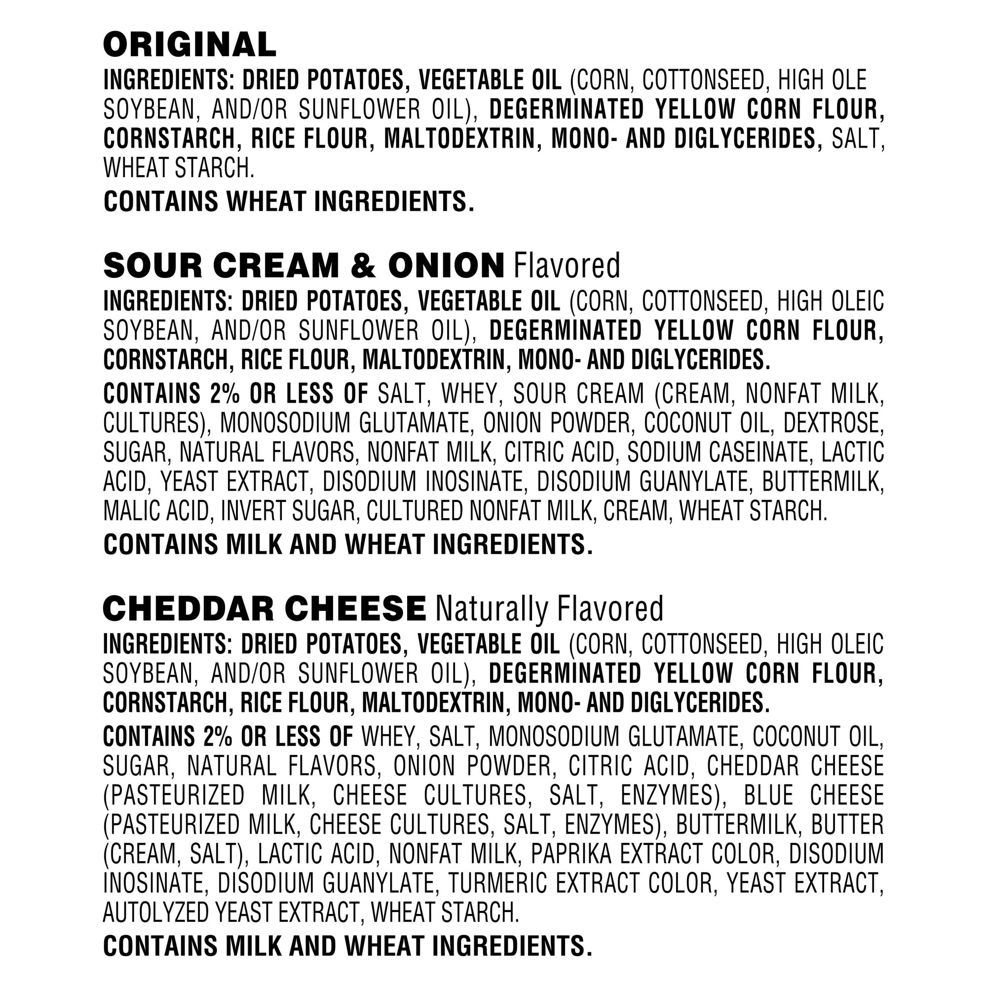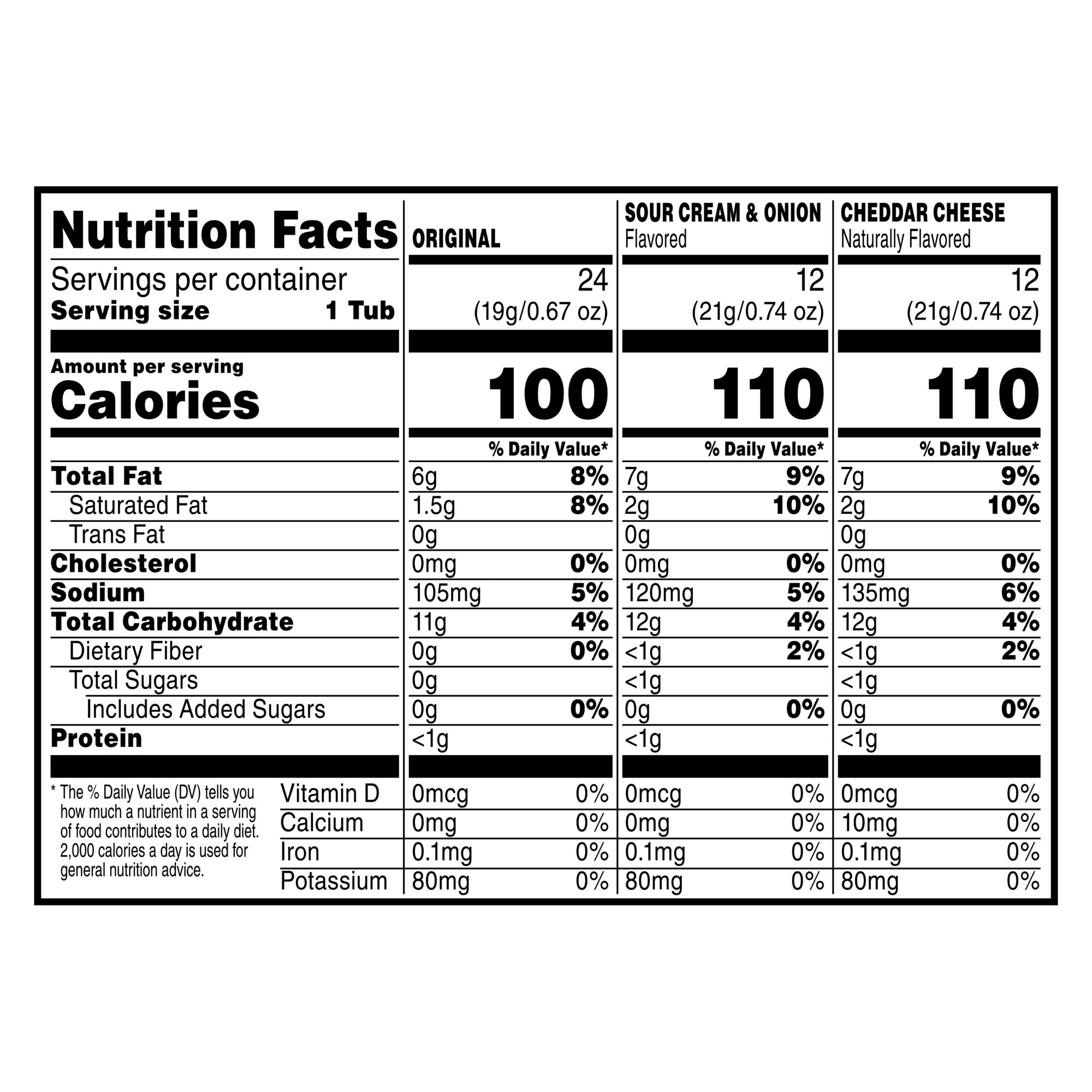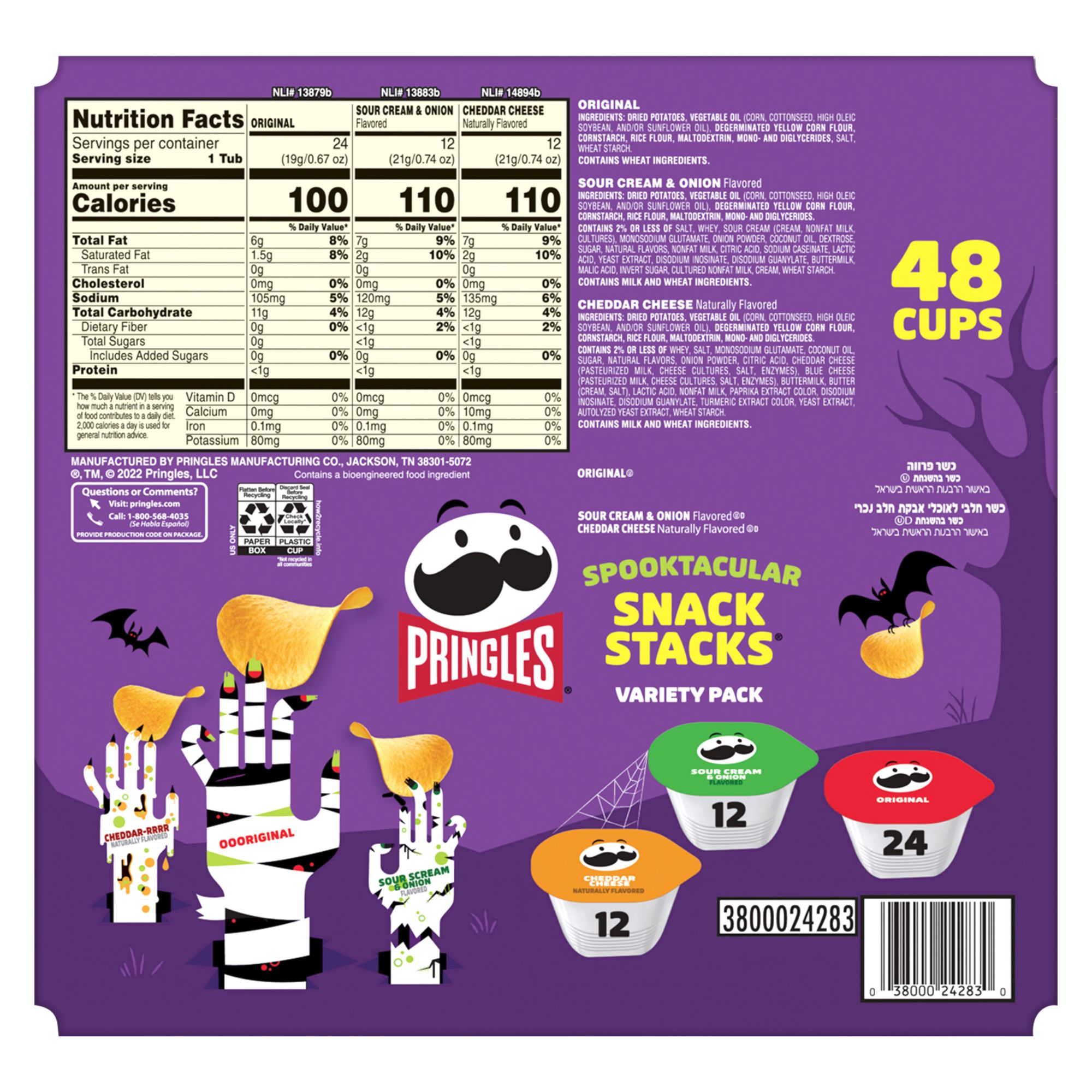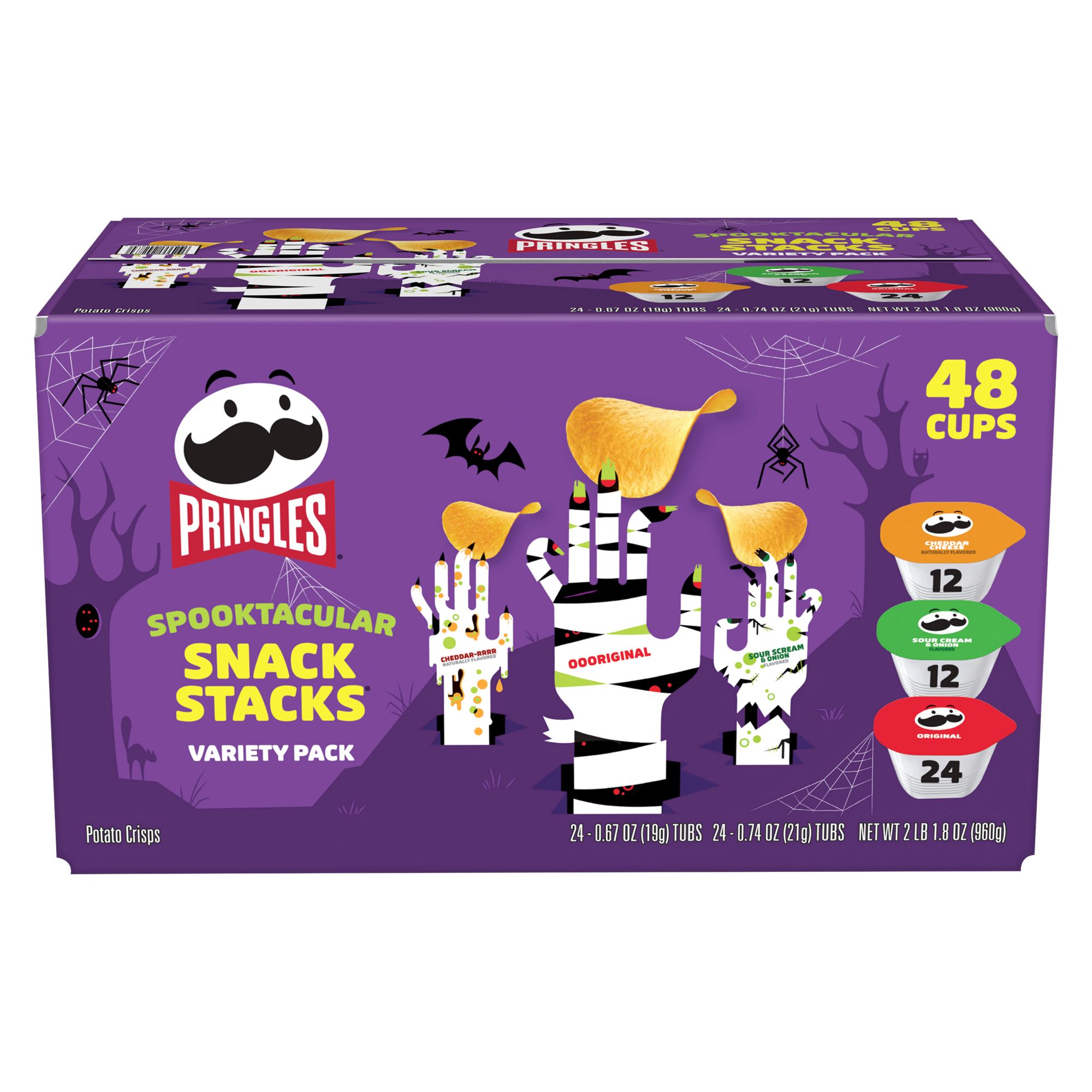Snack size Pringles in a variety of flavors Top Flavors included Original, Sour Cream n Onion, and Cheddar Cheese Great for Trick or Treating Great as a spooky snack