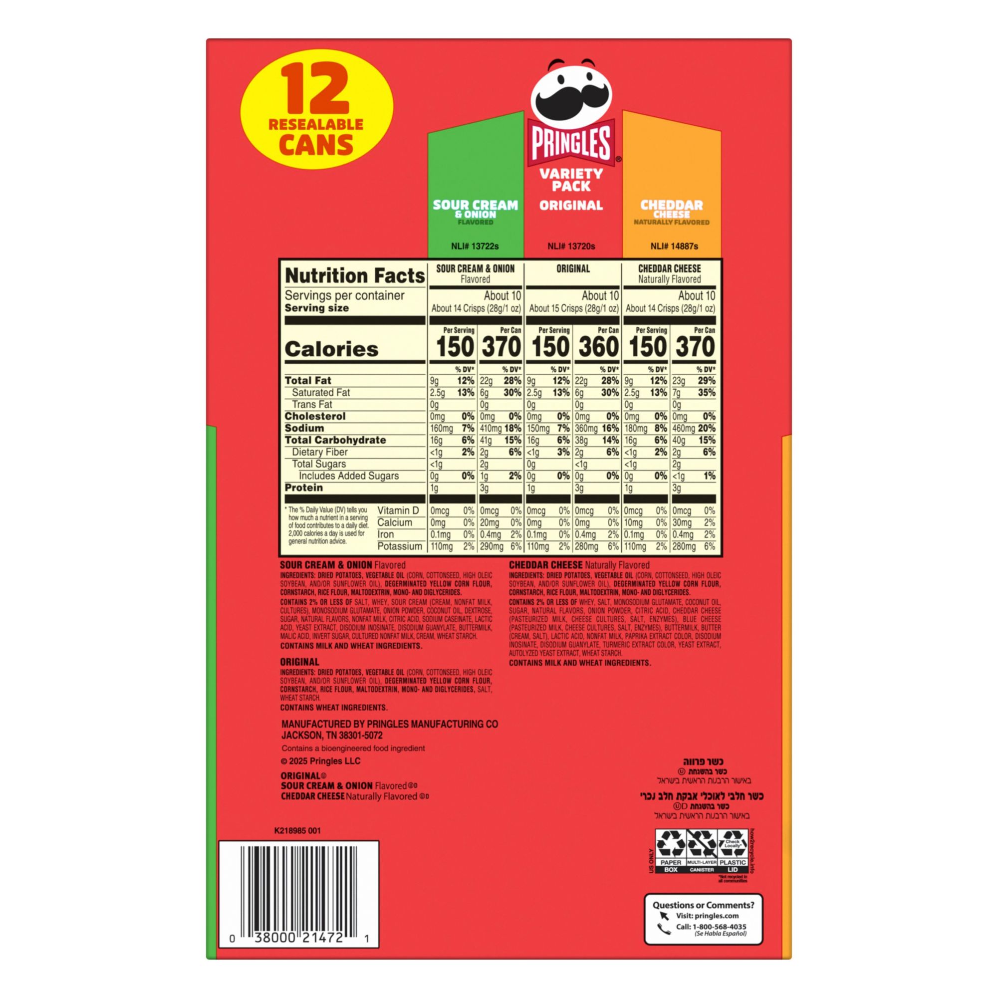 There's a favorite flavor for everyone in the Pringles Potato Crisps Variety Pack. Make snack time more fun with the classic crunch of Pringles Potato Crisps flavored from edge to edge in three mouthwatering flavors including Original, Cheddar Cheese and Sour Cream and Onion Flavored. With their delicious taste and original, stackable shape, Pringles Potato Crisps always inspire good times with friends and the convenient, portable can gives you the freedom to snack when and where you want. Stock your pantry with Pringles Potato Crisp cans for a quick snack at home that's always ready for the road. Pringles Potato Crisps make a delicious addition to goodie bags, gift baskets, or care packages the compact can and the satisfying, savory crunch of Pringles Potato Crisps stands out in any spread of favorite snacks. Grab a can for the office, pack a snack for school, bring them in the car, or share a stack with friends however you eat them, you'll love the fun shape and delicious taste of Original, Cheddar Cheese and Sour Cream and Onion Flavored Potato Crisps.