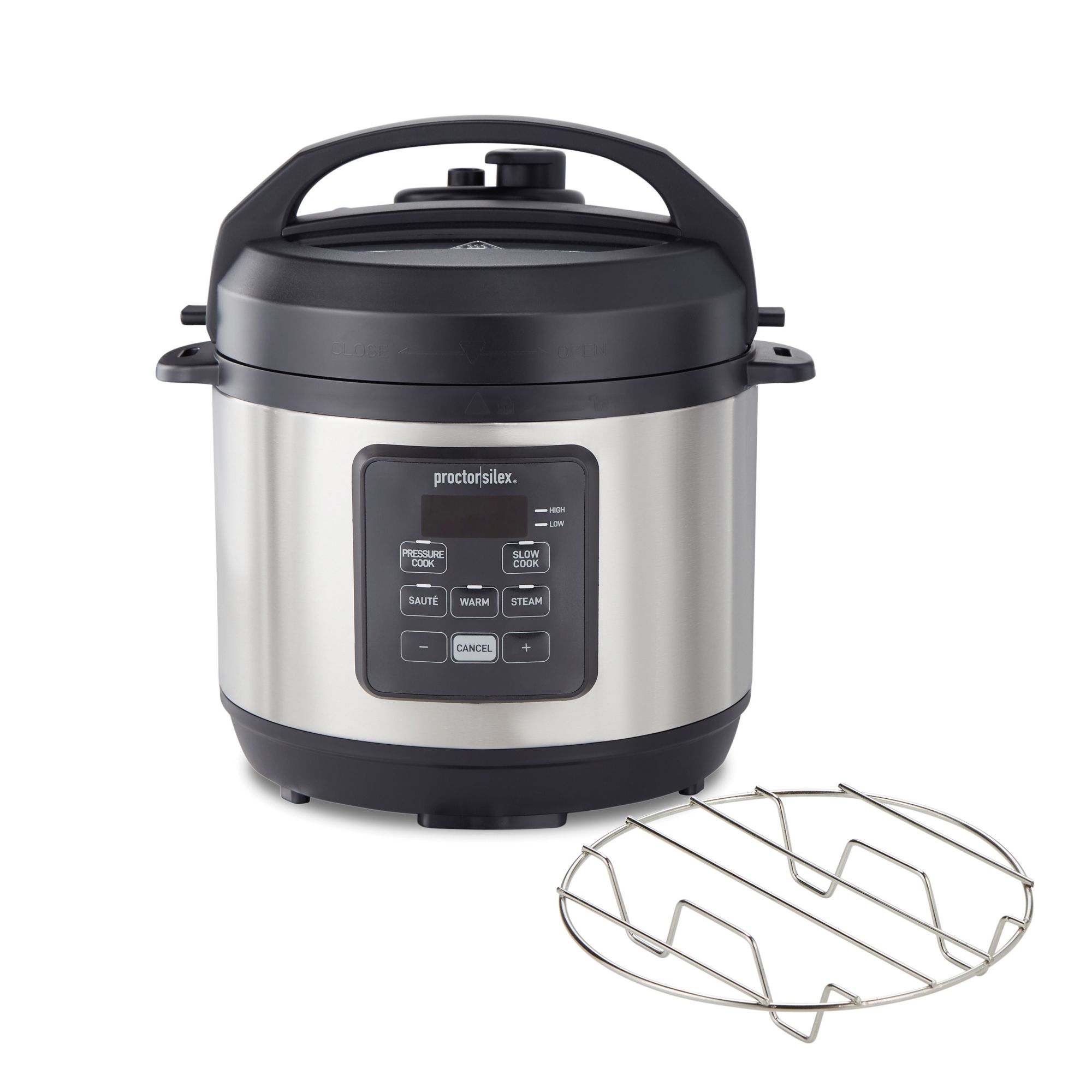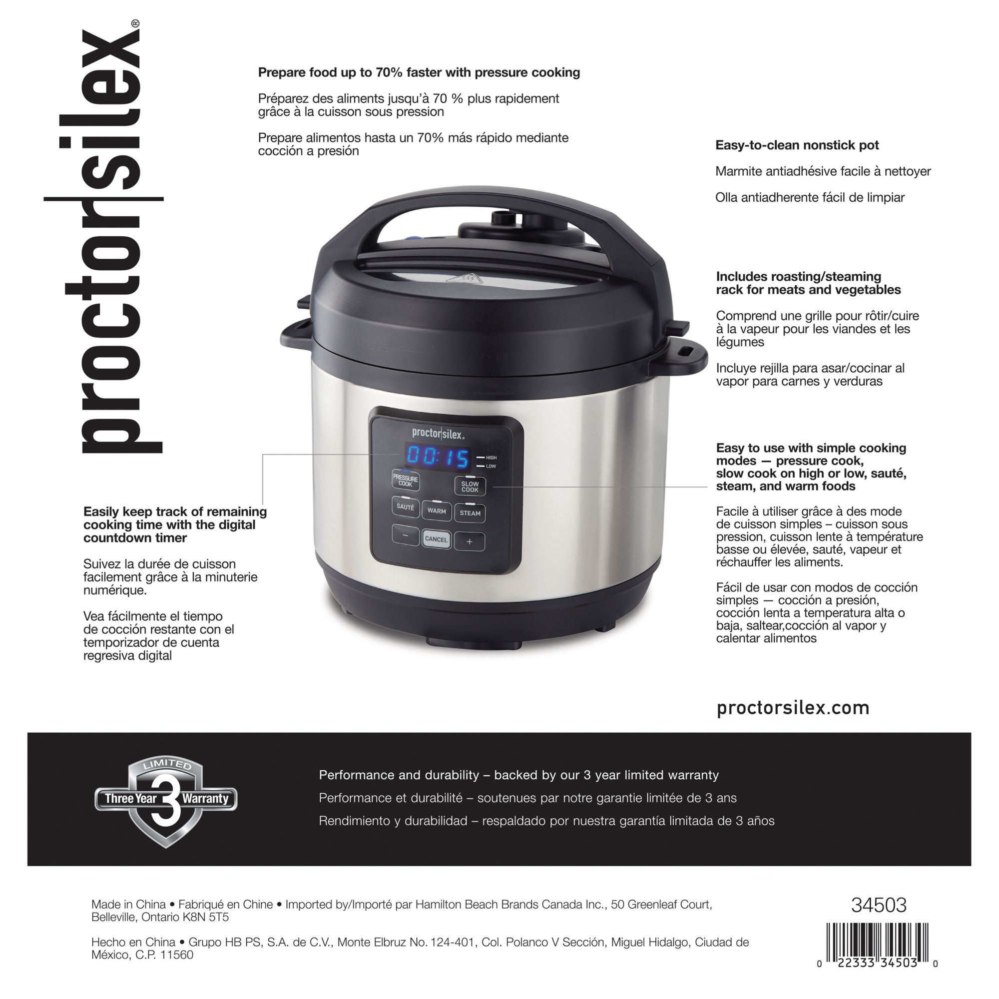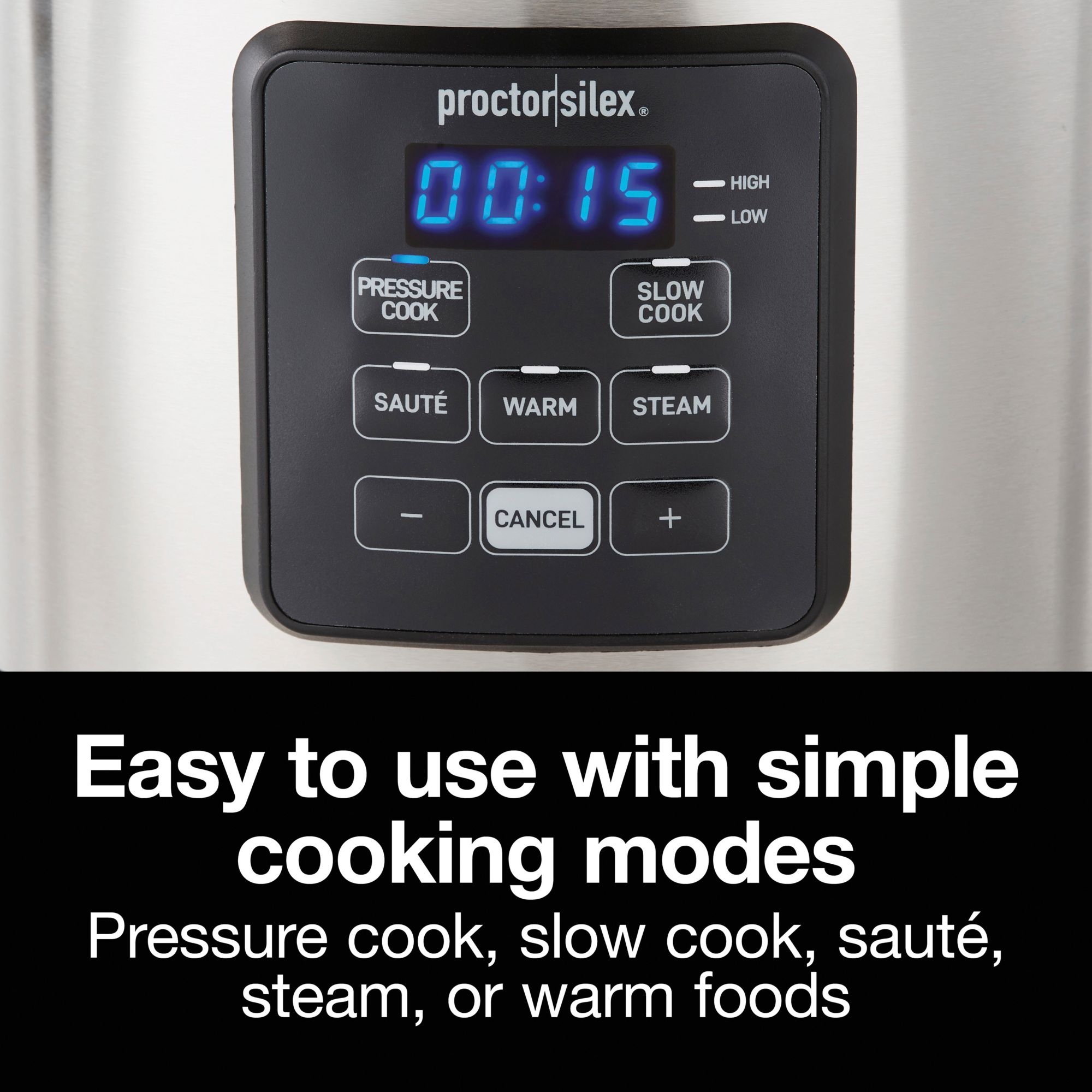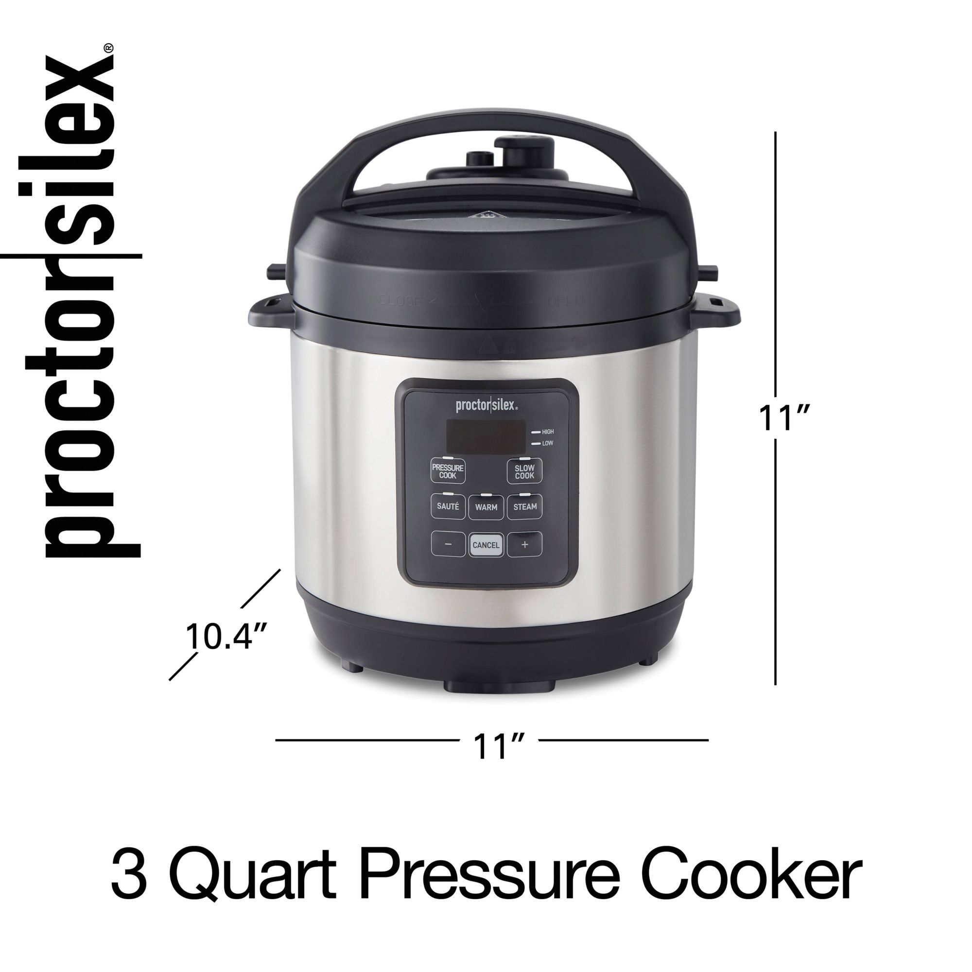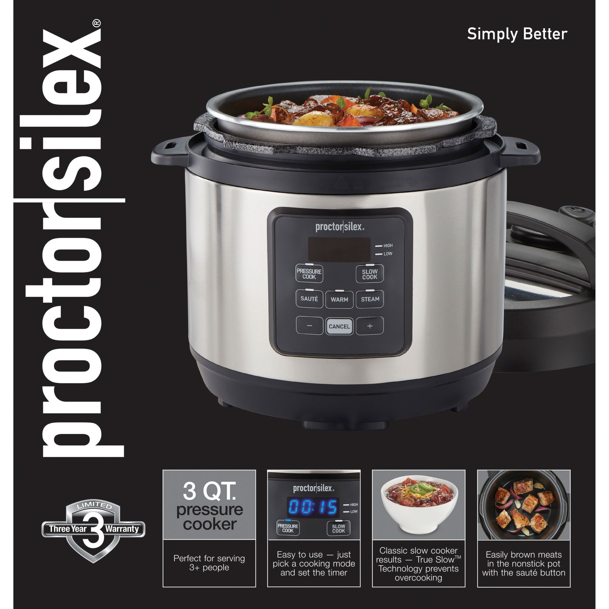 The Proctor Silex® 3-Qt. Simplicity™ Pressure Cooker is the perfect size for cooking meals for three+ people. It's smaller than typical pressure cookers and has simple cooking modes. Easily follow your favorite recipes. Just pick your cooking mode and set the timer. There's nothing complicated to figure out and no pre-programmed settings to decipher, yet you still have a variety of cooking options to choose from. Pressure cook, slow cook on high or low, sauté, steam, or warm foods in this one easy-to-use multi-cooker.
