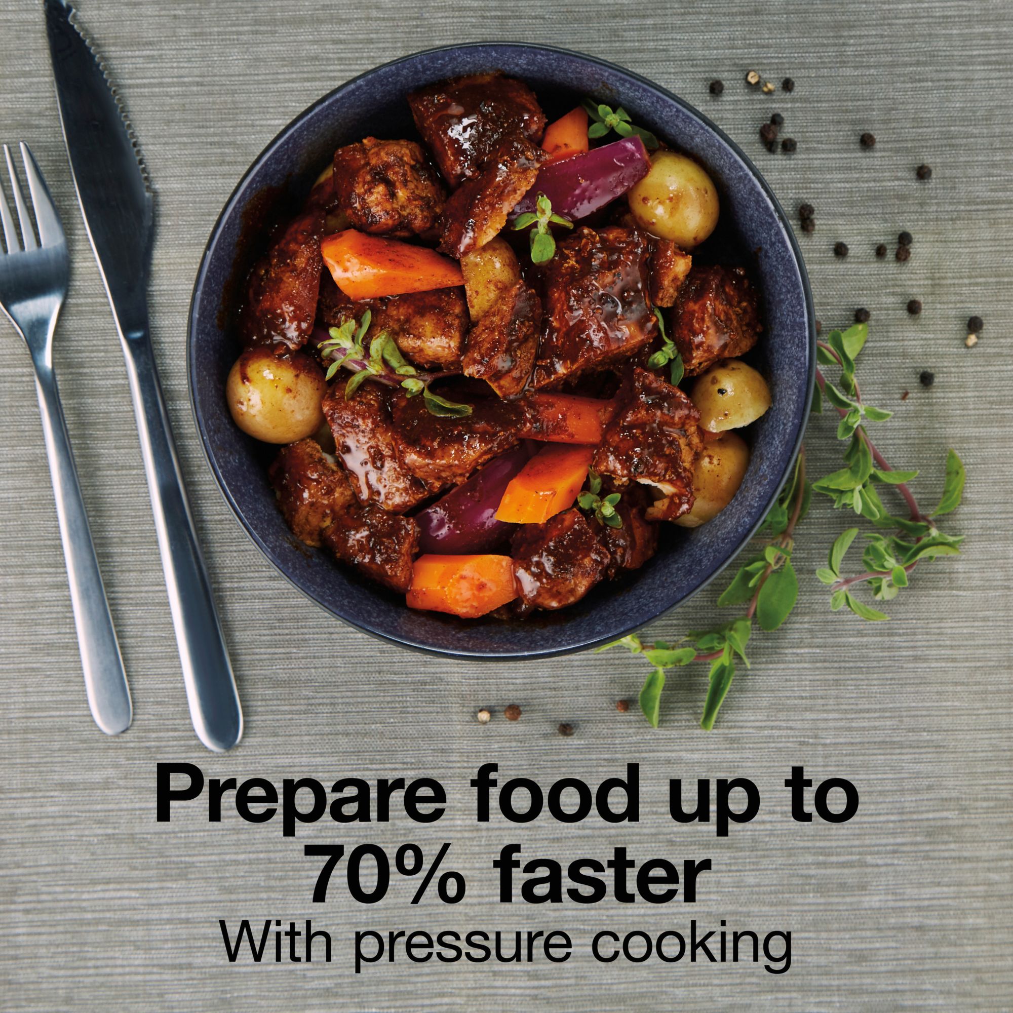 Perfectly prepare meals for 3+ people Easy to use with simple cooking modes Foods come out just right and won't overcook with True Slow™ technology Easily brown and sauté meats Prepare food up to 70% faster with pressure cooking Easy to clean with stainless steel exterior and dishwasher safe nonstick pot, roasting rack and condensation cup Includes roasting/steaming rack Easily monitor cooking time Includes one pressure cooker