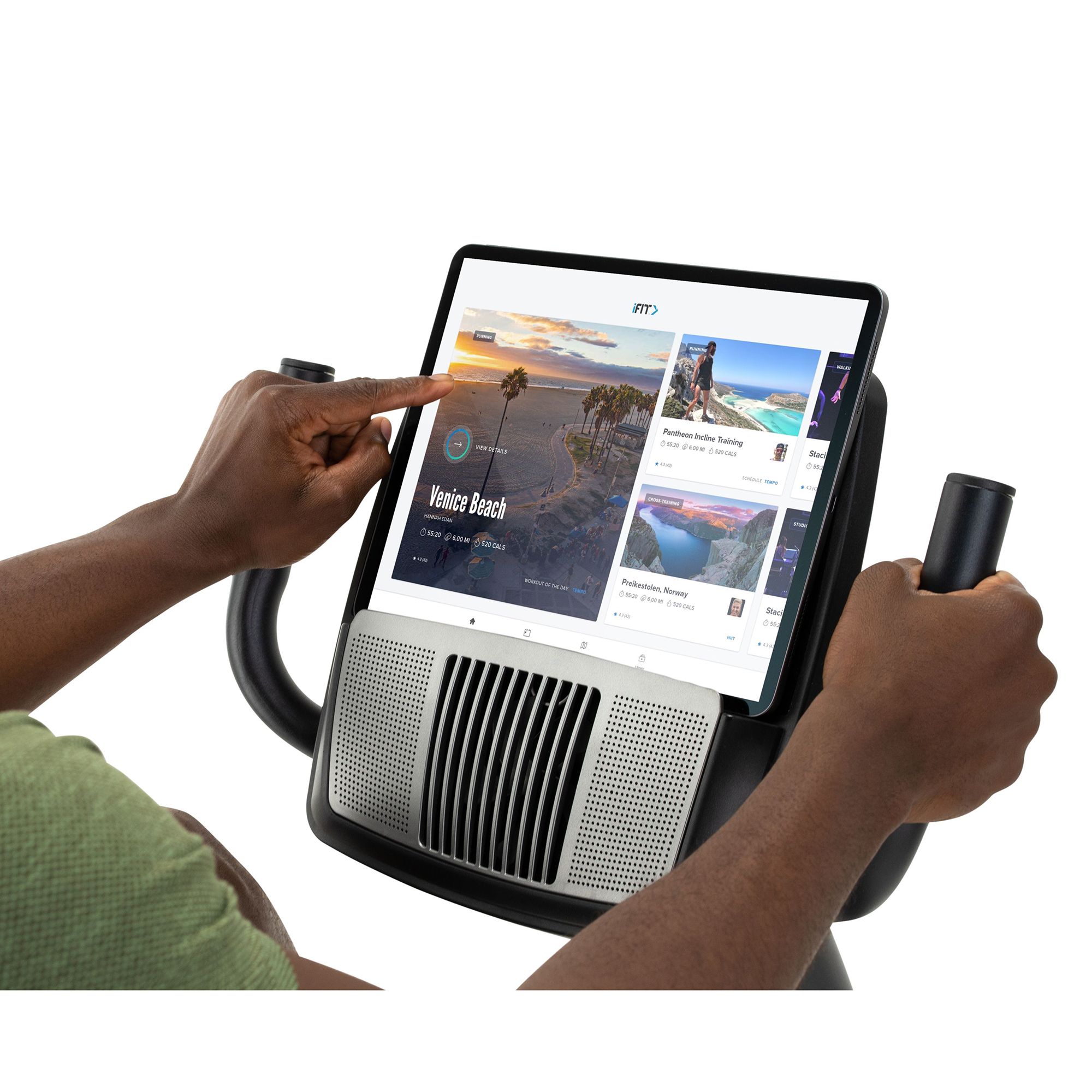 Get the competitive edge on the ProForm Recumbent Exercise Bike. Engage in a whole new fitness experience as certified personal trainers take your exercise all around the world. With a 30-day, full-access membership to iFit, the immersive workouts let you follow the trainers through these global destinations and in the studio while they lead you through high-powered training sessions. All you have to do is jump on and hit 'Start' and the trainer will automatically control your machine’s resistance. Stay in clear control and track your workout stats during your iFit workout with the 5", high-contrast display. Experience a smooth, steady pedal stroke with the flywheel made to perform. A faster gear ratio and effective weight placement deliver a more natural cycling experience. The StepThru frame is easier to get on and off than a traditional bike frame. The 325 CSX bike was built to imitate the ultimate outdoor cycling experience. With the freewheel clutch, the circular motion is smooth and natural so you can maintain your form and pedaling technique just like you would on your outdoor cycle. We’ve learned that the best fitness experience is all about the details. With the 325 CSX, you aren’t just working out, you're enjoying a comfortable ride. The oversized seat has added cushioning and easily adjusts so you find the perfect fit. Plus, the extra lumbar support really helps line up your posture so your back doesn’t get achy as you ride. Designed to keep your feet in place, these pedals are built with adjustable straps to increase stability. With 22 digital resistance levels, you can start out easy and progress to intense. Each level is smooth, frictionless, and silent with the patented SMR Silent Magnetic Resistance. Moving the 325 CSX out of the way and into any corner is fast and easy with the front-mounted wheels. Stay hydrated throughout your workout by keeping your water bottle close. This convenient water bottle holder is built into the bike frame for easy access. Keep cool with the built-in fan that features two-speed settings. Quick console controls allow you to adjust the fan speed at any time. The included audio auxiliary port allows you to listen to your entertainment at a higher volume. Built with dual 2" speakers, you’ll be able to hear your music or videos with less complication. iFit membership activation requires a credit/debit card and auto-renews for a fee, and can be cancelled at any time.