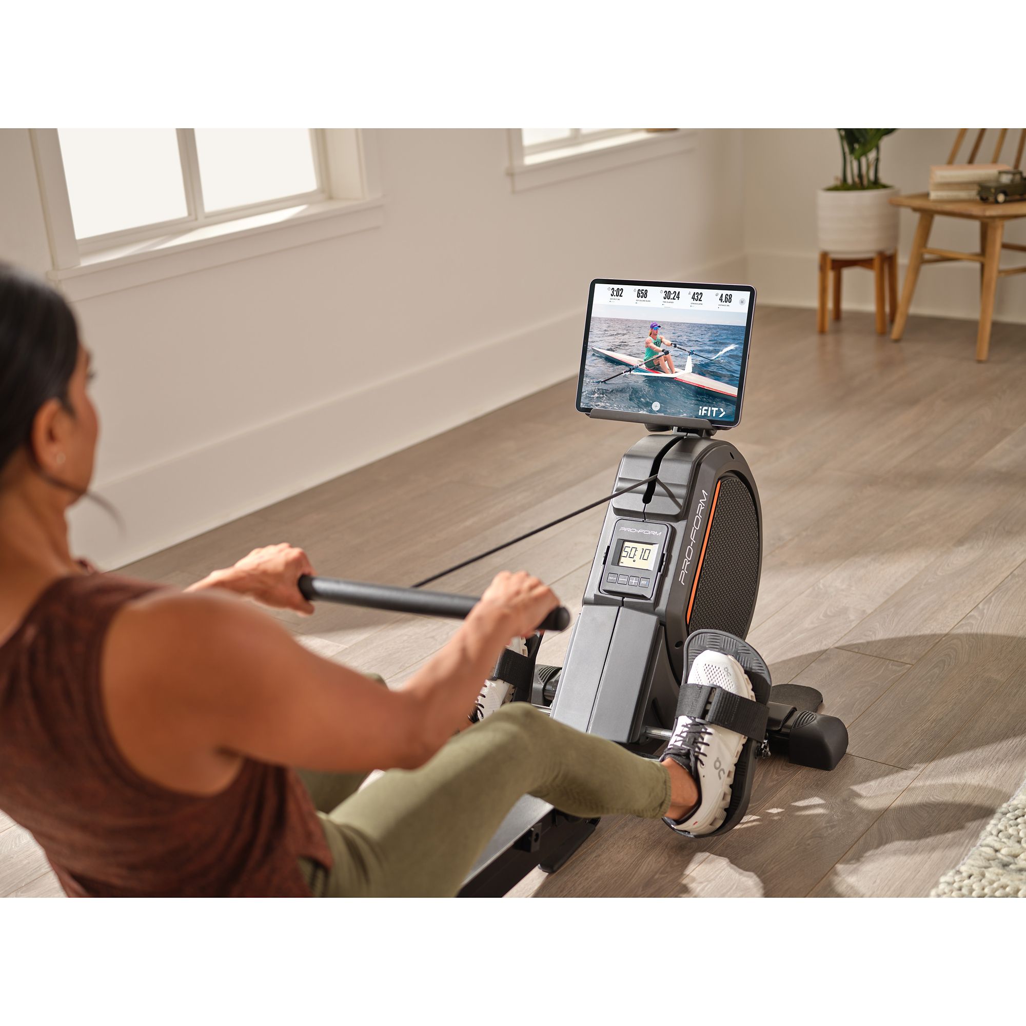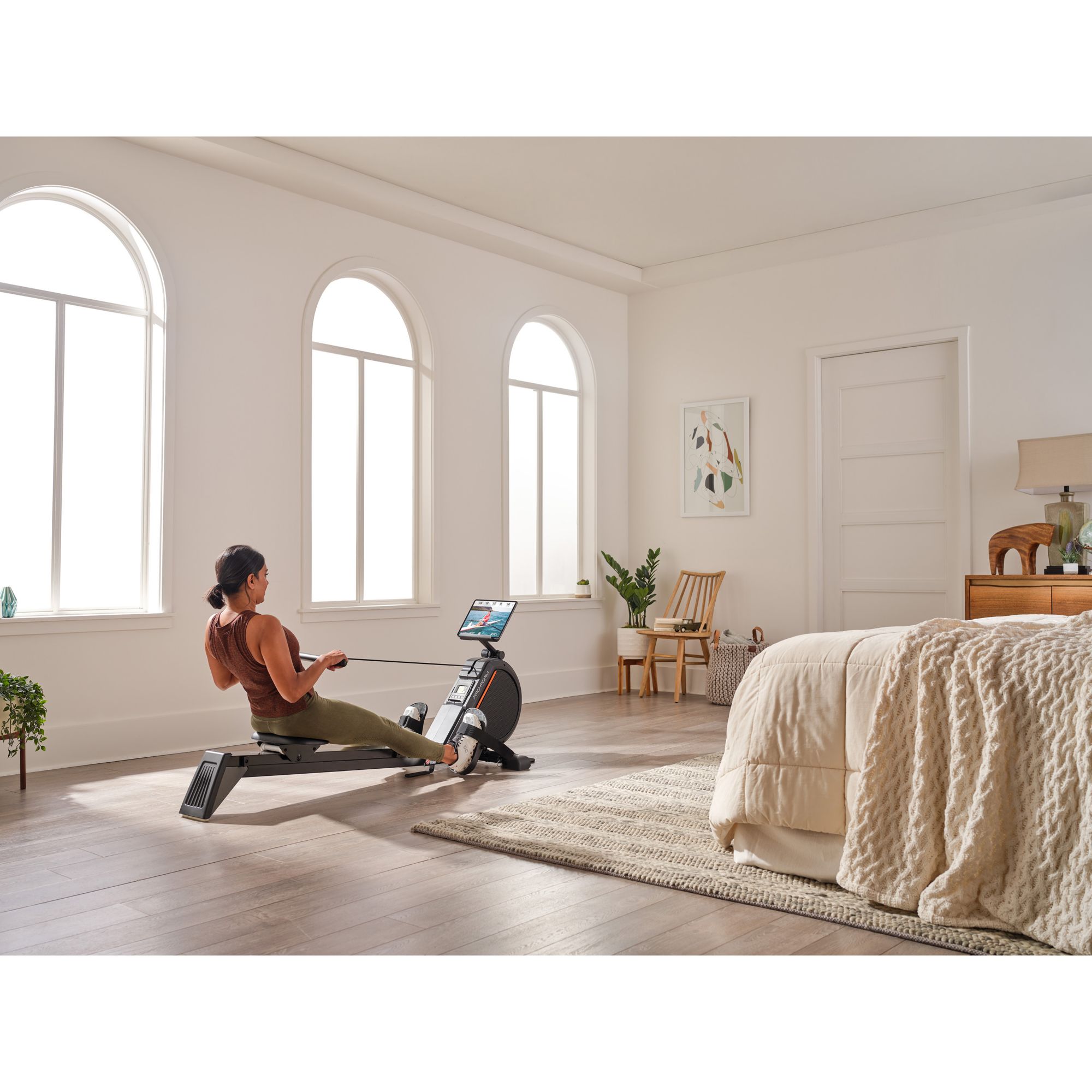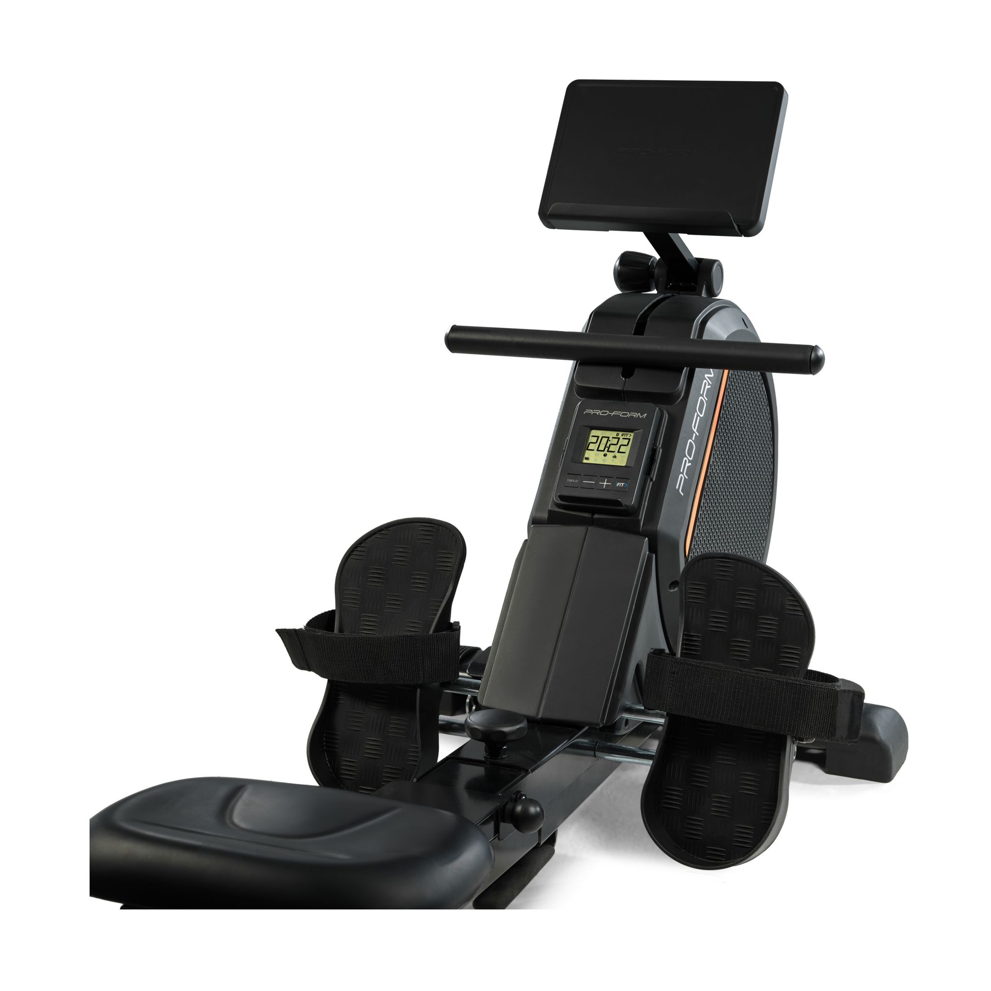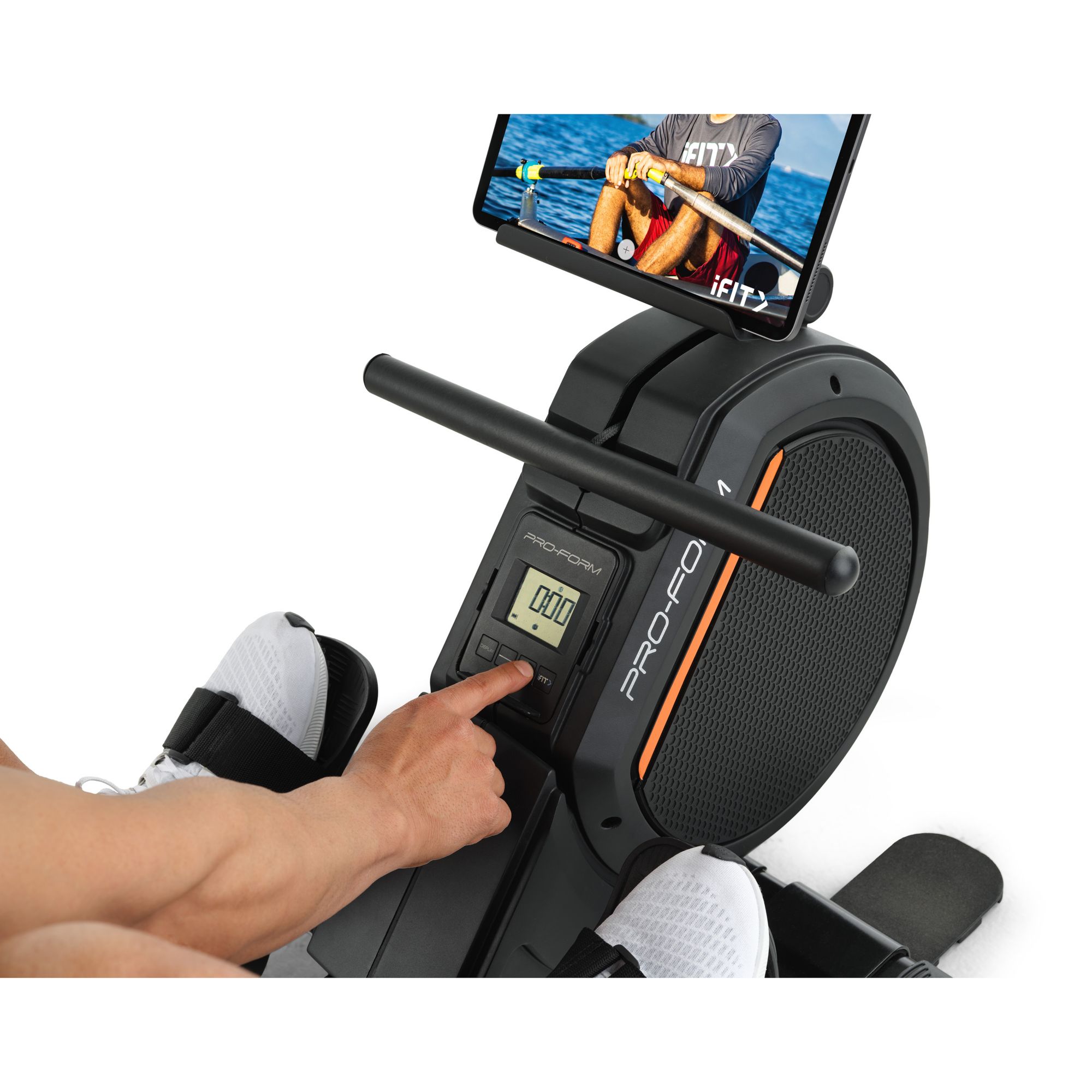 The ProForm 550R Rower combines cardio and strength workouts for an integrated dual-action strength training experience. With eight digital levels of resistance, work your way up as you grow in both strength and stamina. When you’re finished with your workout, simply fold up your rower and store it away to add more living space to your home. For a smoother rowing stroke, this machine uses flywheel resistance which can be good for beginners and intermediate users as the resistance will not change until manually adjusted using the resistance knob. Each level is smooth, frictionless, and silent with the patented SMR Silent Magnetic Resistance. Keep your own device within reach on the built-in tablet holder. Remember to pair your rower with the iFit app via Bluetooth to virtually row in some of the world’s most beautiful locations alongside the world’s best trainers. For added stability and durability, this smooth seat rail is made out of steel. Work out in comfort with this cushioned seat, whuich can be adjusted for the perfect fit. Designed to keep your feet in place, these footrests are built with adjustable straps to increase stability. This non-slip handle is ergonomically designed to cut down on fatigue and offer a comfortable workout experience with added padding. Making it easy to reposition your bike, these front-mounted transport wheels allow you to easily move your bike to the location of your choice. This rower folds up and out of the way when you’re done with your workout. Track all of your important workout stats on this easy-to-read display. For more in-depth metrics, visit the iFit app on your smartphone or tablet (not included). The built-in power meter displays your readouts on the screen so you know when to pick up the pace or slow it down.