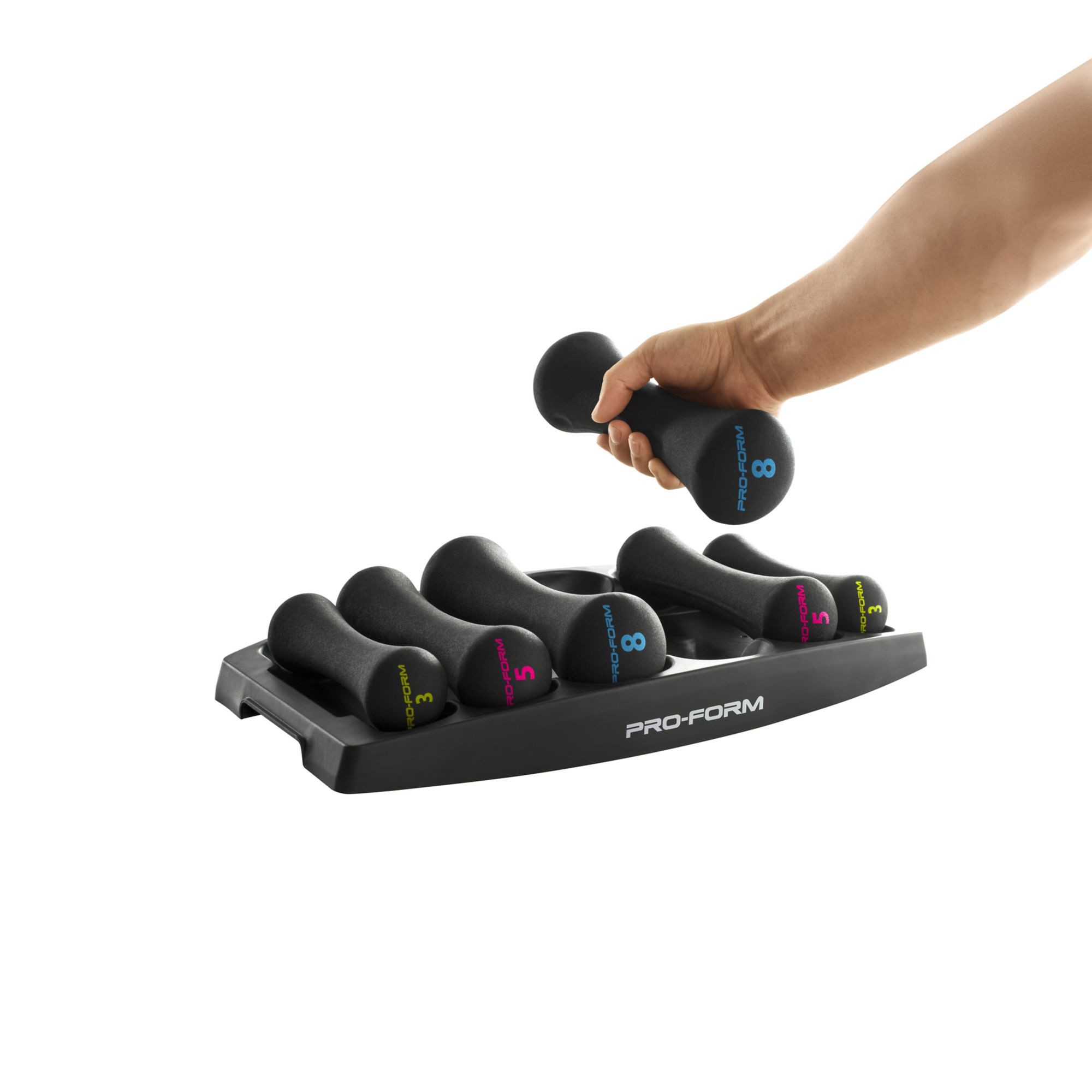 Switch up your fitness routine with this ProForm 6-Pc. Dumbbell Kit. Designed to help you build and tone muscles, this durable set comes with six dumbbells and a storage tray. It includes a DVD and exercise chart.