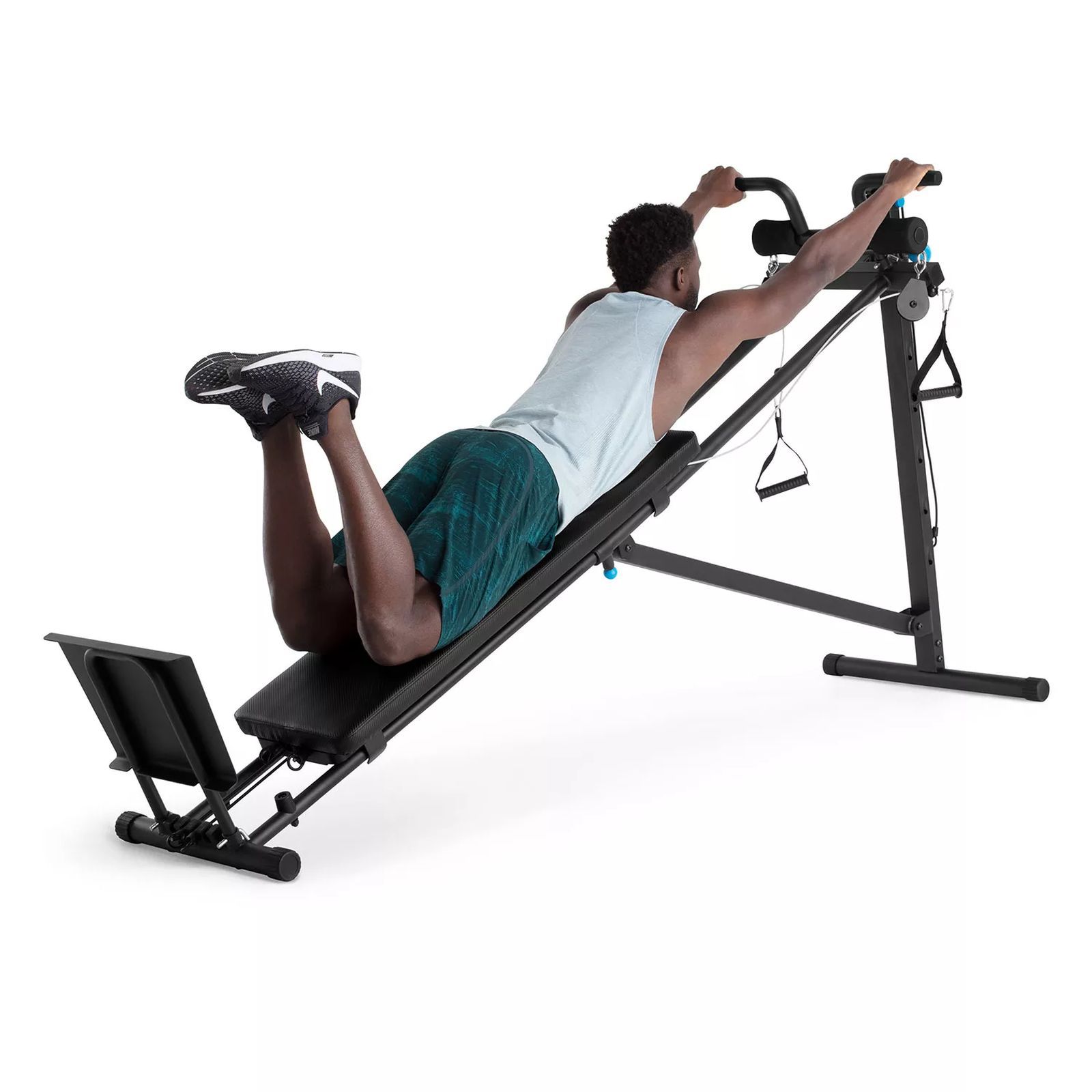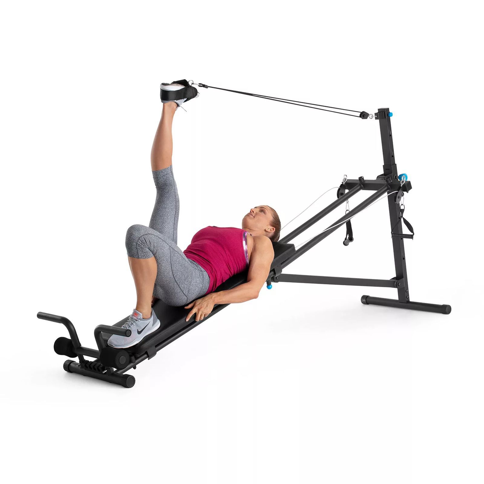 Perform a variety of exercises that target muscle groups across your entire body - a high-pulley system with dual free motion cables allows you to train your lats, back, arms, core, and legs, all with one innovative piece of equipment. A telescoping design allows you to easily slide the Ultimate Body Works into itself for a greatly reduced product footprint, or to fully extend the frame so that tall users can experience a comfortable workout.