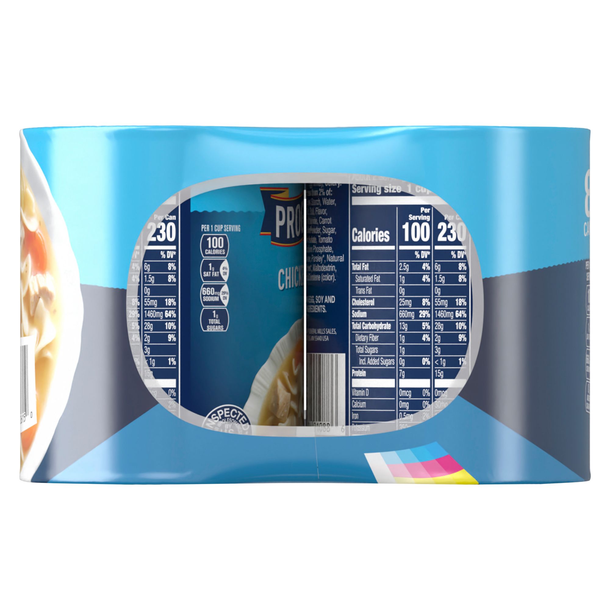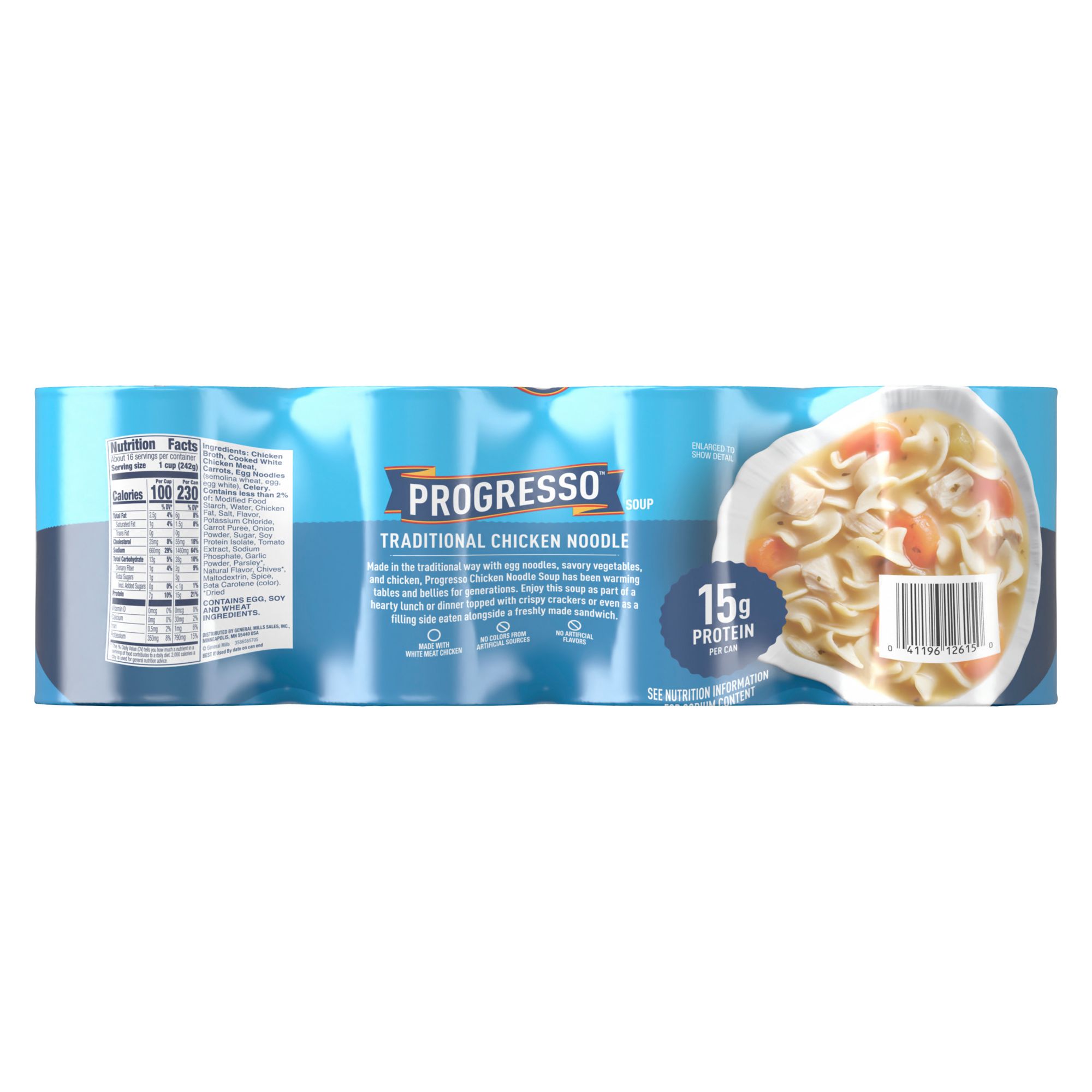 Enjoy your favorite comfort food with Progresso Traditional Chicken Noodle Soup and stock up with these 8 packs so you never run out when you need it. Made with delicious egg noodles, carrots, celery, and antibiotic-free white chicken meat, your appetite will be pleased with this tasty traditional chicken noodle soup. No water needed, just open the can, and warm in a microwave-safe bowl or simmer on the stovetop and enjoy. Flavorful and simple to prep so you can spend more time enjoying and less time preparing.