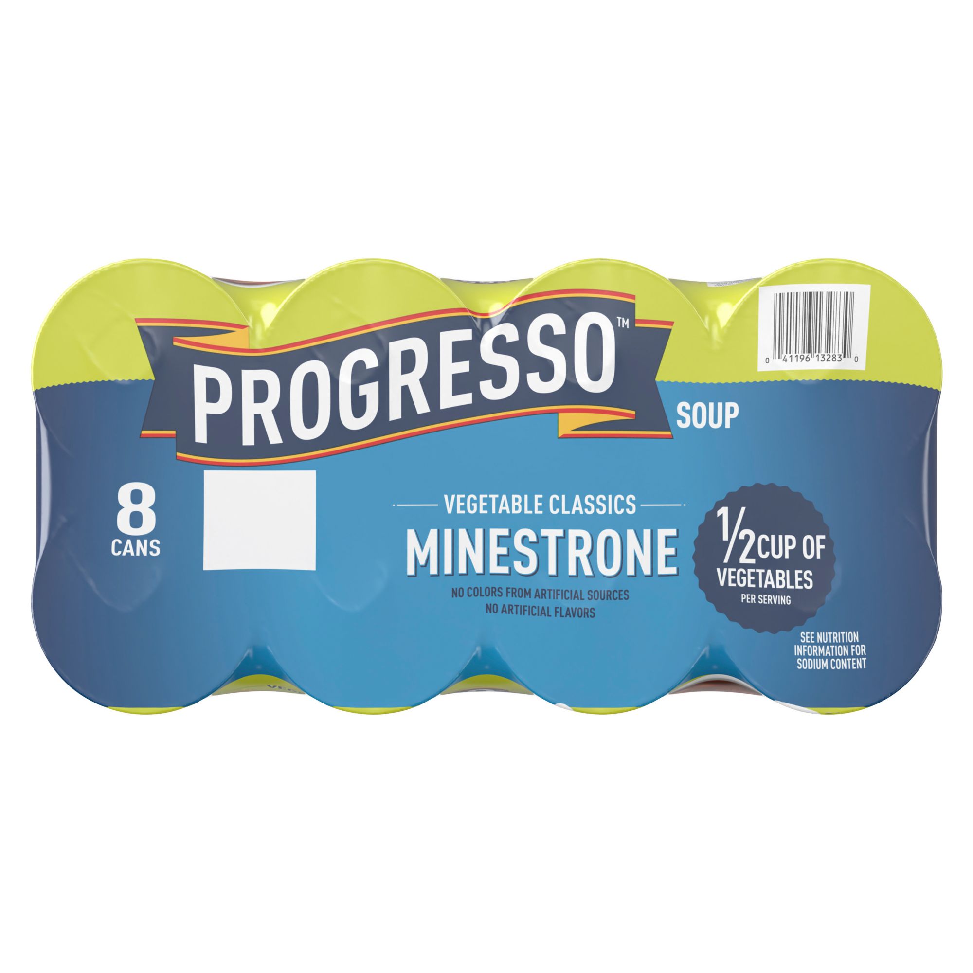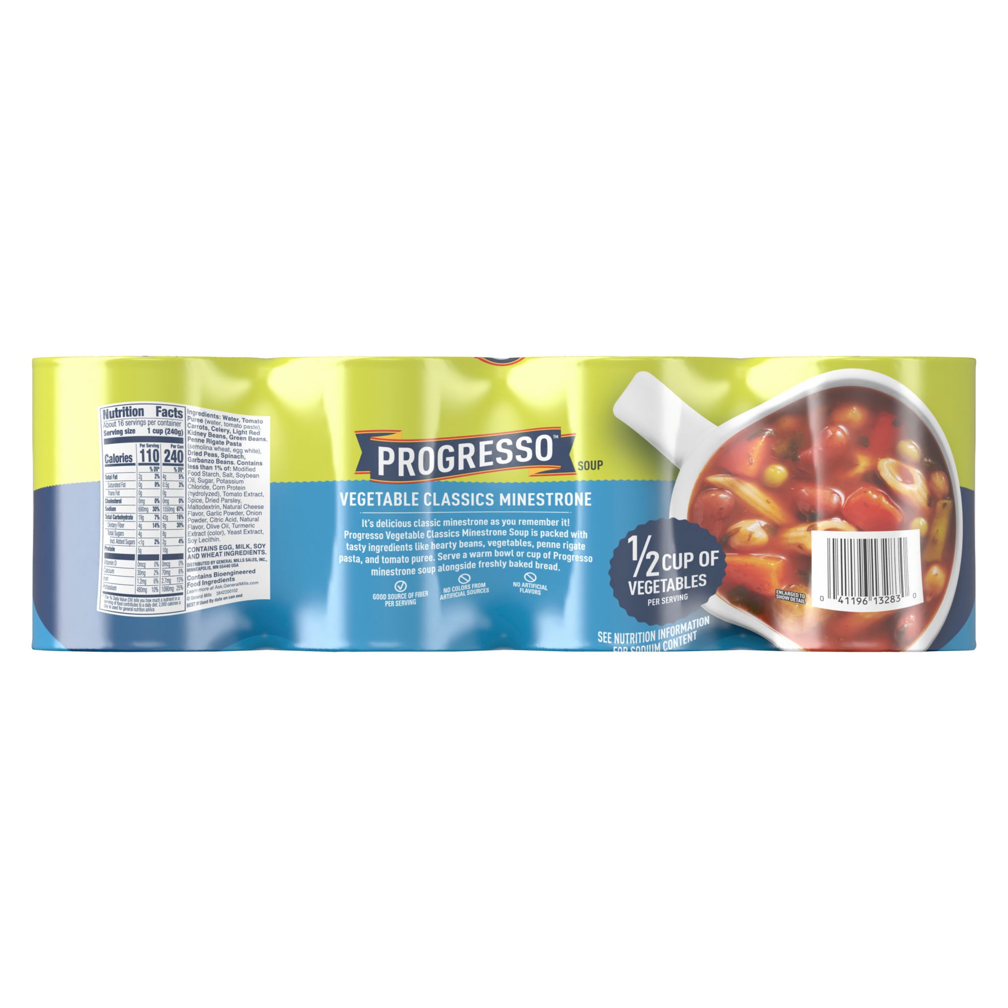 Progresso Ready to Serve Vegetarian Classics Minestrone Soup is packed with hearty beans and Penne Rigate pasta. This soup is easy to prepare, just heat up and enjoy. This pack includes eight 19 oz. cans of soup.