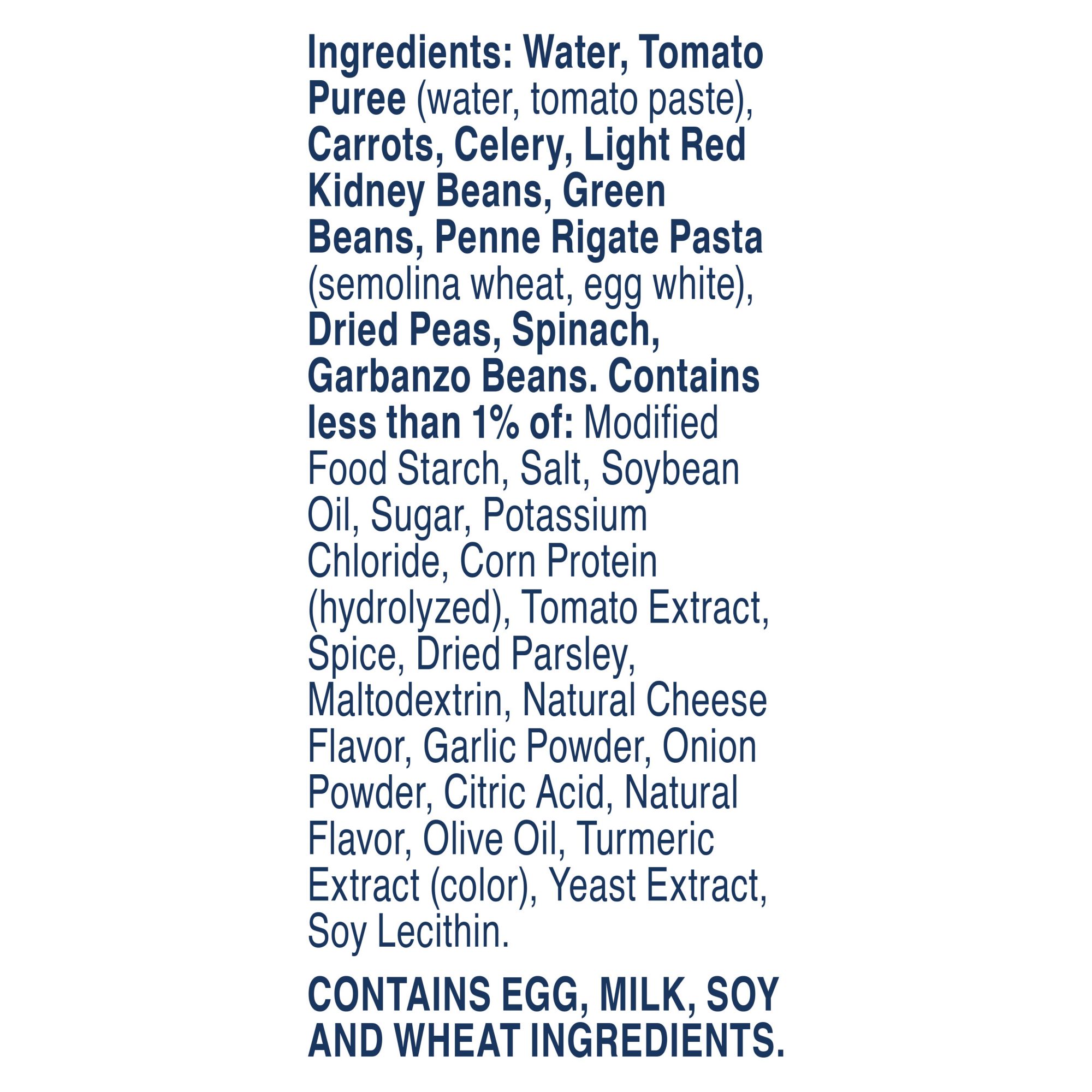 Ingredients: Water, Tomato Paste, Carrots, Celery, Light Red Kidney Beans, Potatoes, Green Beans, Dried Peas, Penne Rigate Pasta (Semolina Wheat, Egg White), Spinach, Garbanzo Beans. Contains Less Than 1% Of: Modified Corn Starch, Salt, Soybean Oil, Sugar, Potassium Chloride, Corn Protein (Hydrolyzed), Tomato Extract, Spice, Dried Parsley, Maltodextrin, Natural Flavor, Citric Acid, Garlic Powder, Olive Oil, Turmeric Extract (Color), Yeast Extract, Soy Lecithin, Nonfat Dried Milk. Contains Eggs, Milk, Soy, And Wheat Ingredient.
