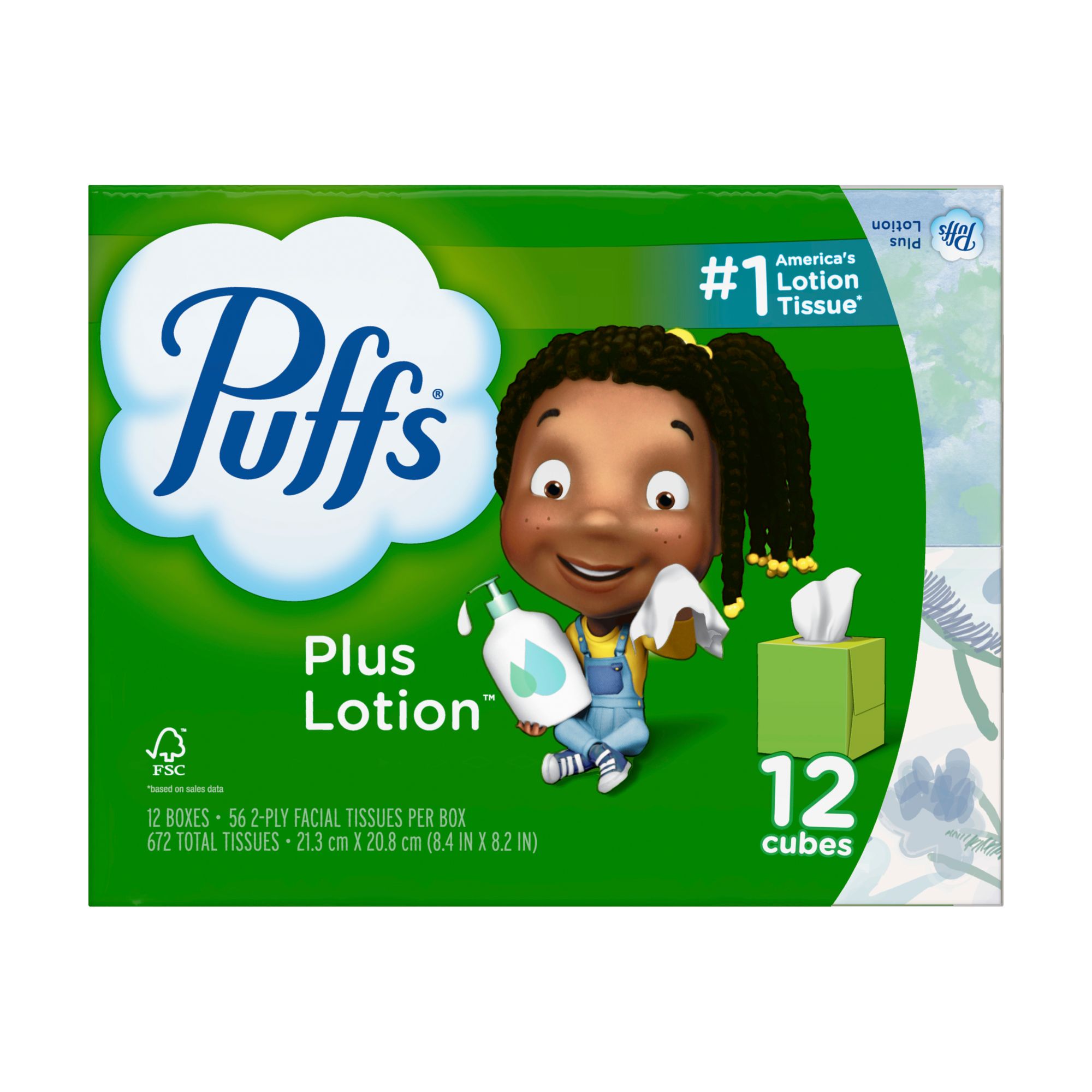 Pack includes 12 cubes (56 tissues per cube) of Puffs Plus Lotion facial tissues