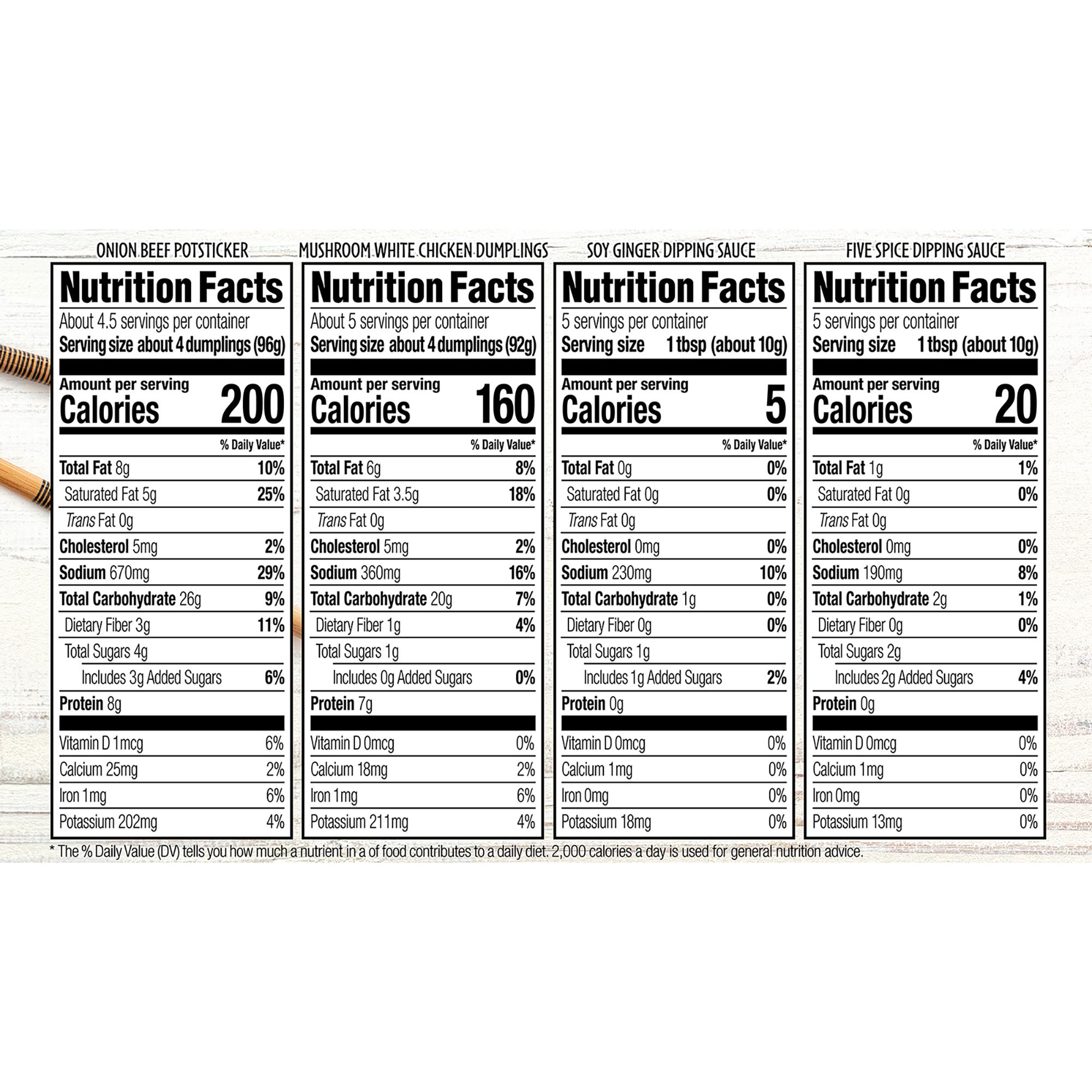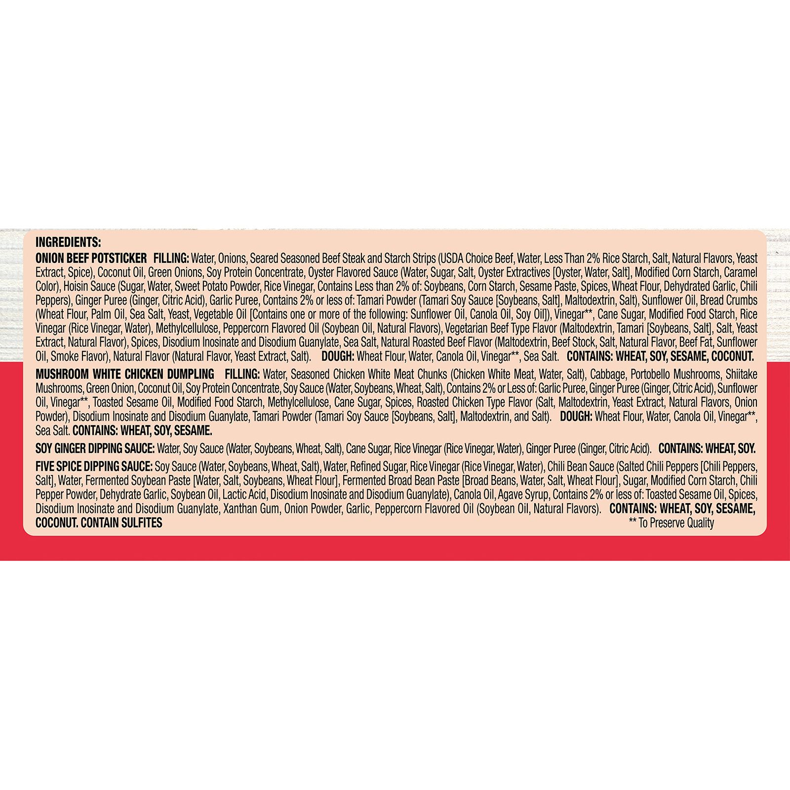 Ingredients: Beef Dumpling: Filling: Wheat Flour 22.6%, Water 21.28%, Onion 12.7%, Seared Seasoned Beef Steak 8.6%, Organic Refined Coconut Oil 5.3%, Organic Green Onion 5.2%, Contains Less Than 5% of The Following: Soy Protein Concentrate, Non-GMO Oyster Sauce [Water, Sugar, Salt, Oyster Extractives (Oyster, Water, Salt), Modified Corn Starch, and Caramel Color], Hoisin Sauce (Sugar, Water, Salt, Sweet Potato Powder, Rice Vinegar, Contains less than 2% of Soybeans, Corn Starch, Sesame Paste, Spices, Wheat Flour, Dehydrated Garlic, Chili Peppers), Ginger Puree, Garlic Puree, Vinegar, Organic Tamari Powder, Organic Sunflower Oil, Cornstarch, Organic Bread Crumbs (Organic Wheat Flour, Organic Expeller Pressed Palm Oil, Sea Salt, Yeast), Organic Cane Sugar, Potato Starch, Rice Vinegar, Methylcellulose, Canola Oil, Sichuan Peppercorn-Flavored Oil (Soybean Oil, Natural Sichuan Peppercorn Flavors), Sea Salt, Organic Vegetarian Beef Flavor, Black Pepper, Flavor Enhancer, Organic Crushed Chili Flakes, Beef Roast Flavor [Organic Maltodextrin, Organic Beef Stock, Salt, Natural Flavor (Organic Natural Flavor, Natural Flavor), Organic Beef Fat, Organic Sunflower Oil, Natural Smoke Flavor], Roasted Beef Flavor (Natural Flavor, Yeast Extract, Salt). Dough: Wheat Flour, Water, Canola Oil, Vinegar (to preserve quality), Sea Salt. CONTAINS: Wheat, Soy, Sesame, Coconut. See Product Spec Reference Tab (3). FILLING RATIO: 68%. Chicken Dumpling: Filling: Wheat Flour 23.9%, Water 21.4%, Seasoned Chicken White Meat 9.3%, Cabbage 9.3%, Shiitake Mushrooms 7.2%, Portobello Mushrooms 7.2%, Organic Green Onion 5.1%, Contains Less Than 5% of The Following: Organic Refined Coconut Oil, Soy Protein Concentrate, Soy Sauce, Less Than 2%: Vinegar, Ginger Puree, Garlic Puree, Organic Sunflower Oil, Potato Starch, Sesame Oil, Methylcellulose, Canola Oil, Organic Cane Sugar, Roasted Chicken Flavor, Sea Salt, Black Pepper, Flavor Enhancer, Organic Tamari Powder, Organic White Pepper. CONTAINS: Wheat, Soy, Sesame. FILLING RATIO: 66%.