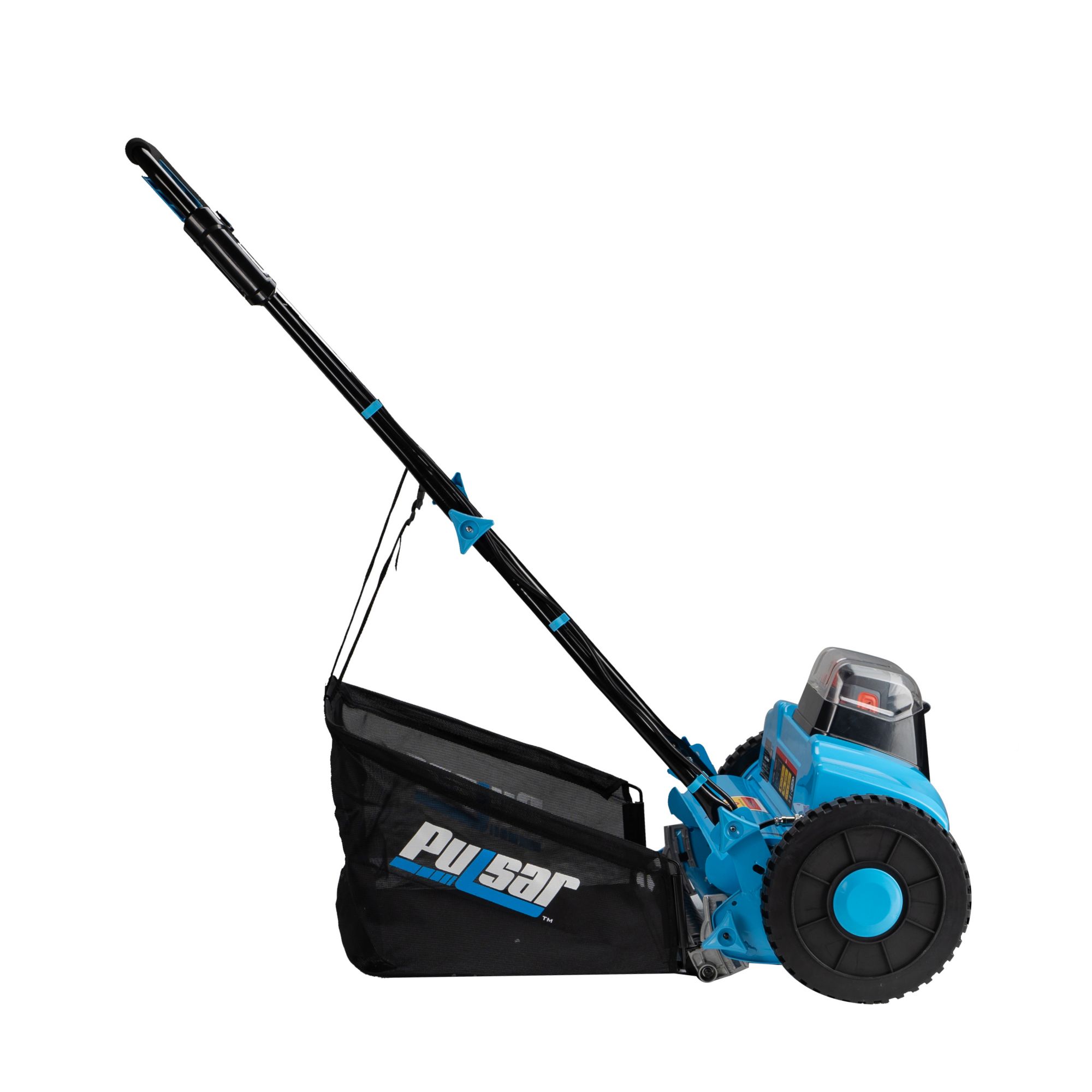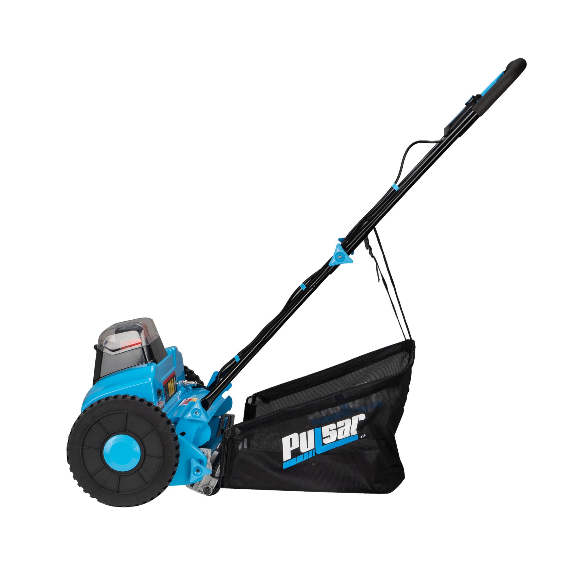 The PTG2216’s 140W motor manicures your lawn in 16" paths, with a cutting height range of .6"-2.15" as it spins the reel at 1000rpm, thereby eliminating the resistance of gear-driven, non-powered mowers to make your job faster, easier, and more efficient on all but the steepest of hills, while the nylon, rear-bag receptor allows for the collection of clippings to give you that manicured look. When you’re done, simply re-charge the battery with the included high-speed charger or use it on Pulsar’s edger/string trimmer, hedger, blower, snow broom, and cultivator, it’s designed to power.