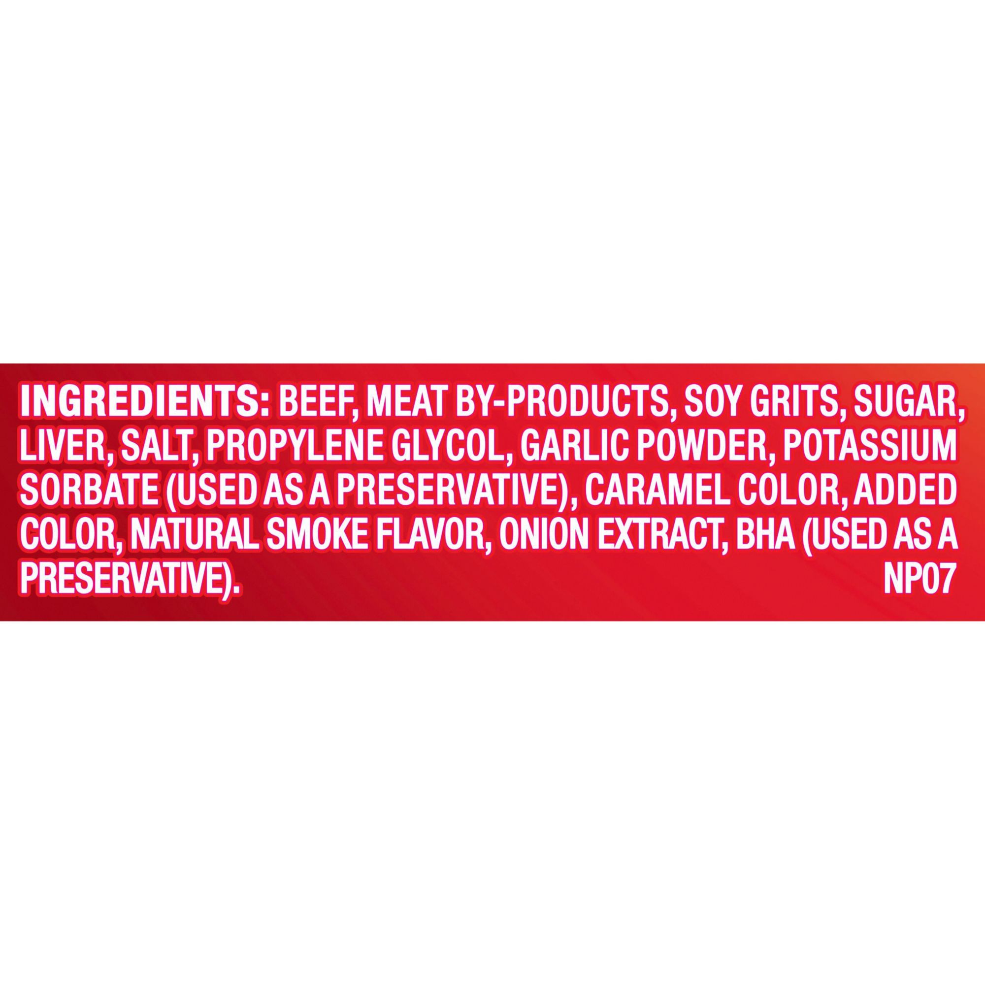 Beef, Soy Grits, Beef Lung, Sugar, Beef Liver, Salt, Vegetable Glycerin, Natural Flavors, Propylene Glycol, Potassium Sorbate (Used as a Preservative), Added Color, Citric Acid (Used as a Preservative), BHA (Used as a Preservative). NP004.