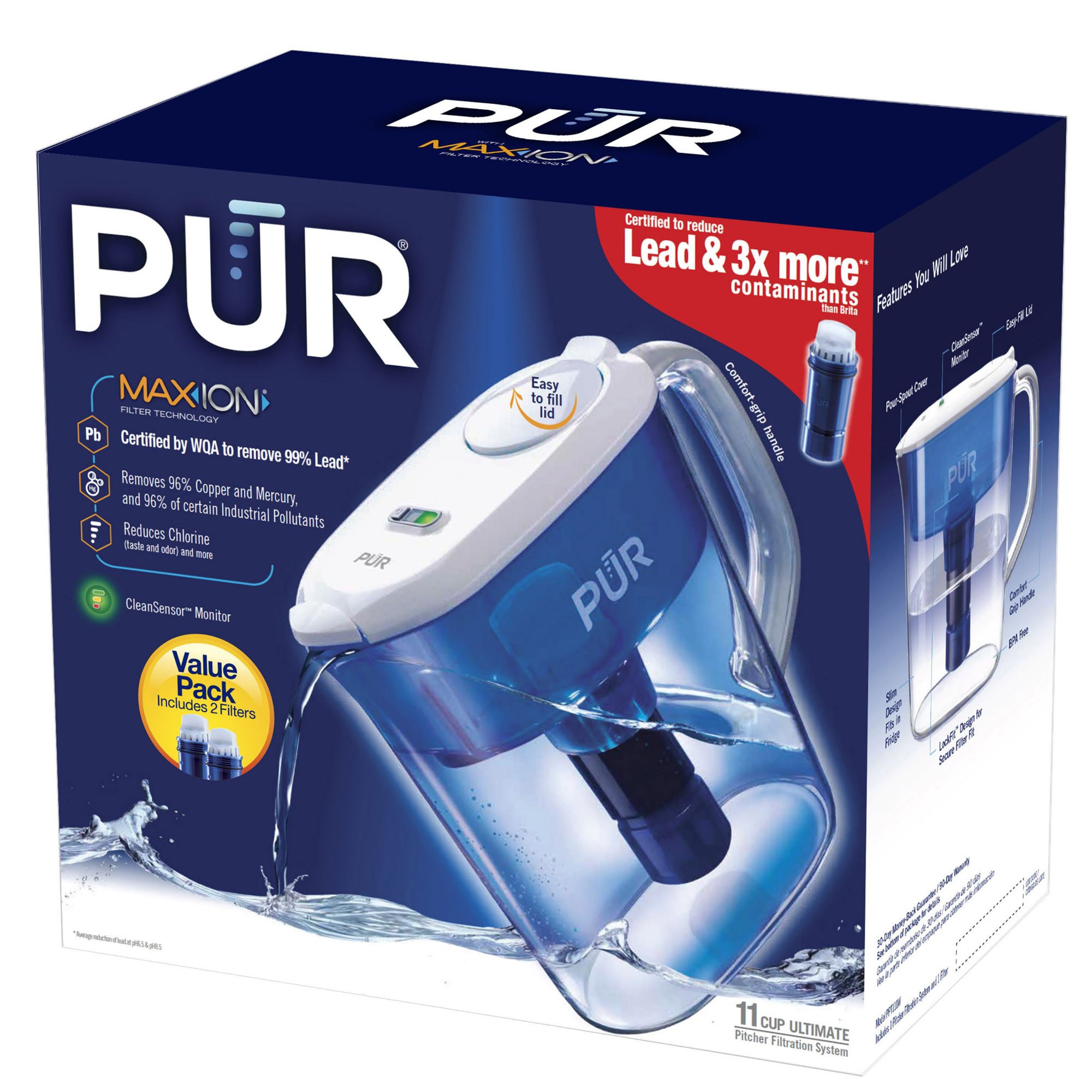 Certified by WQA to remove 99% Lead Removes 96% Mercury and 92% of certain Pesticides Reduces Chlorine (taste and odor) and more 11-cup capacity (each cup equals an 8-oz. glass of water) CleanSensor monitor filter change light tells you when the filter needs to be changed Filters up to 40-gal./640 8-oz. cups per filter, and lasts up to two months Slim, space-saving design fits in the fridge Easy to use with comfort-grip handle and easy-fill lid Pour spout cover prevents odors and particulates from getting into your clean water BPA Free All PUR pitcher filters fit in all PUR pitchers/dispenser Includes PUR Ultimate Water Pitcher and two bonus replacement filters