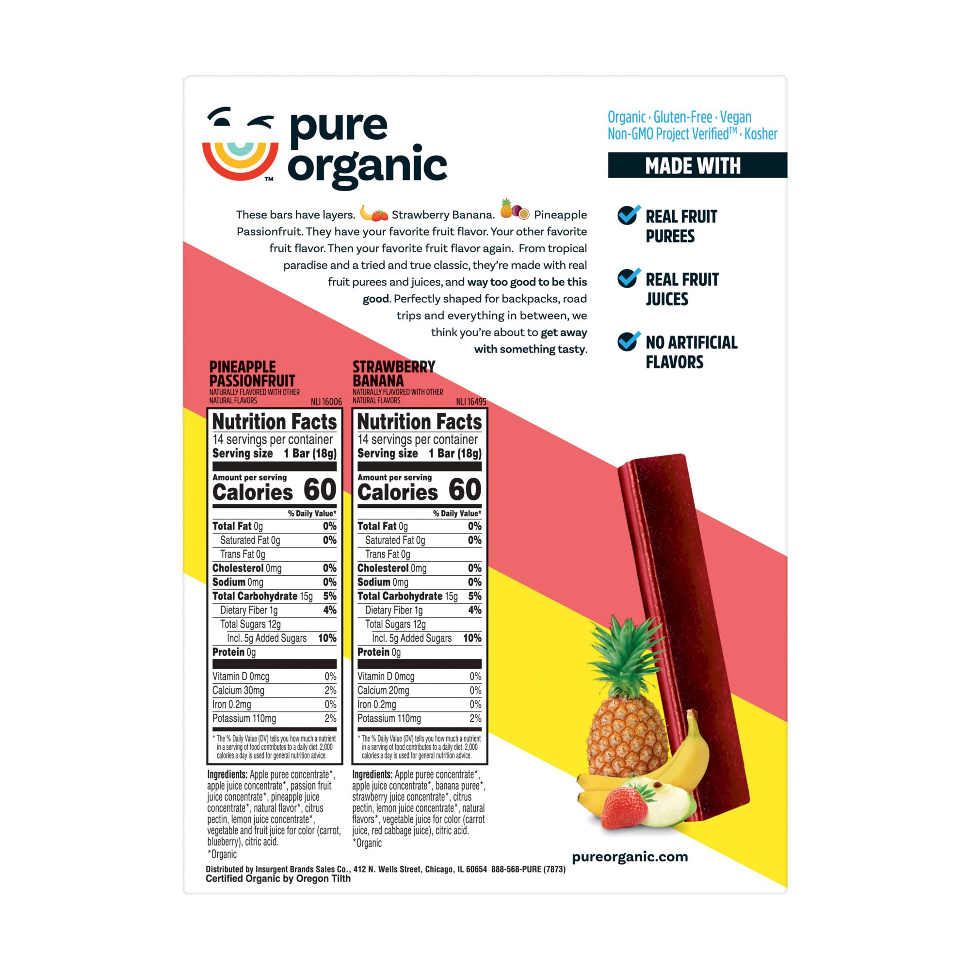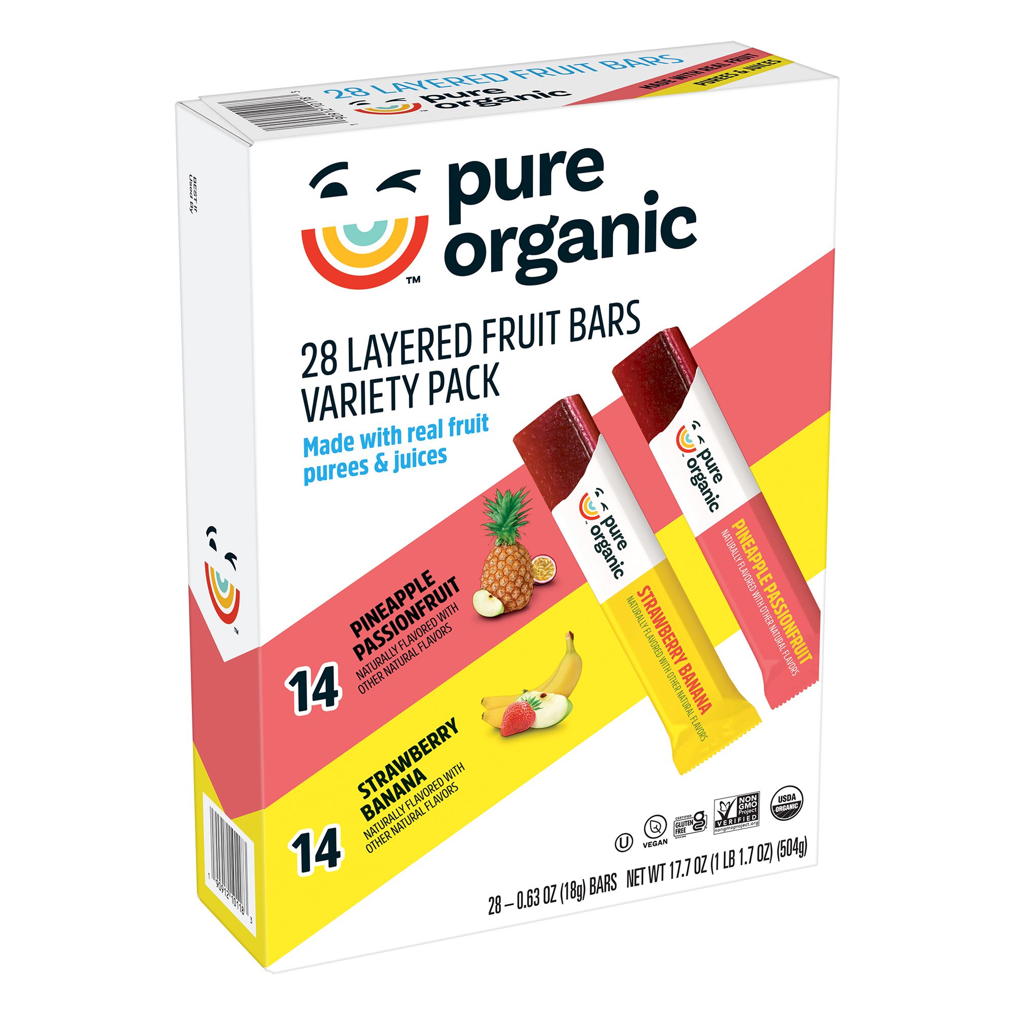Pure Organic Layered Fruit Bars Variety Pack is a multi-pack with two delicious flavors, pineapple passionfruit and strawberry banana. Pure Layered Fruit Bars are certified organic, non GMO, vegan, gluten free, soy free, kosher, and made with fruit purees and juices. They do not use any cane syrups or can sugar, artificial flavors, or colors from artificial sources. Plus, they are produced in a peanut-free facility. These nut-free, triple-layered, organic fruit bars blend complementary flavors like pineapple with passionfruit for a delicious treat.