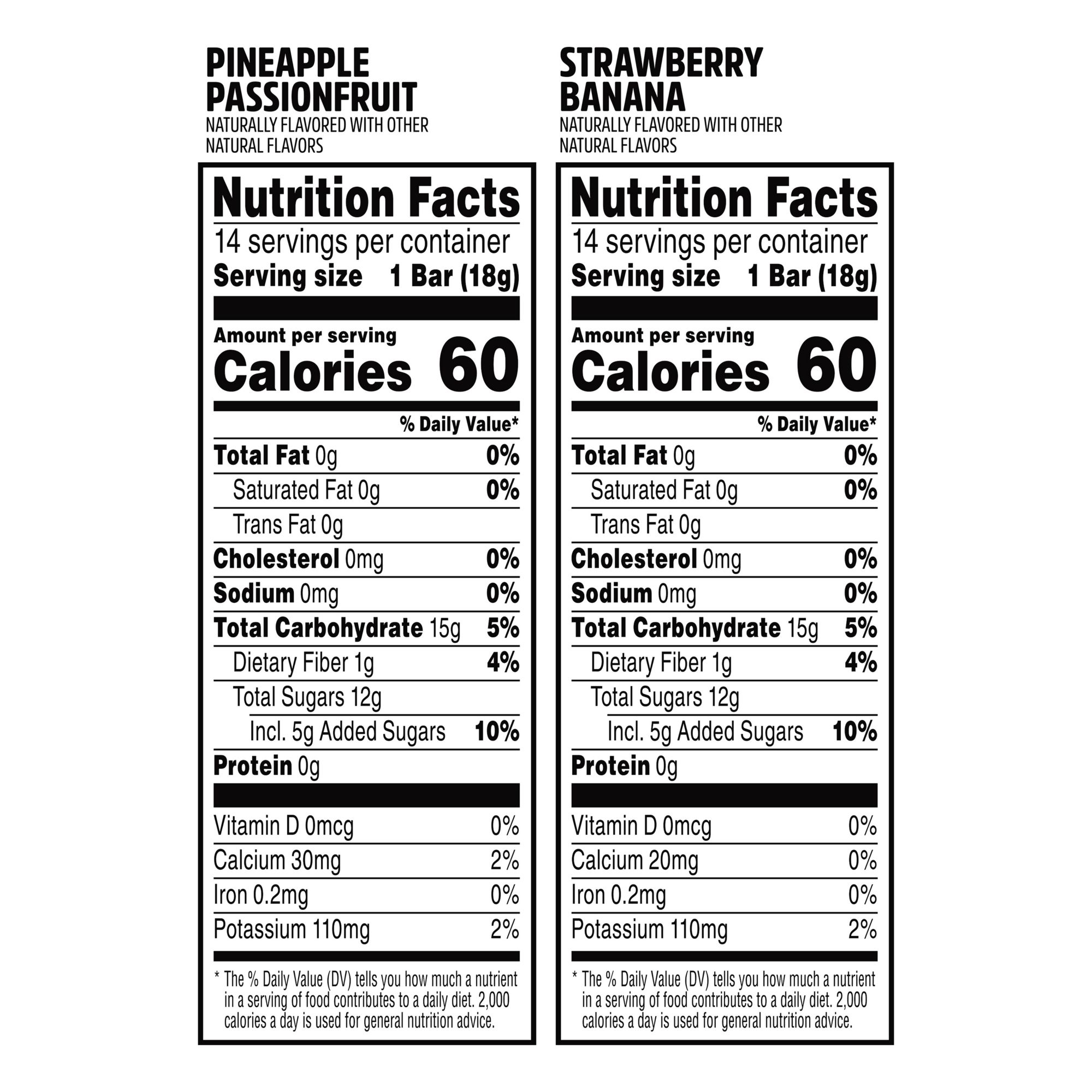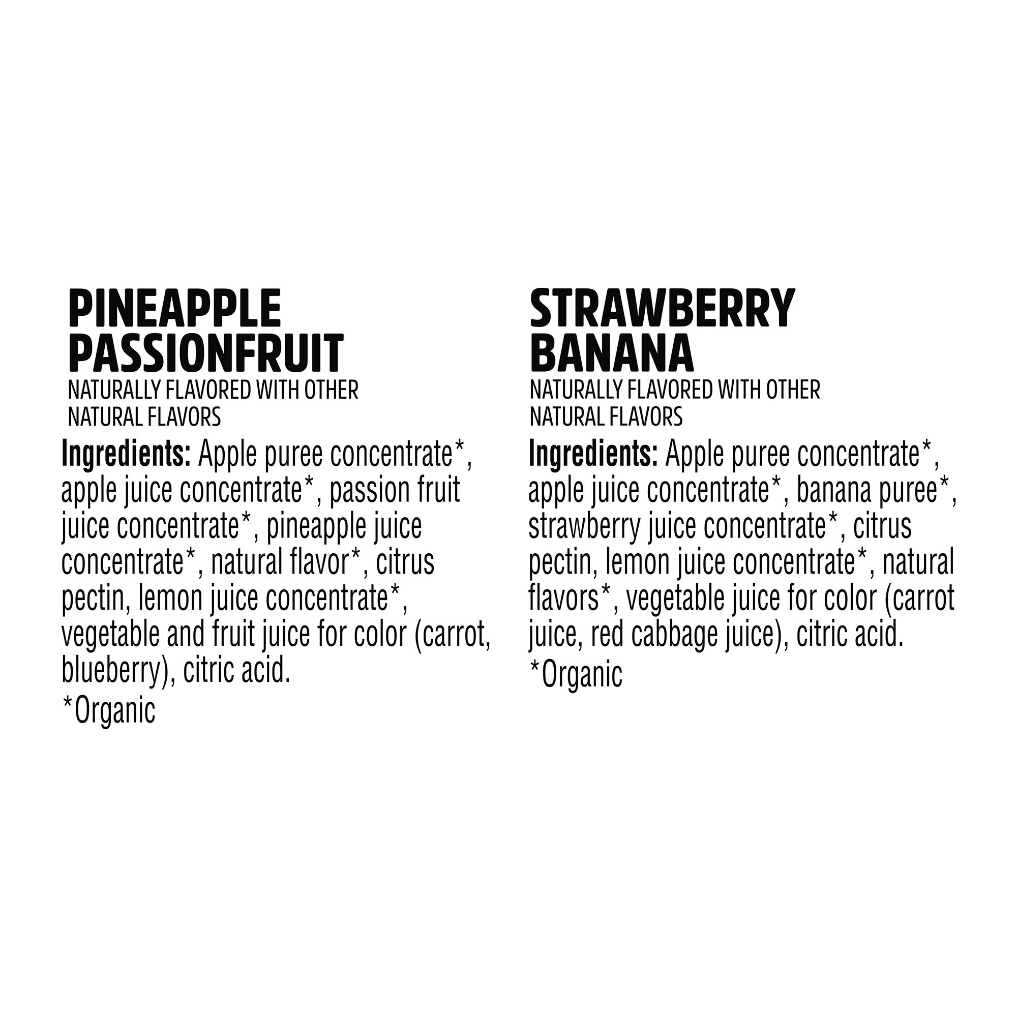 Ingredients: Pineapple Passionfruit: Apple Puree Concentrate*, Apple Juice Concentrate*, Passion Fruit Juice Concentrate*, Pineapple Juice Concentrate*, Natural Flavor*, Citrus Pectin, Lemon Juice Concentrate*, Vegetable And Fruit Juice For Color (Carrot, Blueberry), Citric Acid. Strawberry Banana: Apple Puree Concentrate*, Apple Juice Concentrate*, Banana Puree*, Strawberry Juice Concentrate*, Citurs Pectin*, Lemon Juice Concentrate*, Natural Flavors*, Vegetable Juice For Color (Carrot Juice, Red Cabbage Juice), Citric Acid. *Organic