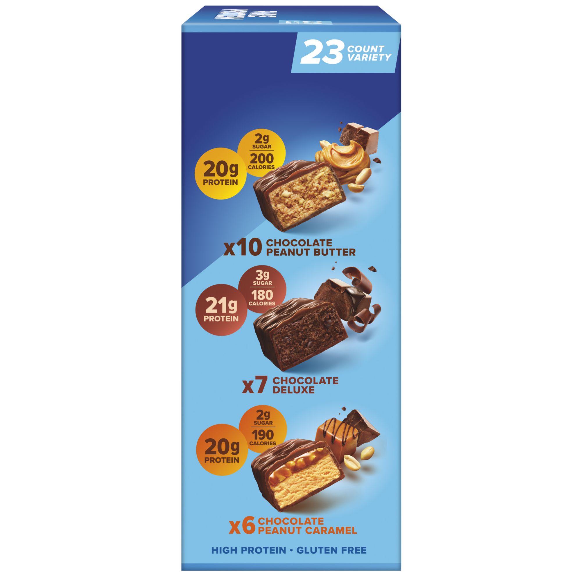Includes variety pack of chocolate protein bars, 23 ct.