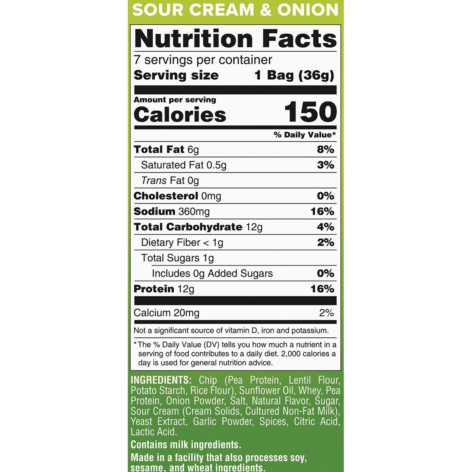 Ingredients: Chip (Pea Protein, Lentil Flour, Potato Starch, Rice Flour, Soy Protein Isolate), Seasoning (Whey Powder, Salt, Buttermilk Powder, Soy Protein Isolate, Dehydrated Onion, Sugar, Maltodextrin, Natural Flavor, Dehydrated Garlic, Parsley, Sour Cream (Cream Solids, Cultured Nonfat Milk), Lactic Acid, Citric Acid, Malic Acid),vegetable Oil (Sunflower, Safflower, Soybean And Or Canola).