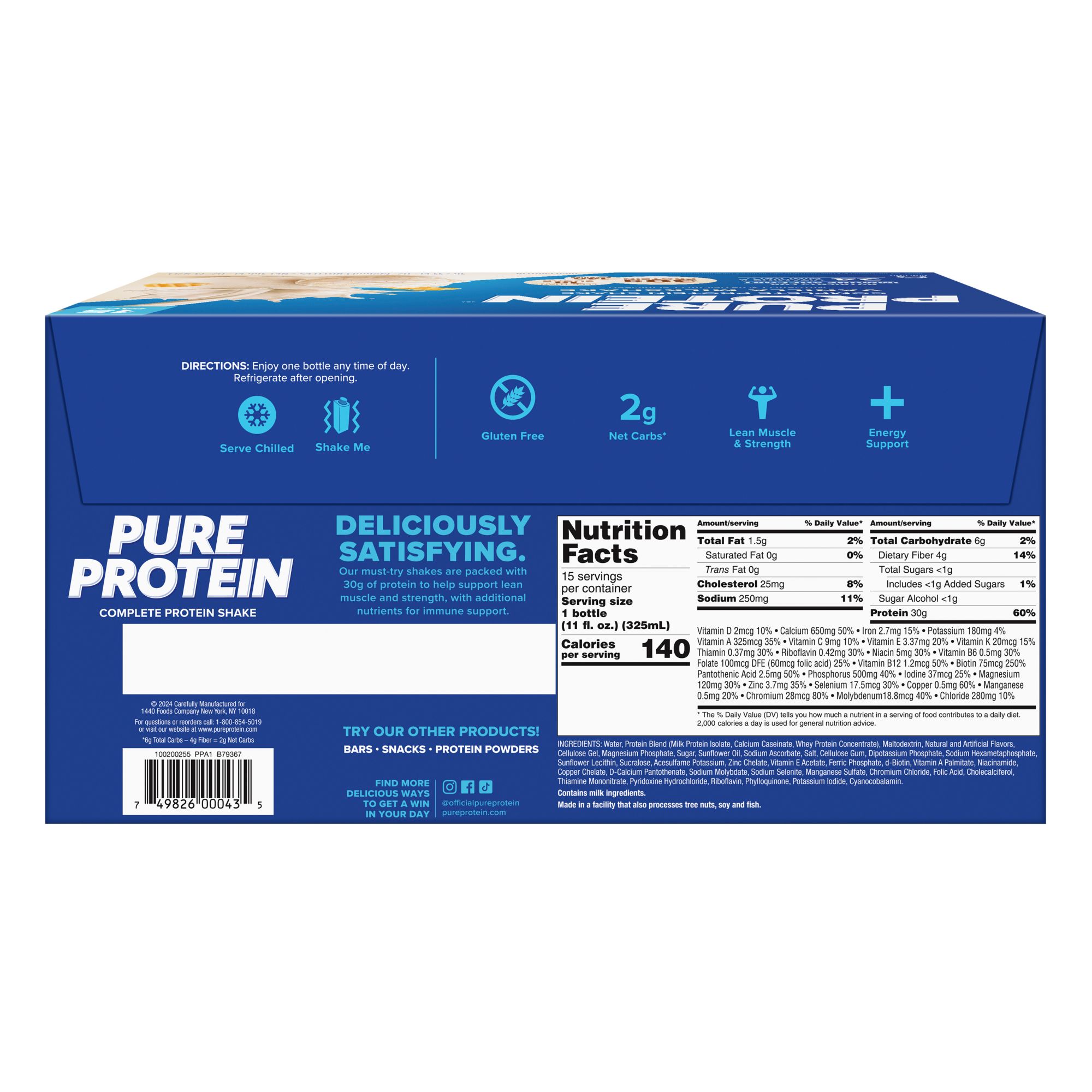 1440 Foods is playing a critical part in unleashing your potential and building a healthier community. Building mental strength that complements the physical. Motivating others to make better choices. To do more, achieve more. Functional is their function, elevating everyday nutrition to feed the body and energize the will. Building an ever-expanding community of engaged health-conscious consumers, spanning forms, need states, and day parts from busy on-the-go nutrition all the way to peak performance. This Pure Protein Shake can help fuel your busy life with 30 grams of protein to support lean muscle and strength and less than 1 g of sugar. The same great protein as the original formula but with added vitamins and minerals, more fiber, protein and more flavor! Enjoy this rich vanilla shake before or after workouts, or any time of day when you need a nutritious boost. Contains a significant source of Vitamin A, Vitamin C, Vitamin D, and Zinc to Support Immune Health.