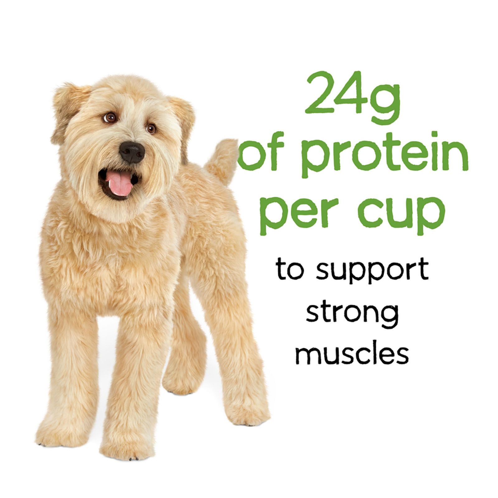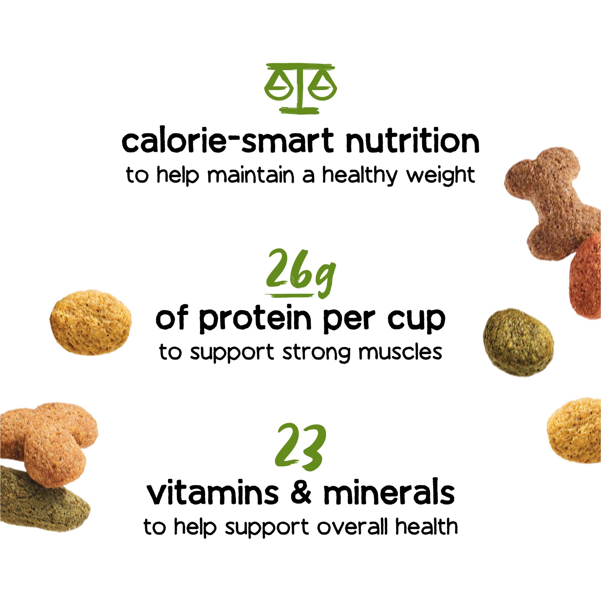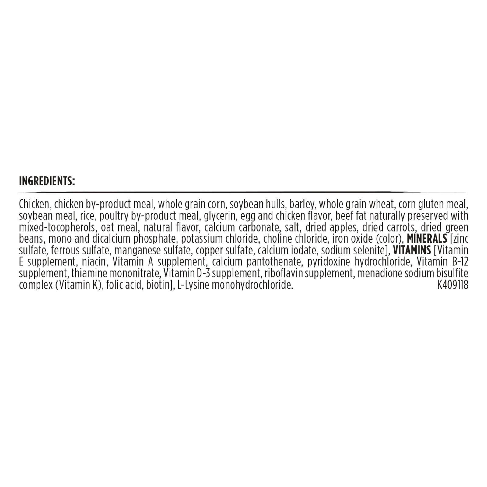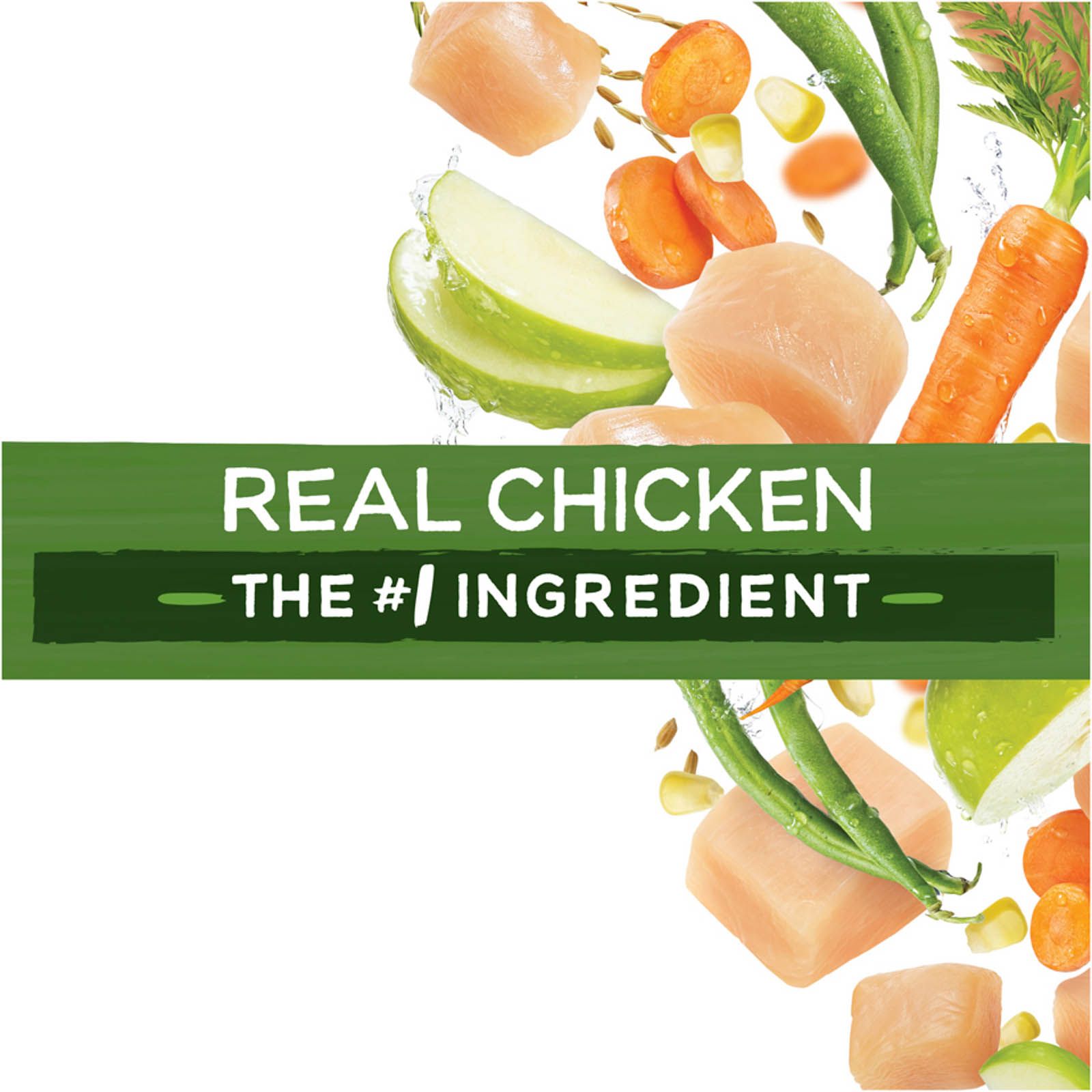 Real farm-raised chicken is the #1 ingredient Accents of real apples, green beans and carrots add variety Calorie-smart nutrition to help maintain a healthy weight Produced in Purina-owned USA facilities to ensure safe, quality food 23 essential vitamins and minerals support overall health An appealing mix of tender and crunchy bites 24g protein per cup to help maintain strong and lean muscles Product of USA Includes 14 lbs. adult dog dry food with real chicken