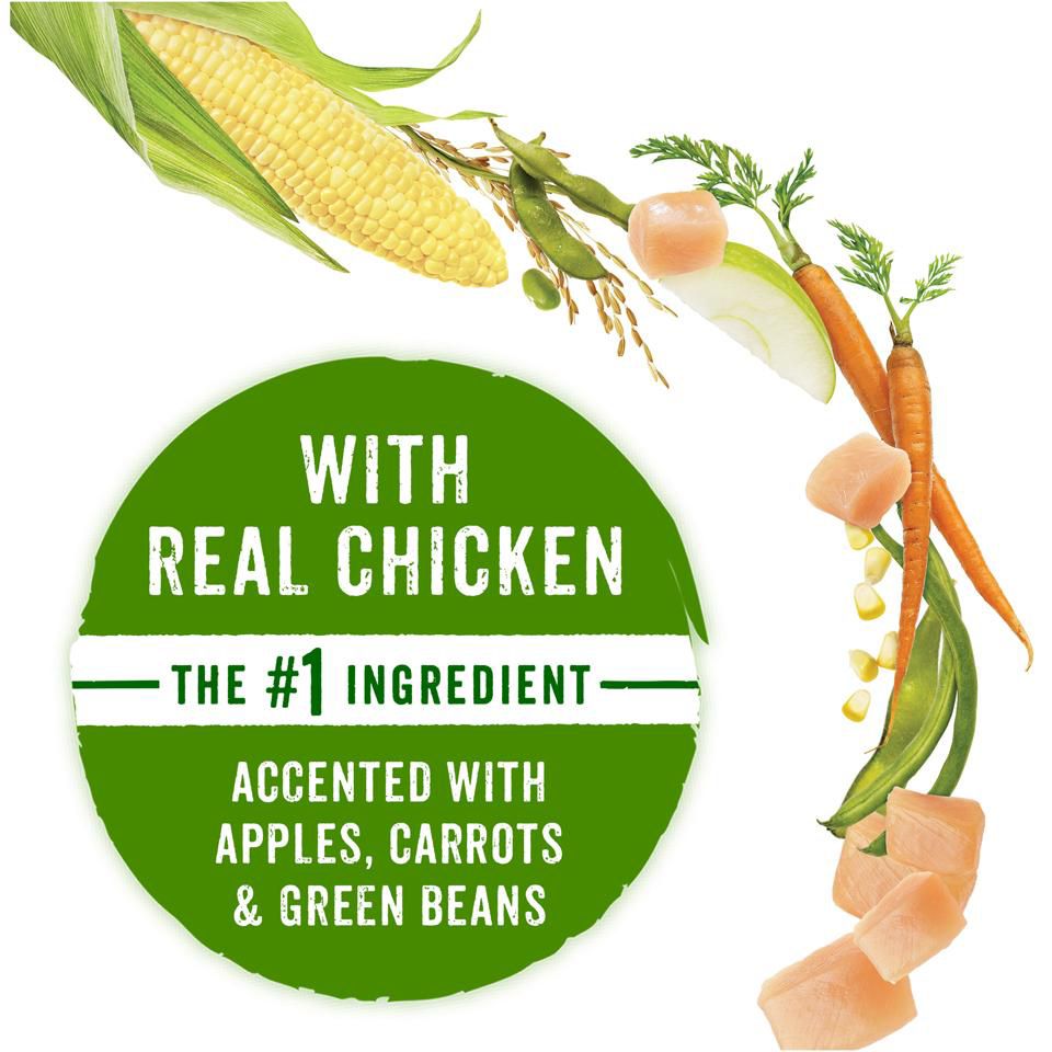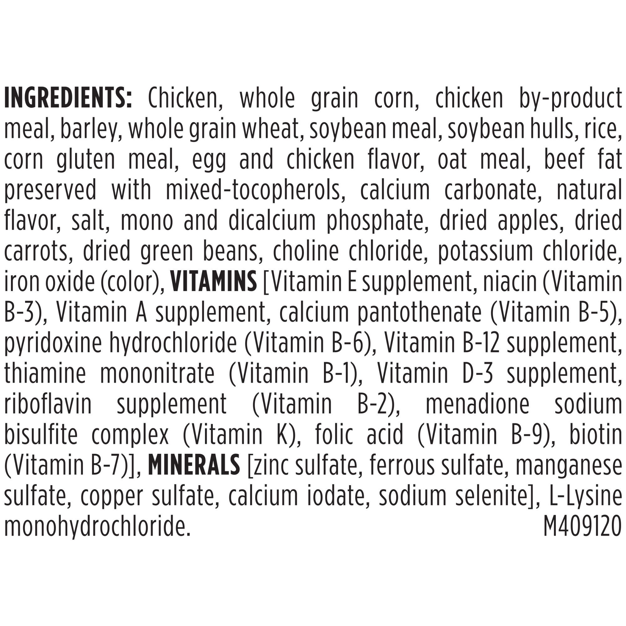 Ingredients: Chicken, Whole Grain Corn, Chicken By-Product Meal, Barley, Whole Grain Wheat, Soybean Meal, Soybean Hulls, Rice, Corn Protein Meal, Egg And Chicken Flavor, Oat Meal, Beef Fat Preserved With Mixed-Tocopherols, Natural Flavor, Calcium Carbonate, Mono And Dicalcium Phosphate, Glycerin, Dried Apples, Dried Carrots, Dried Green Beans, Salt, Annatto Color, Vegetable Juice (Color), Choline Chloride, DL-Methionine, Potassium Chloride, MINERALS [Zinc Sulfate, Ferrous Sulfate, Manganese Sulfate, Copper Sulfate, Calcium Iodate, Sodium Selenite], VITAMINS [Vitamin E Supplement, Niacin (Vitamin B-3), Vitamin A Supplement, Calcium Pantothenate (Vitamin B-5), Thiamine Mononitrate (Vitamin B-1), Pyridoxine Hydrochloride (Vitamin B-6), Riboflavin Supplement (Vitamin B-2), Vitamin B-12 Supplement, Folic Acid (Vitamin B-9), Menadione Sodium Bisulfite Complex (Vitamin K), Biotin (Vitamin B-7), Vitamin D-3 Supplement], Carmine. P409124
